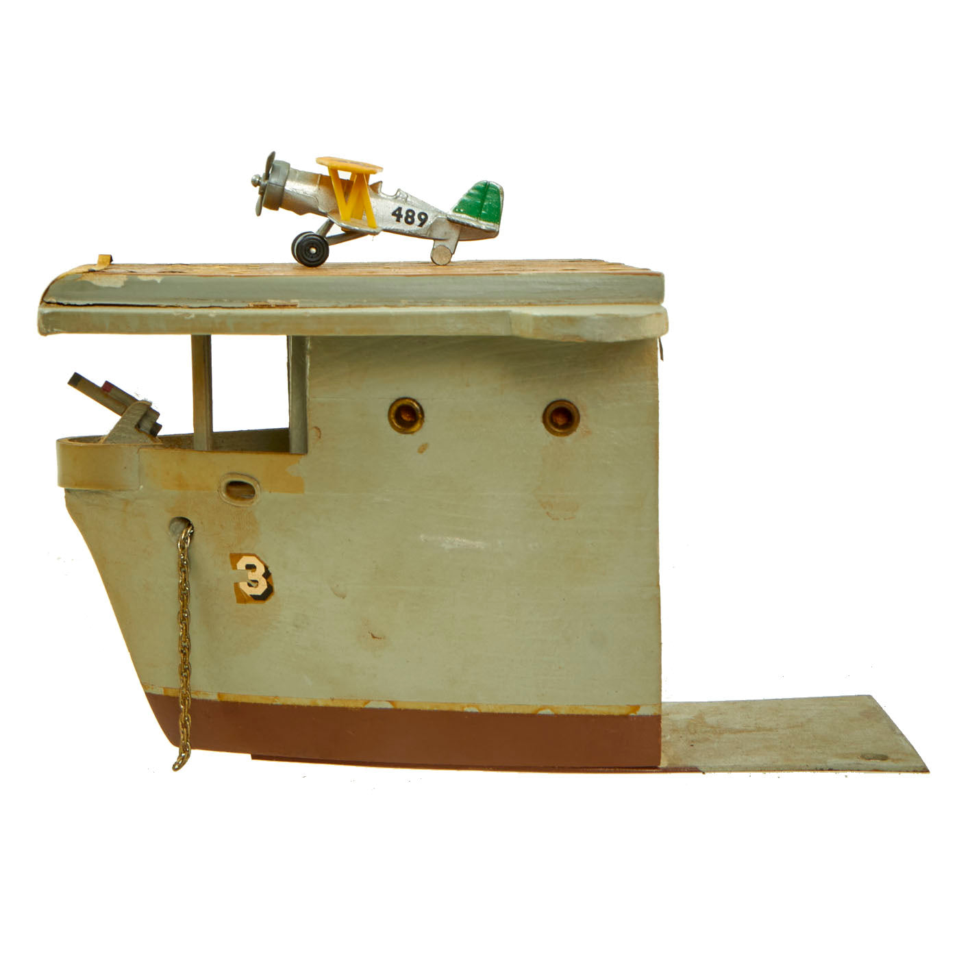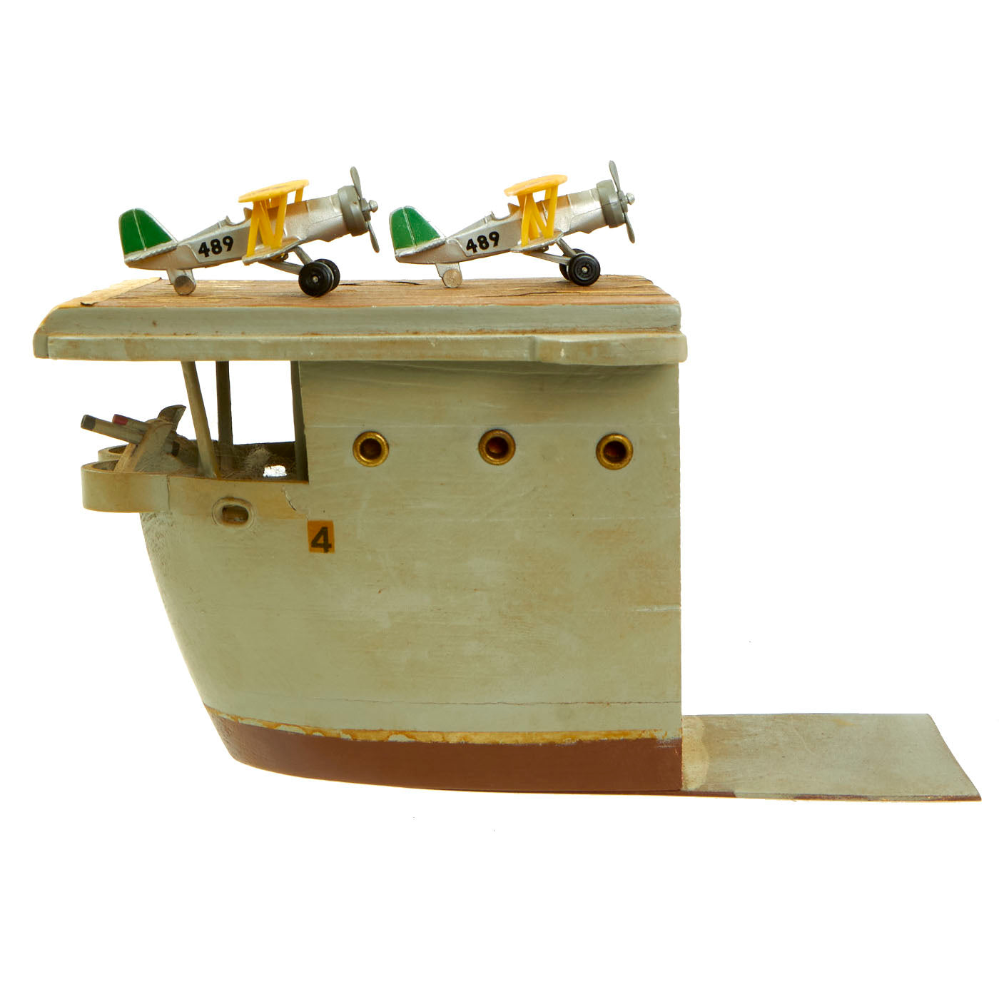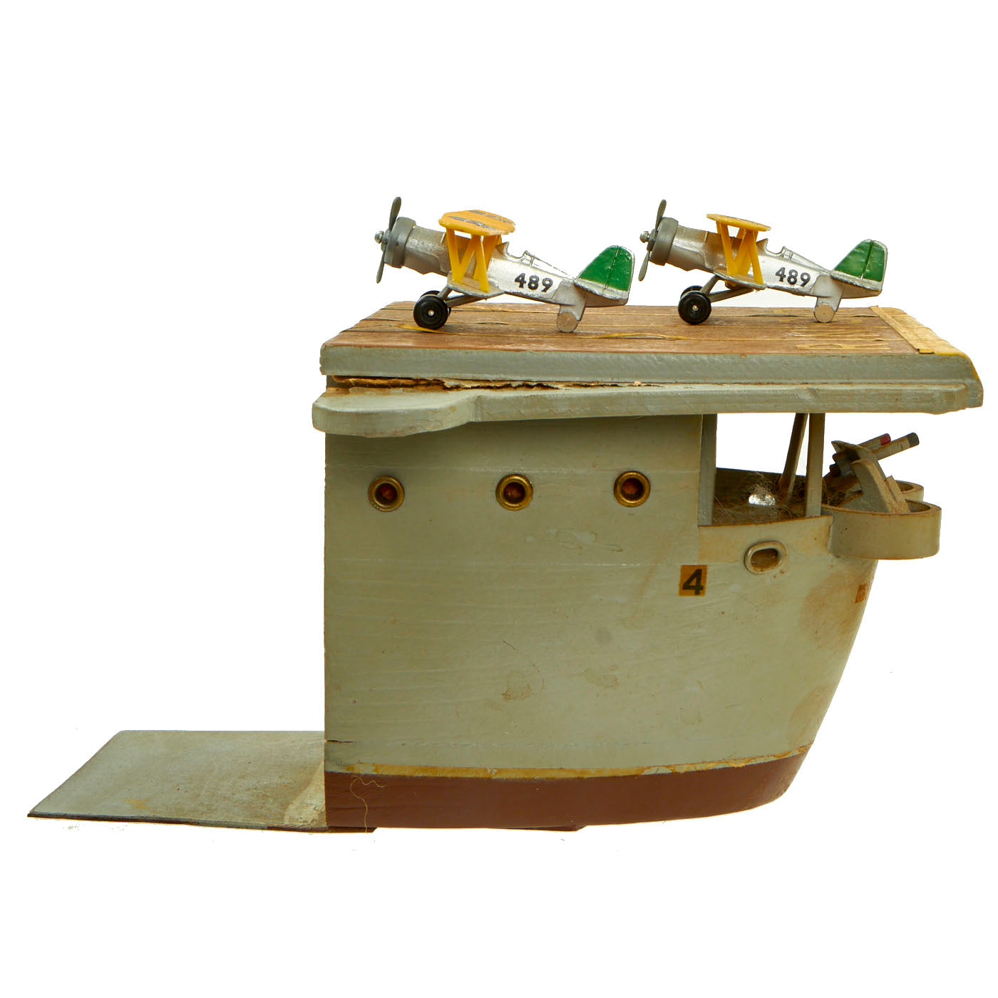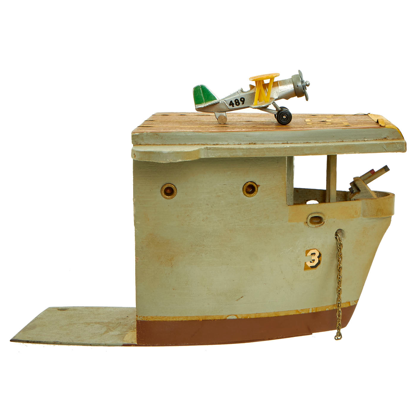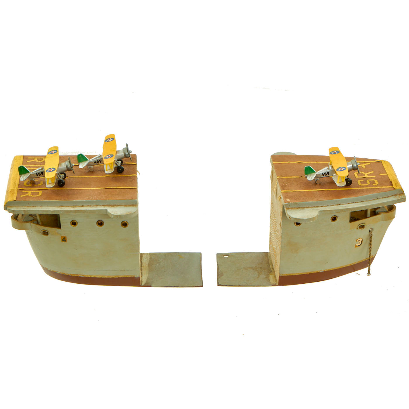 This lovely pair of bookends is definitely classified as being a great example of folk art. Both items are in lovely condition with almost all of the original paint retained. The yellow strips used to mark the tops are unfortunately coming up from the decks of the carriers, but it does not take away from the beauty of them. The 3 aircraft included are a much newer addition to the bookends, but they definitely tie the pieces up!