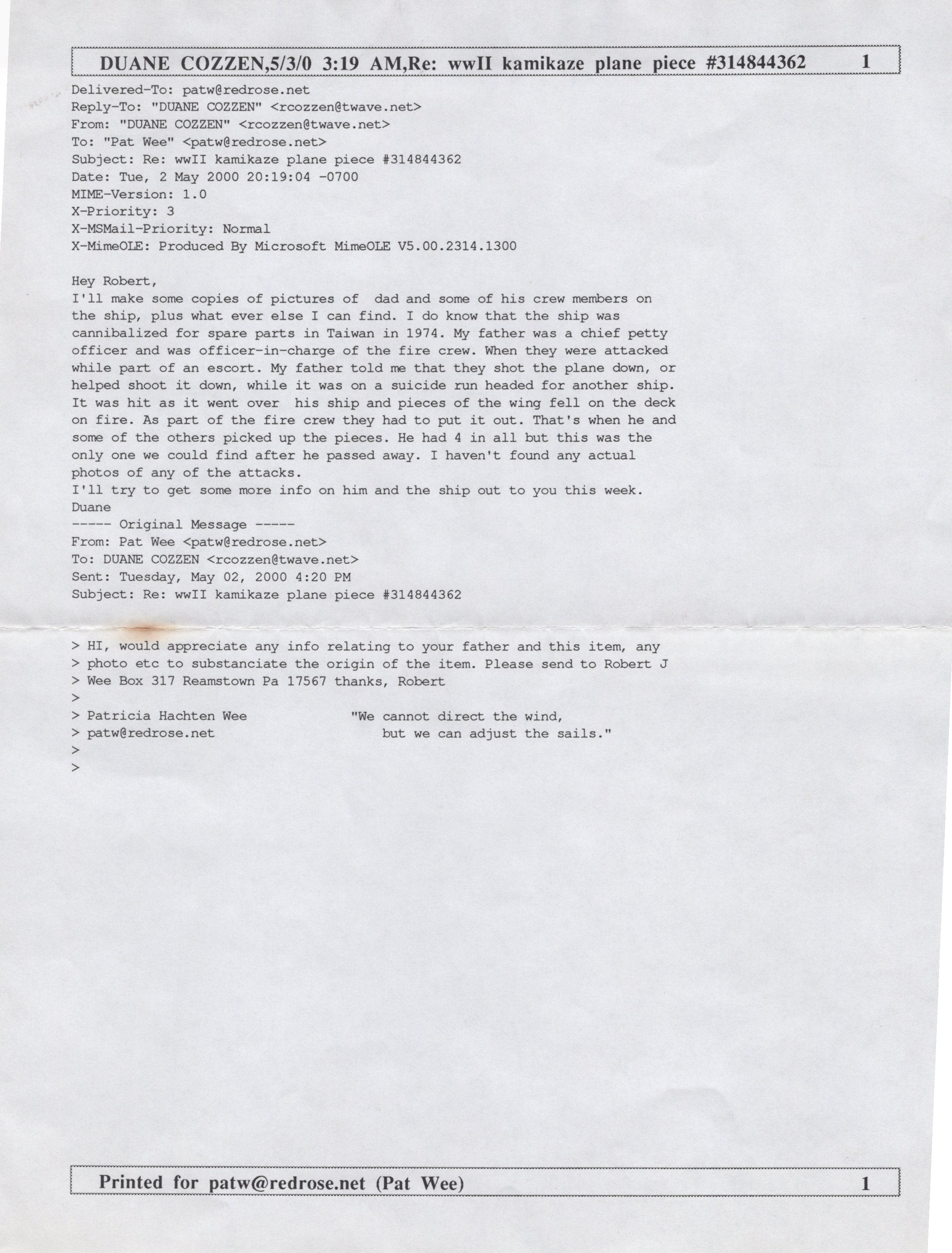 This is a tremendous piece of WWII history, a fragment of a Japanese Kamikaze Zero which was shot down by crew of the USS Lyman K. Swenson. The piece comes with fantastic provenance from the son of the sailor who brought it home, Chief Petty Officer Jack Duane Cozzen. The email notes that “They shot the plane down, or helped shoot it down, while it was on a suicide run headed for another ship. It was hit as it went over his ship and pieces of the wing fell on the deck on fire. As part of the fire crew he had to put it out. That’s when he and some of the others picked up the pieces. He had four in all but this was the only one we could find after he passed away.”