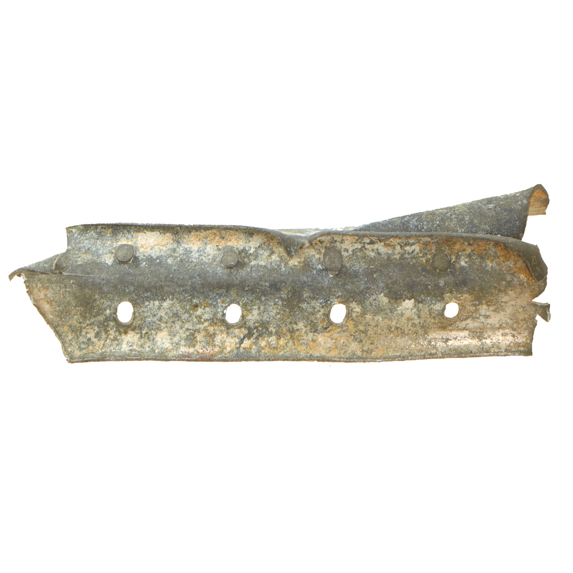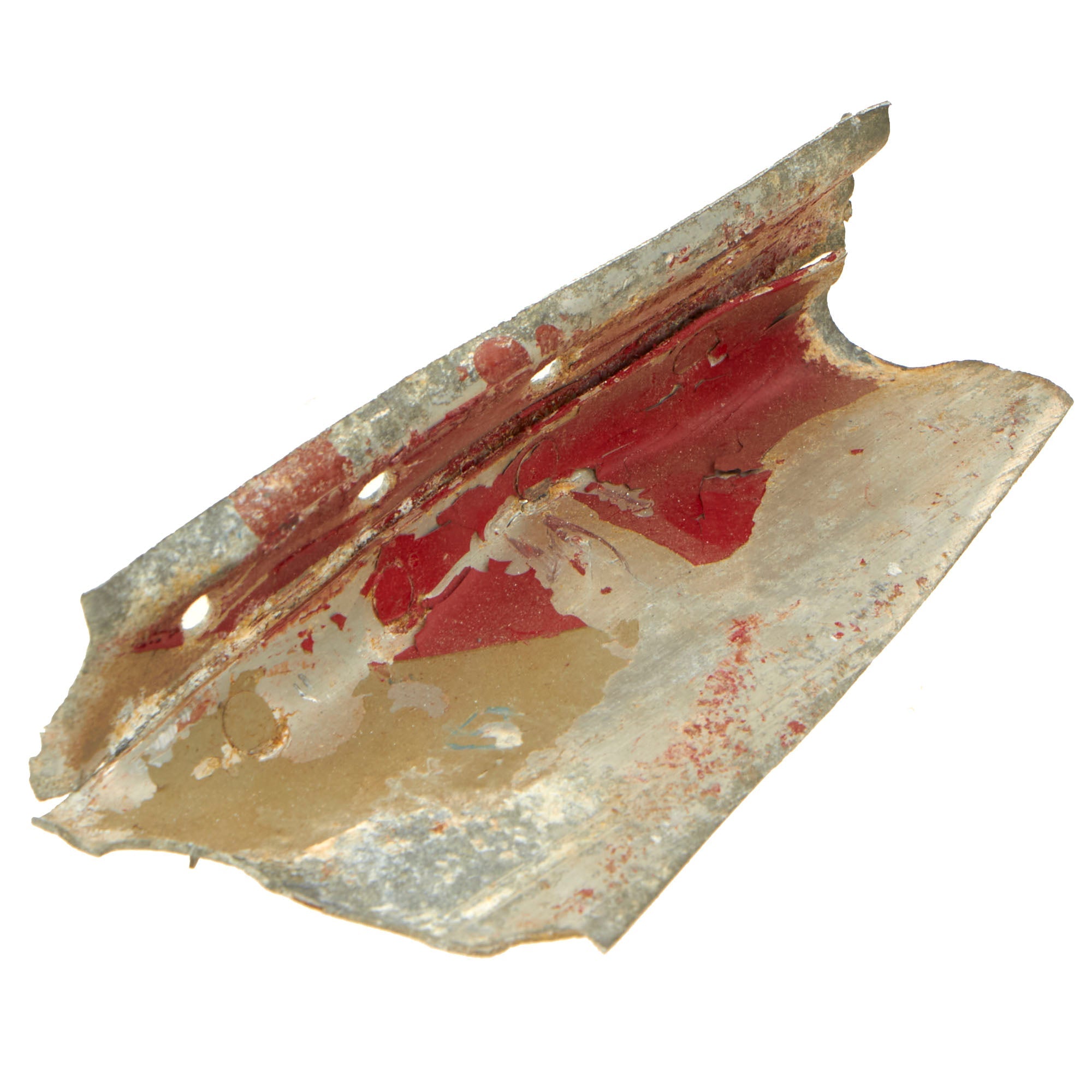 The fragment, which measures roughly 4¼ x 2¼ x 1”, is quite bent-up and retains a bit of red paint from one of the “Rising Sun” roundels on the plane. It’s actually two pieces which retain the four rivets keeping them together. The red paint is actively chipping, so this should be handled very delicately.