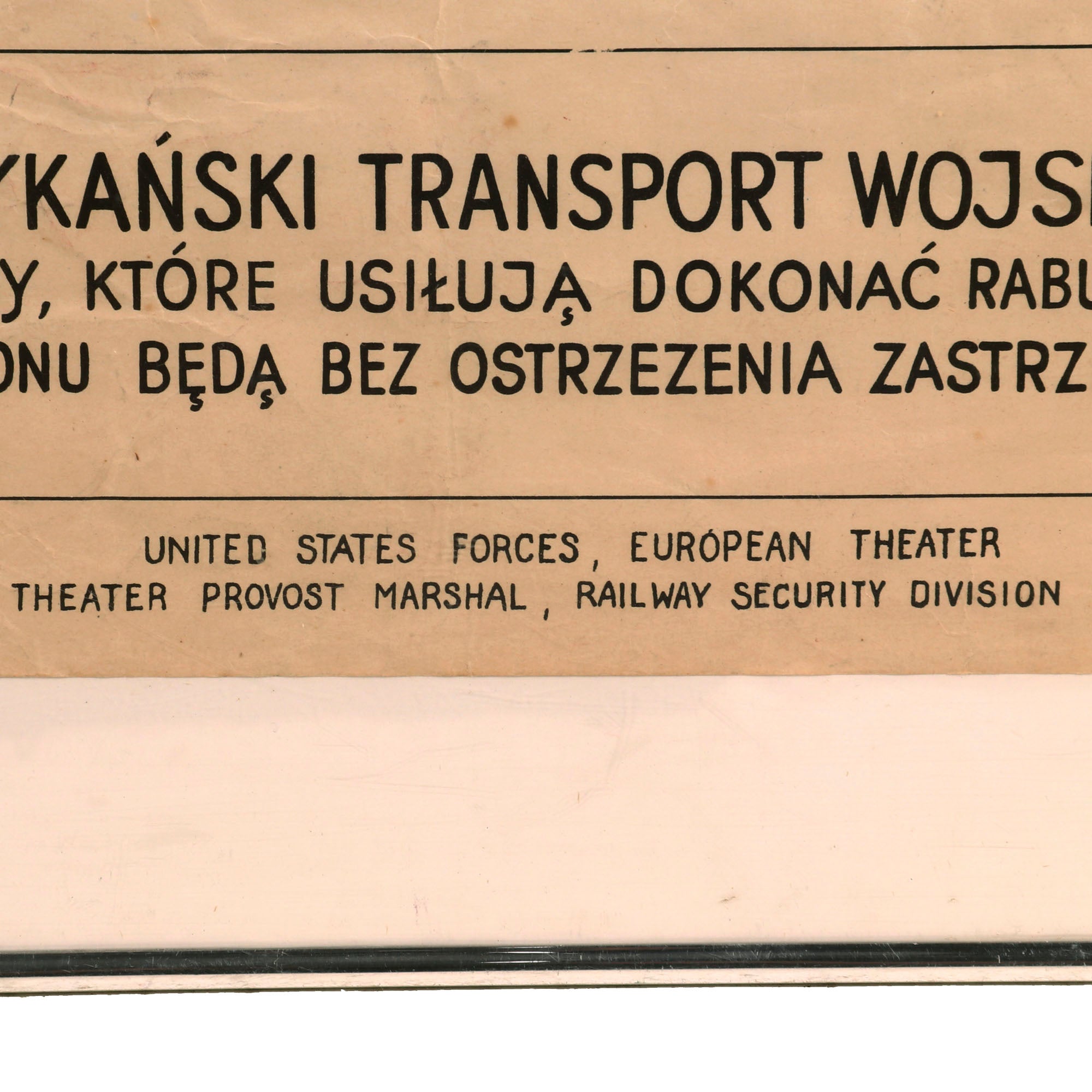 Original Item. Only One Available. This is an extremely scarce Post-WWII Occupation poster which was printed in five languages that deterred pilferers & thieves who sought to steal or steal from a U.S. Army vehicle, threatening being shot without warning. The poster is printed in English, German, French, Russian, and Polish.