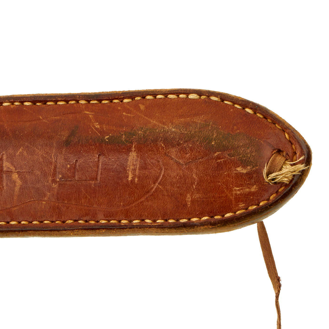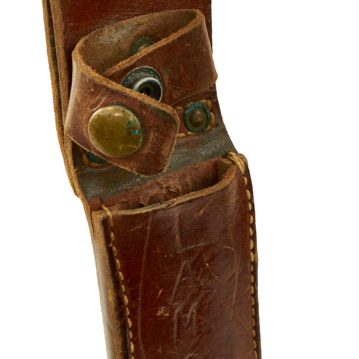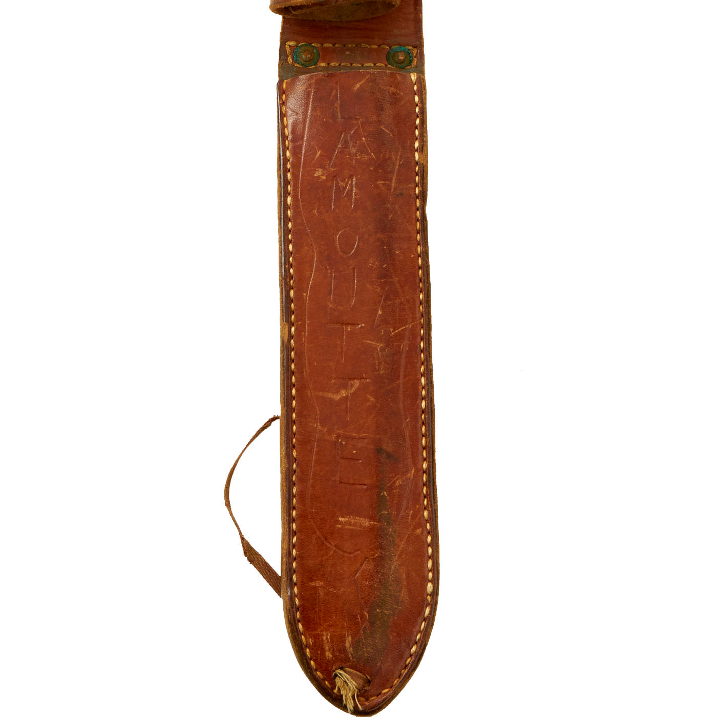 The included leather scabbard has the appearance of having been made for another knife of sorts and was just recycled into use as they so ofter were. It is in lovely condition with all stitching and rivets intact. The retaining strap on the belt loop is in slid condition and still has a functioning button. The front of the scabbard has the last name “LAMOUTTE” scratched into it. Given how this is a French last name, this could have also been a family item passed down and was converted before the soldier left for the war, but your guess is as good as ours!