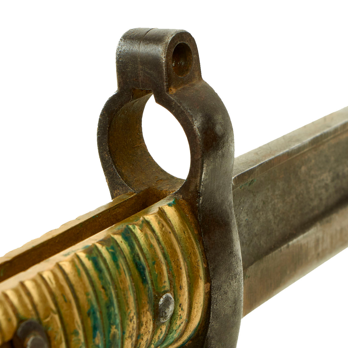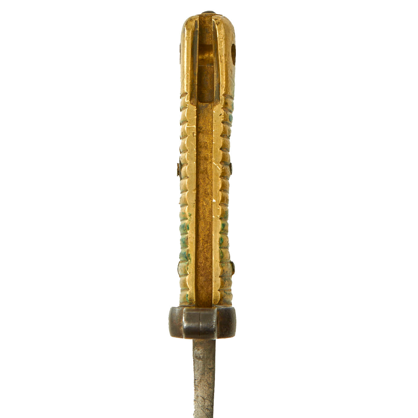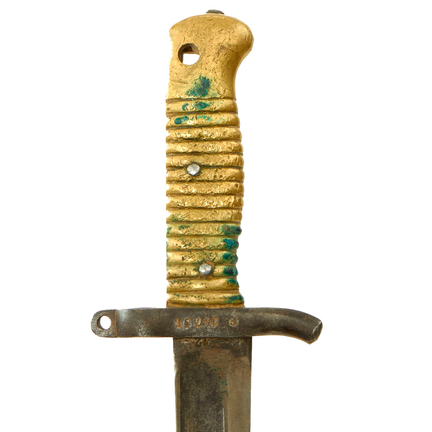The bayonet itself appears to be dated 1878 on the spine, but due to how worn the markings are it is very difficult to read. There is an arsenal marking on the spine as well, but this is also too faded to be able to read properly. The fighting knife itself is in lovely condition and does show signs of wear and use. The bayonet mechanics themselves were removed by the soldier, more than likely to give it a slimmer profile and to help mitigate the risk of snagging it on clothing. The brass handle has a lovely aged mustard patina as well as verdigris buildup. It appears as if the soldier tried to flatten out some of the grooves on the handle due to the amount of “strike” marks present.