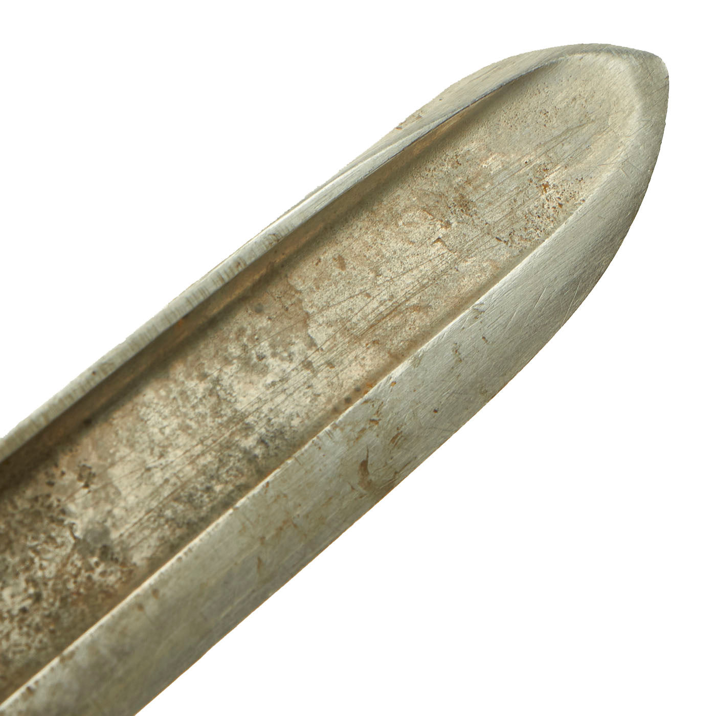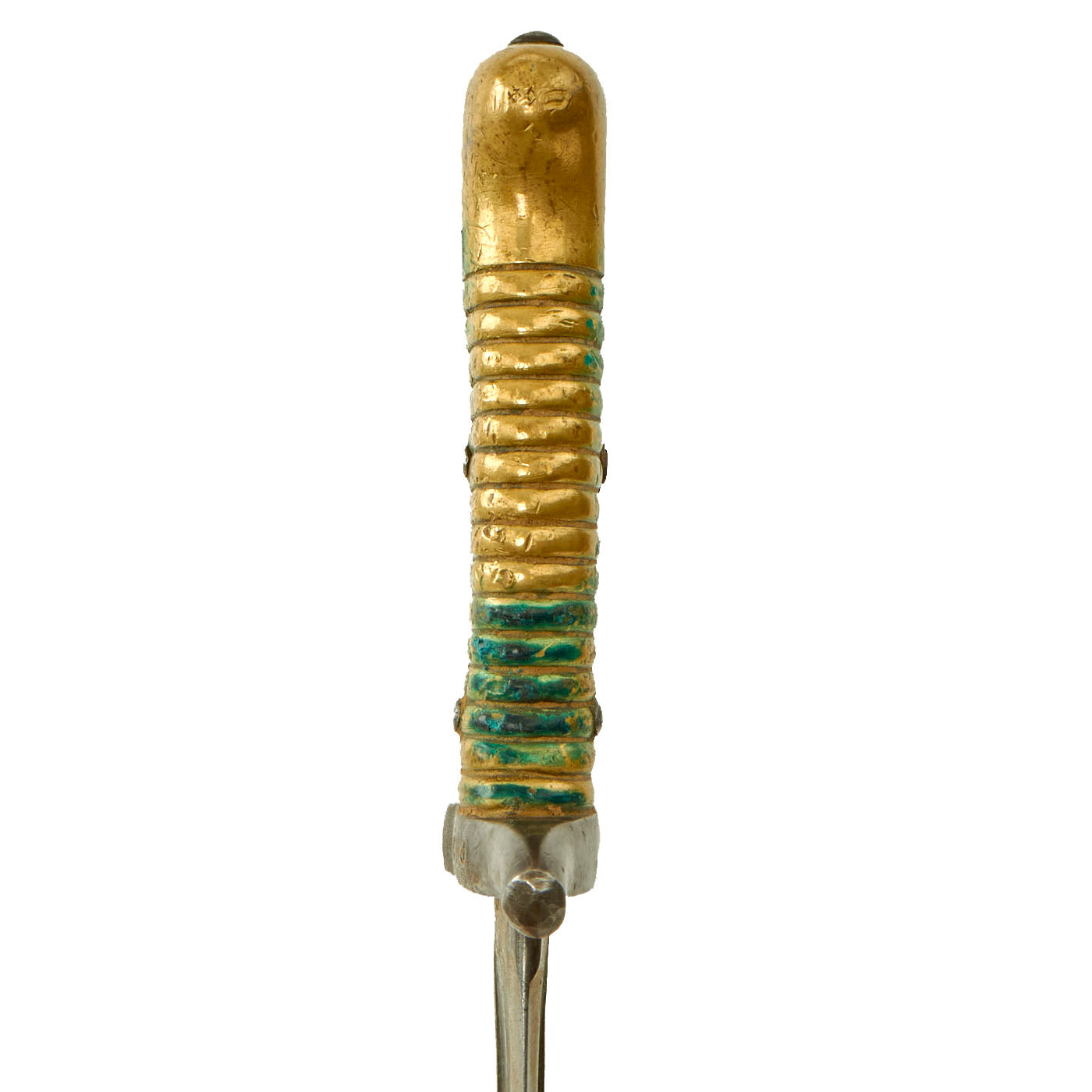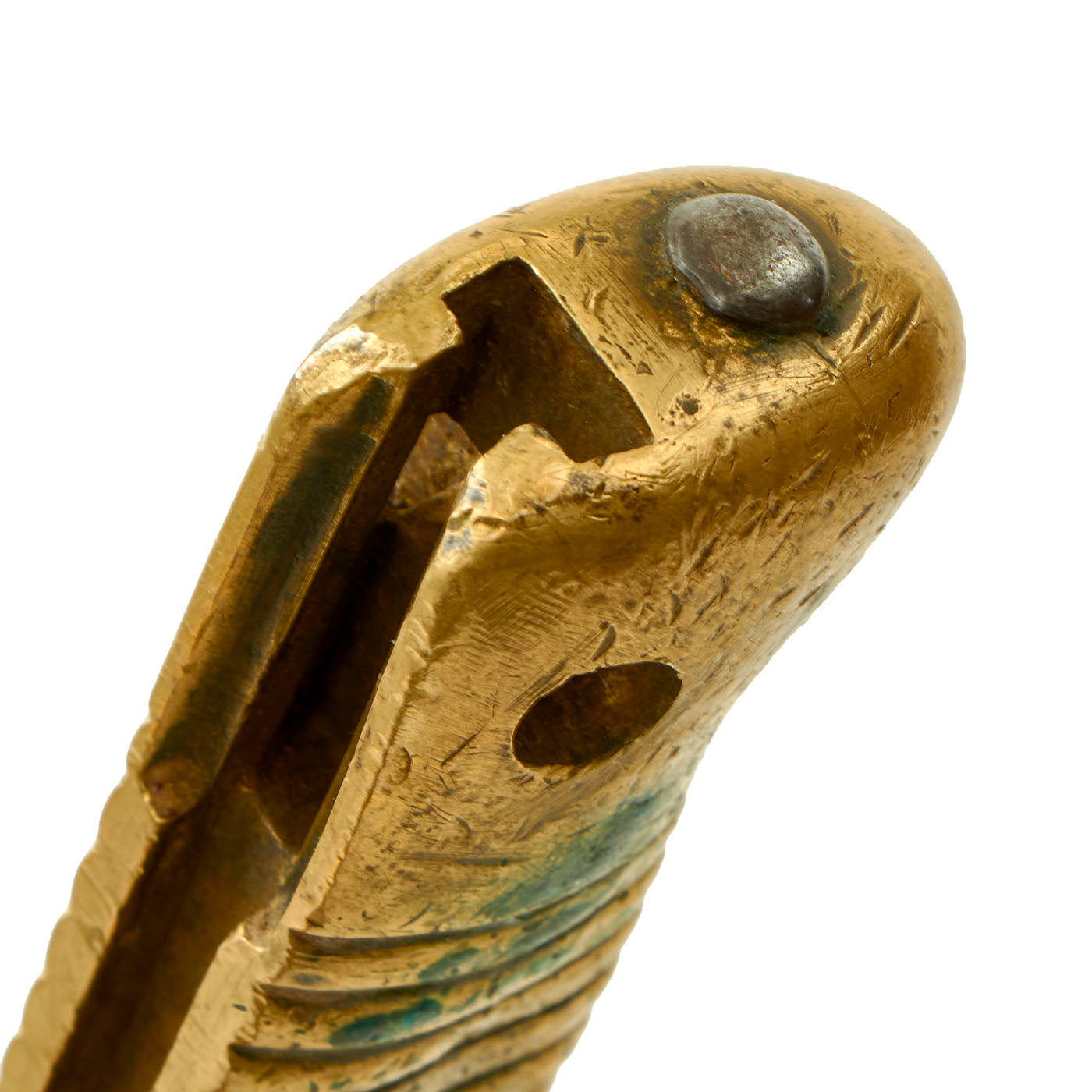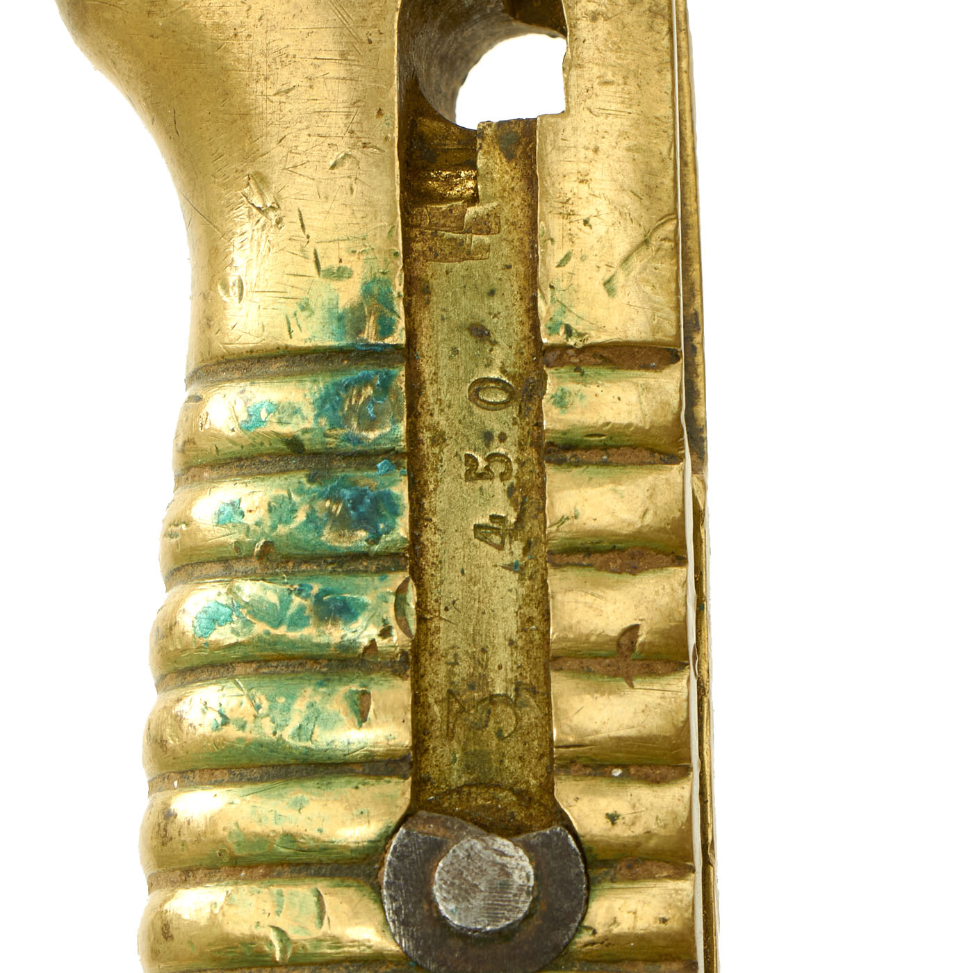 The bayonet itself appears to be dated 1878 on the spine, but due to how worn the markings are it is very difficult to read. There is an arsenal marking on the spine as well, but this is also too faded to be able to read properly. The fighting knife itself is in lovely condition and does show signs of wear and use. The bayonet mechanics themselves were removed by the soldier, more than likely to give it a slimmer profile and to help mitigate the risk of snagging it on clothing. The brass handle has a lovely aged mustard patina as well as verdigris buildup. It appears as if the soldier tried to flatten out some of the grooves on the handle due to the amount of “strike” marks present.