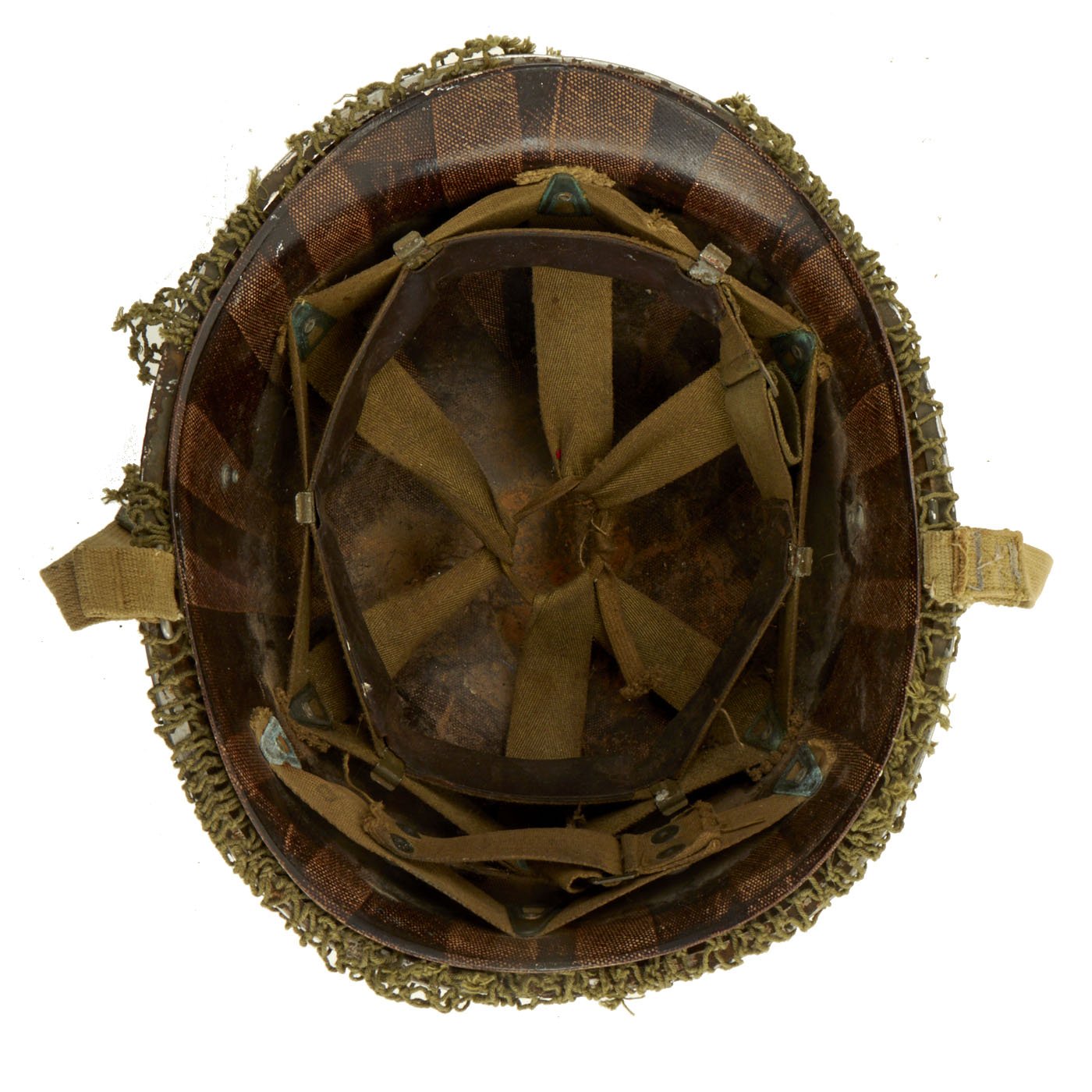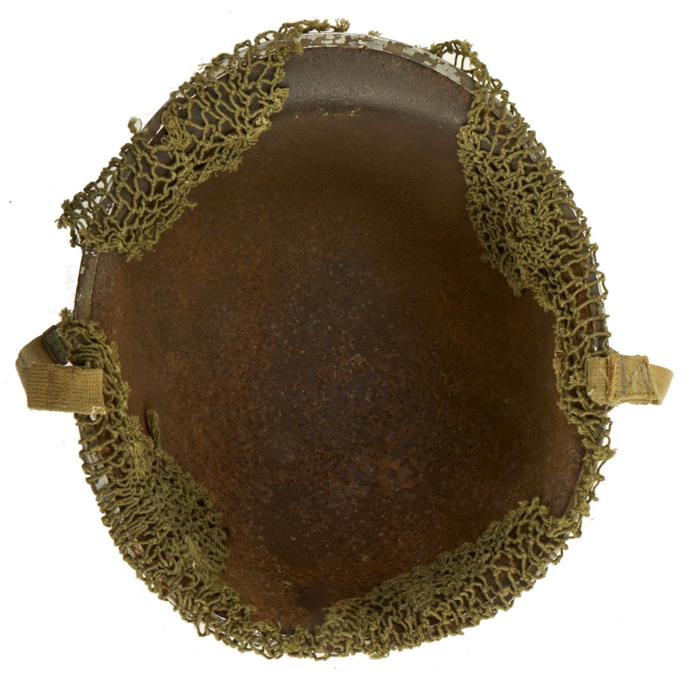 This helmet is a good example and still retains most of its original WW2 parts. The left side of the chinstrap appears to be a period field repaired replacement. The Shell is pitted and oxidized, with traces of original paint visible on the chinstrap bales and the rim of the helmet. The maker heat lot number is not visible. It has the correct early war OD green #3 Chin strap with a cast brass buckle.