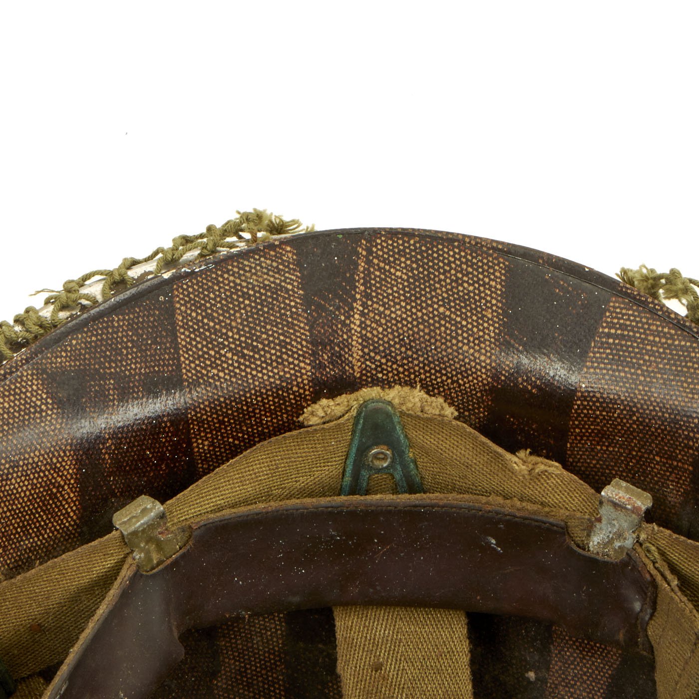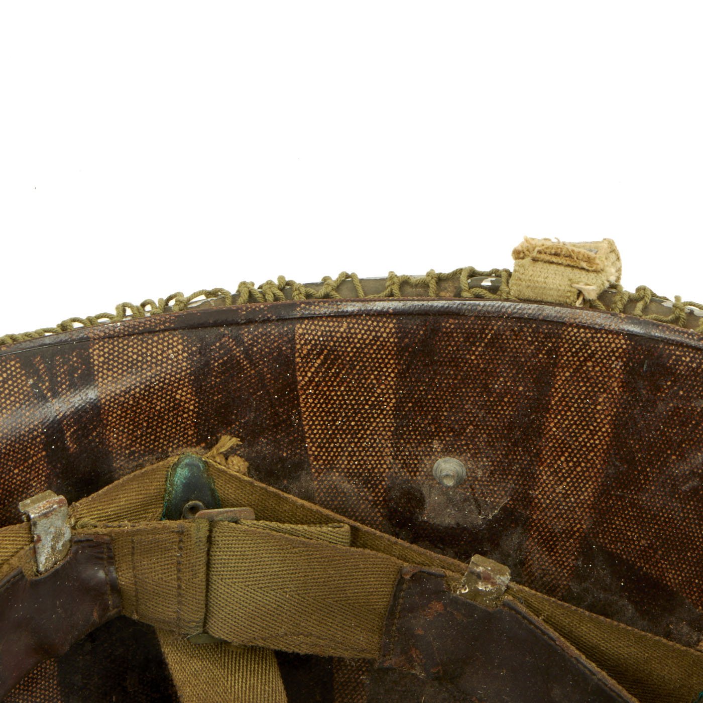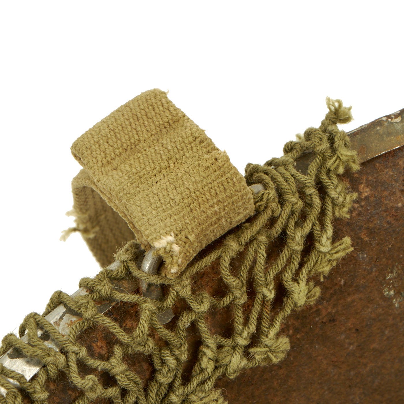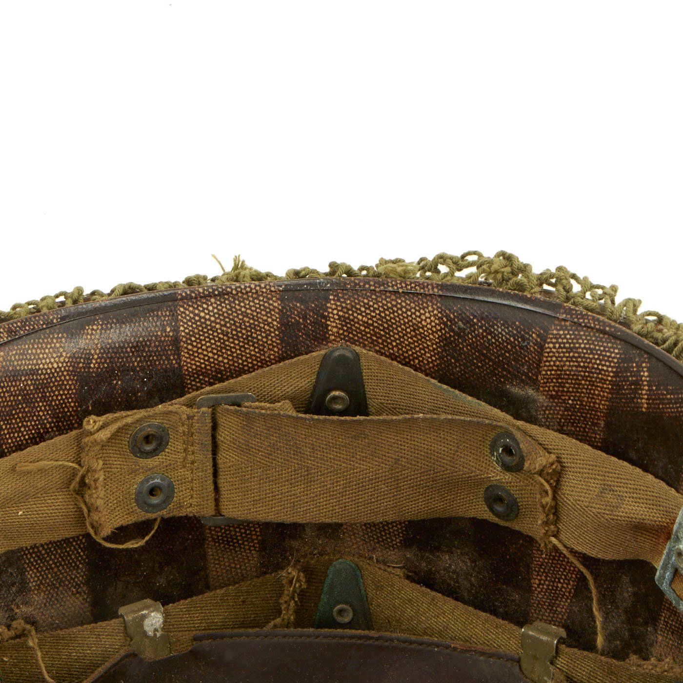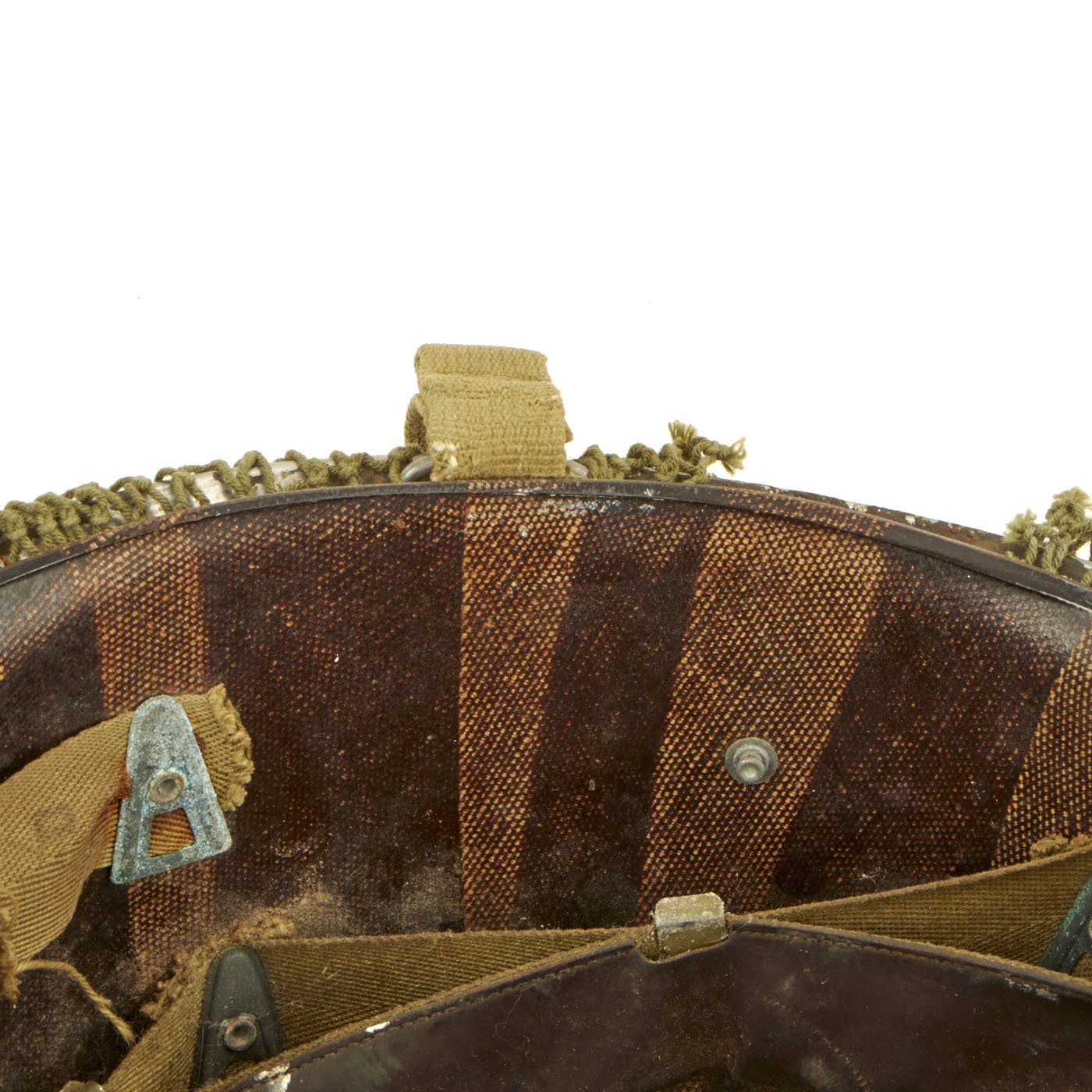 The correct "high pressure" style M-1 Helmet liner The liner exhibits original paint on the exterior, and original intact OD3 webbing, and correct chinstrap with green painted hardware. The liner makers stamp is not visible. This true US WWII M-1 helmet liner be identified through the frontal eyelet hole. Other correct WWII features include OD Green #3 cotton herringbone twill (HBT) cloth suspension liner, with the webbing in very good shape. This HBT suspension is held tightly within the M-1 helmet liner by rivets and a series of triangular "A" washers. The three upper suspension bands are joined together with the correct OD green string. This way the wearer could adjust the fit. The sweatband is still present, showing modern use and staining. The leather liner chin strap is fully intact, which is a rarity. There are also visible markings on the back of the sweatband securing strap.
