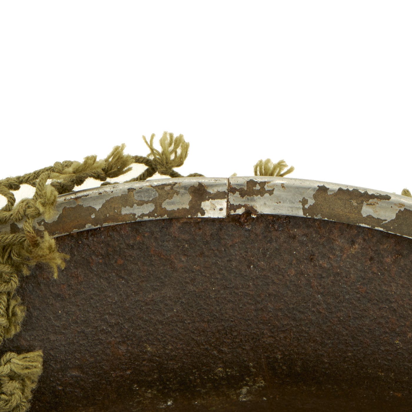 This very good condition M1 shell has correct earl war fixed chinstrap loops, called "bales," and a stainless steel rim with a front fully welded seam. These rims were both rust resistant and had "non-magnetic qualities" that reduced the chance of error readings when placed around certain sensitive equipment (such as a compass). In November 1944 the specification was changed to have the rim seam in the rear of the helmet.
