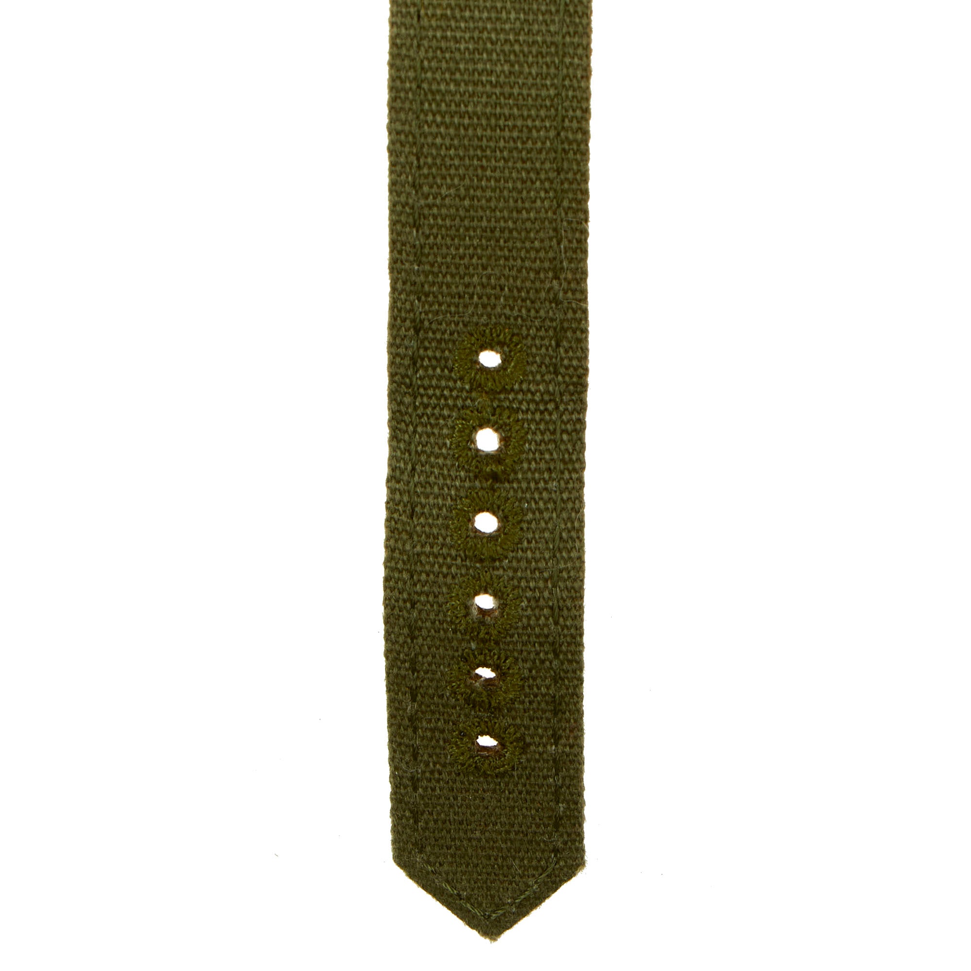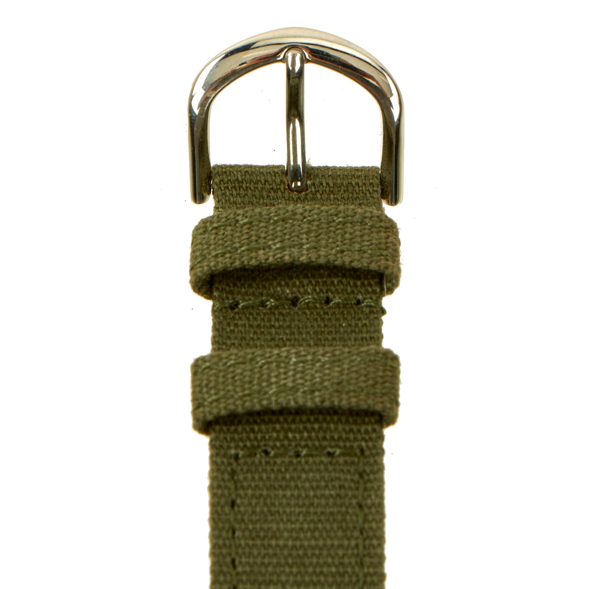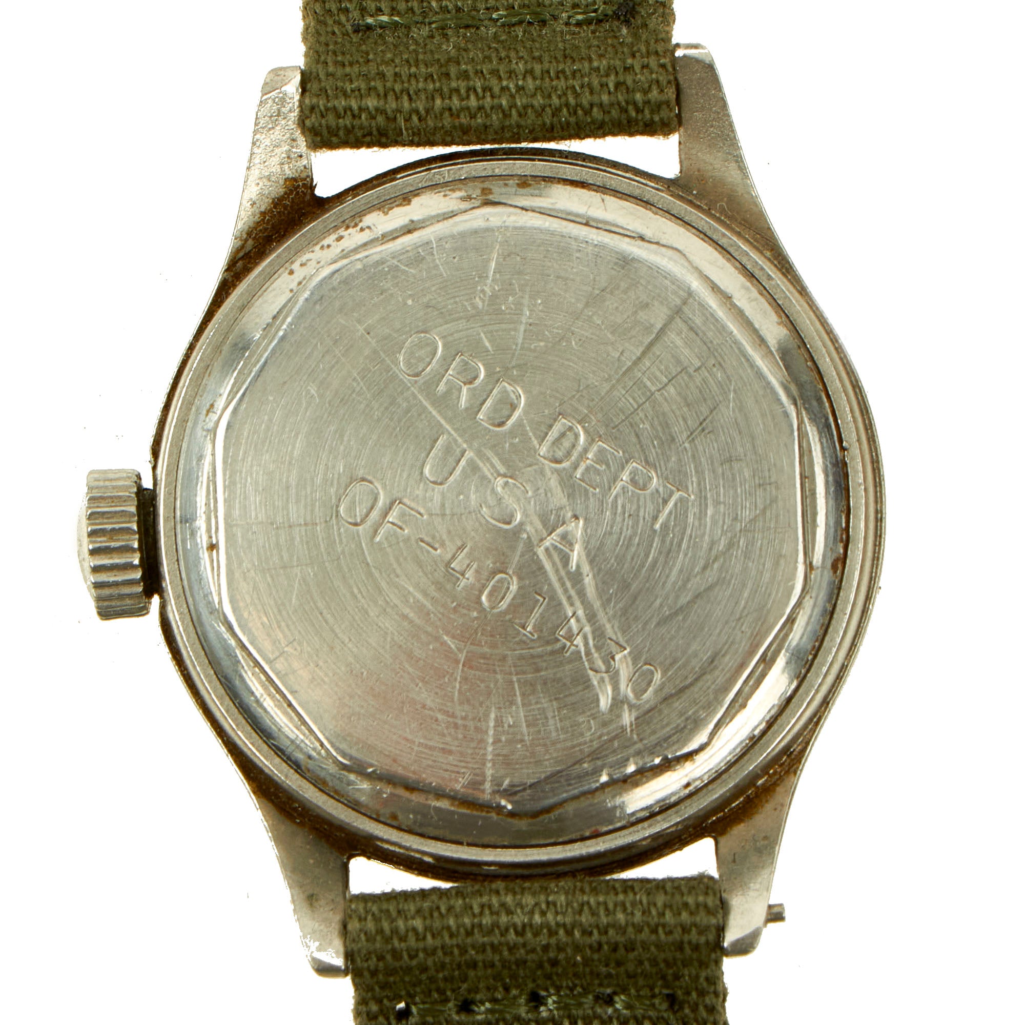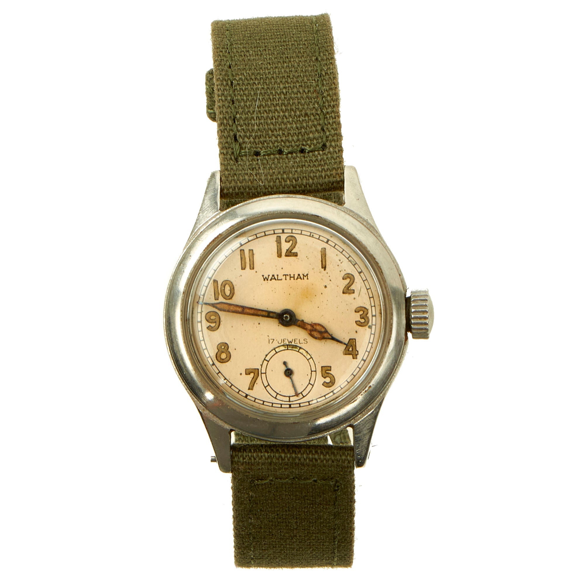 Original Item: Only One Available. This is an excellent example of a Mid-War production OF Officer Grade issue Stainless Steel Case Waltham Model 10617 17-Jewel wrist watch, with a stainless steel screw back closure. This wonderful example has been fully cleaned, tested and runs perfectly. It was manufactured for the US Army, and has a white face with radium luminous numbers for night use. It has the name WALTHAM on the dial face. The band is a correct high quality OD Green web reproduction. The Army serial number is OF-401430, which places production around 1944-45 based on past watches we have sold.