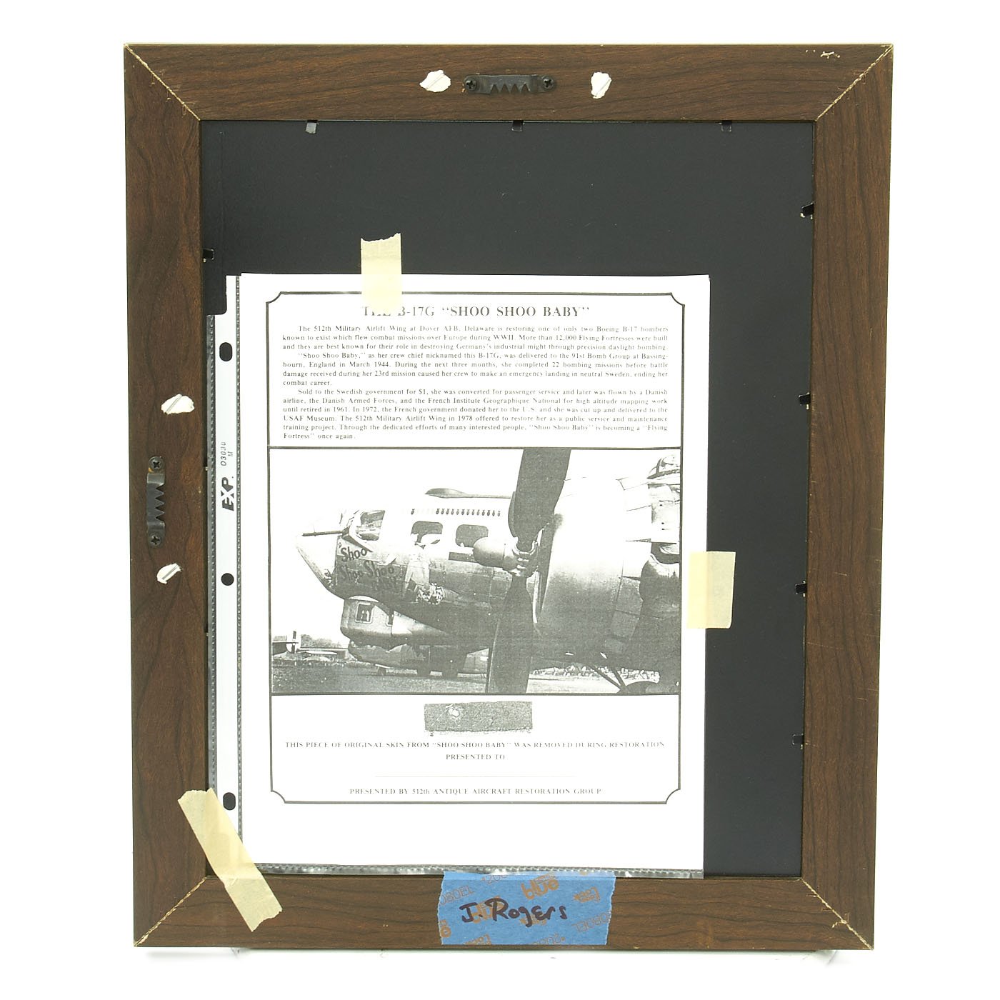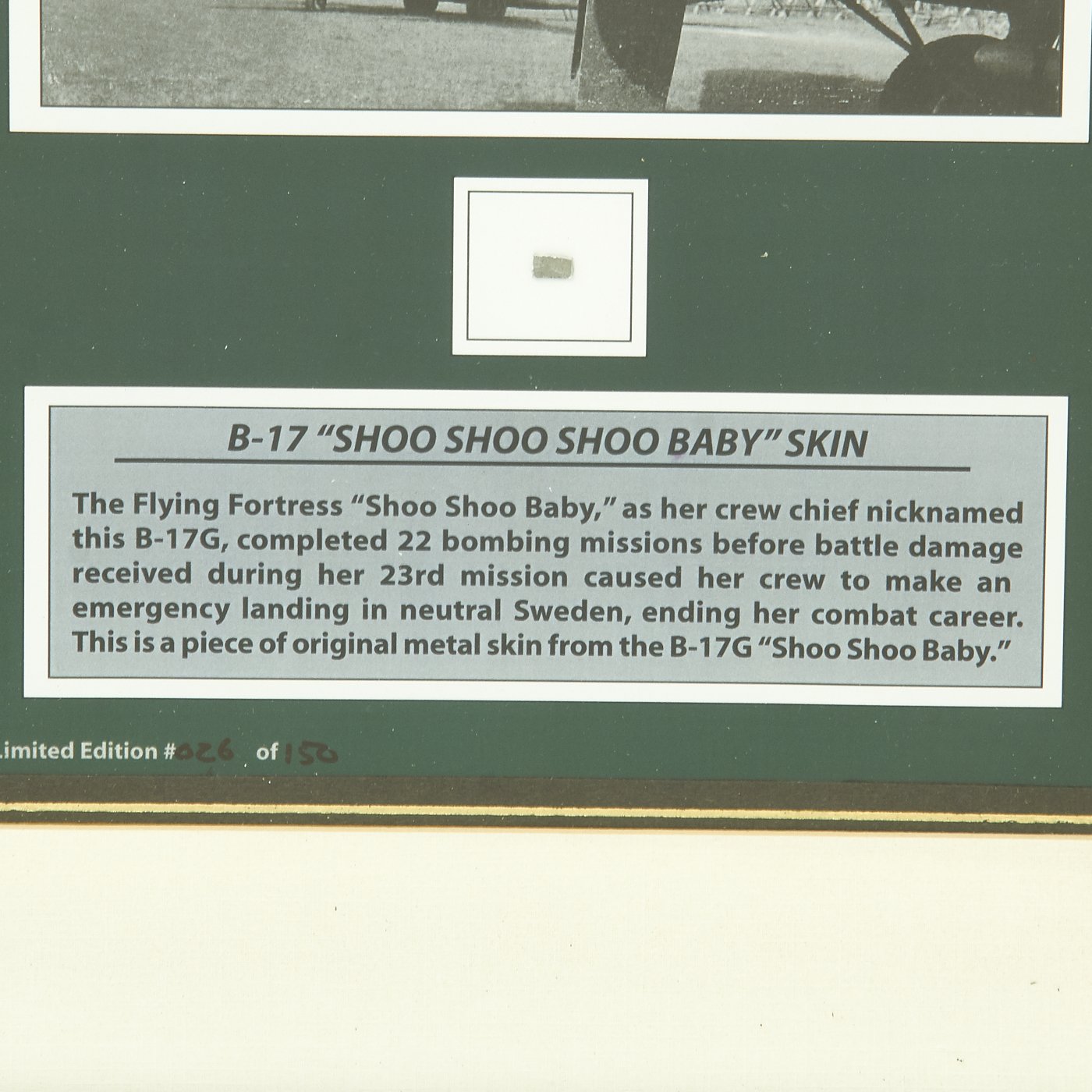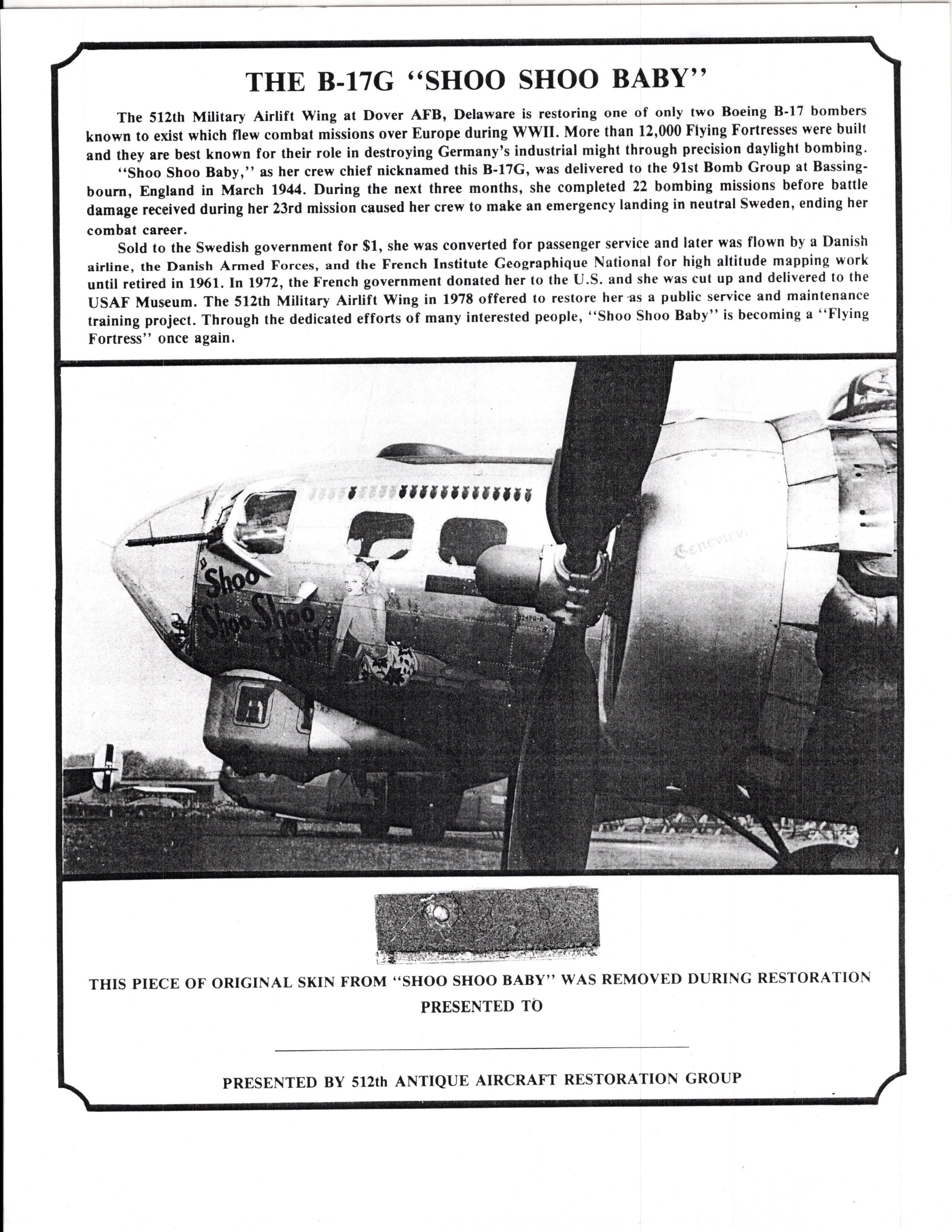 These commemorative framed pieces were being sold to fund the restoration of the plane at Dover AFB. Today, B-17G Shoo Shoo Shoo Baby is fully restored and preserved, currently in storage at the National Museum of the United States Air Force, awaiting transfer to the Smithsonian's National Air and Space Museum.