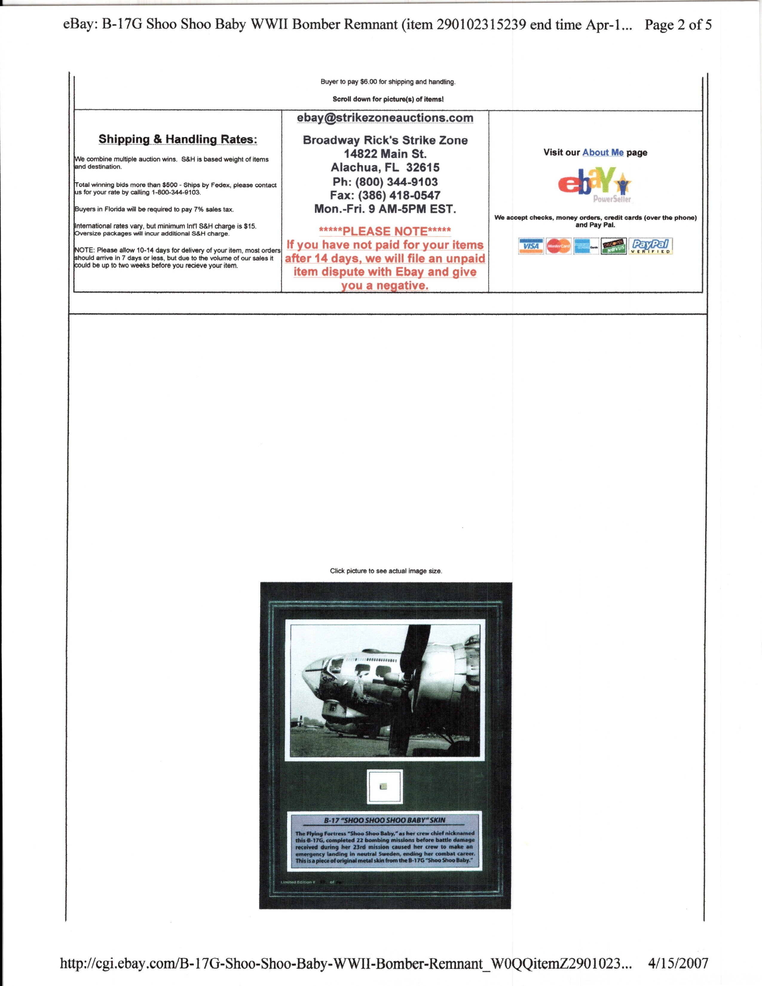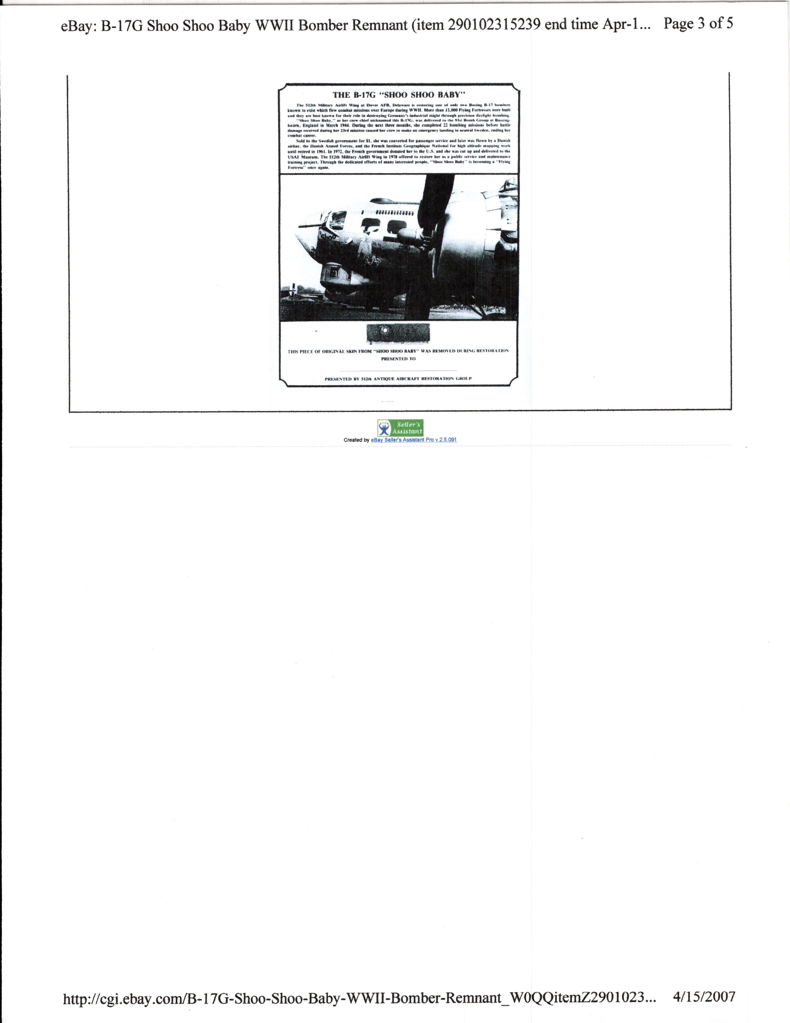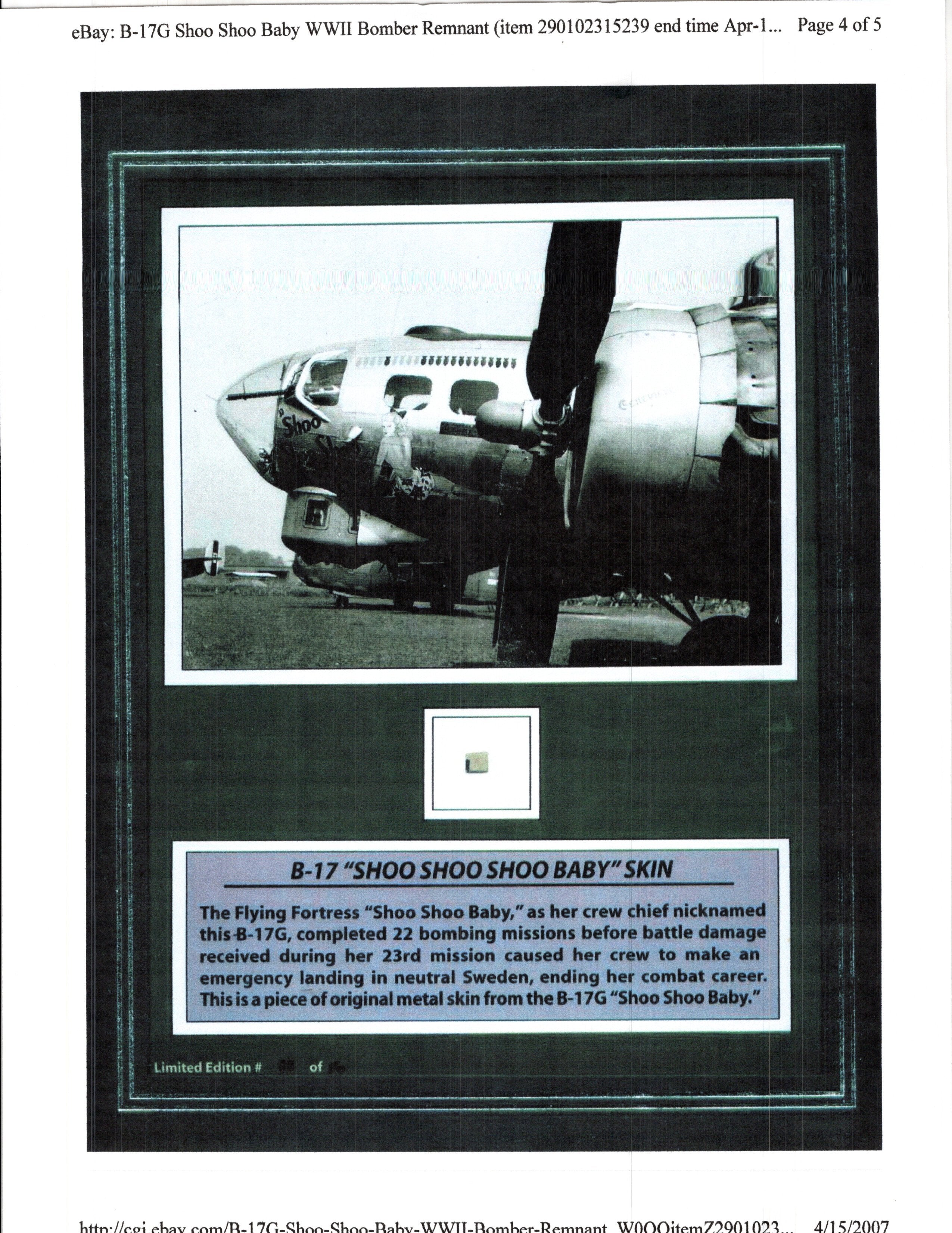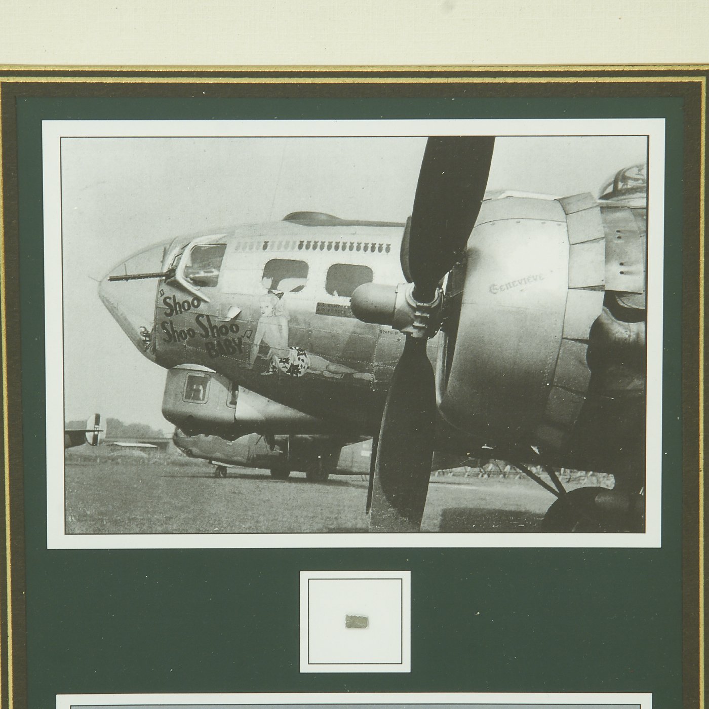 These commemorative framed pieces were being sold to fund the restoration of the plane at Dover AFB. Today, B-17G Shoo Shoo Shoo Baby is fully restored and preserved, currently in storage at the National Museum of the United States Air Force, awaiting transfer to the Smithsonian's National Air and Space Museum.