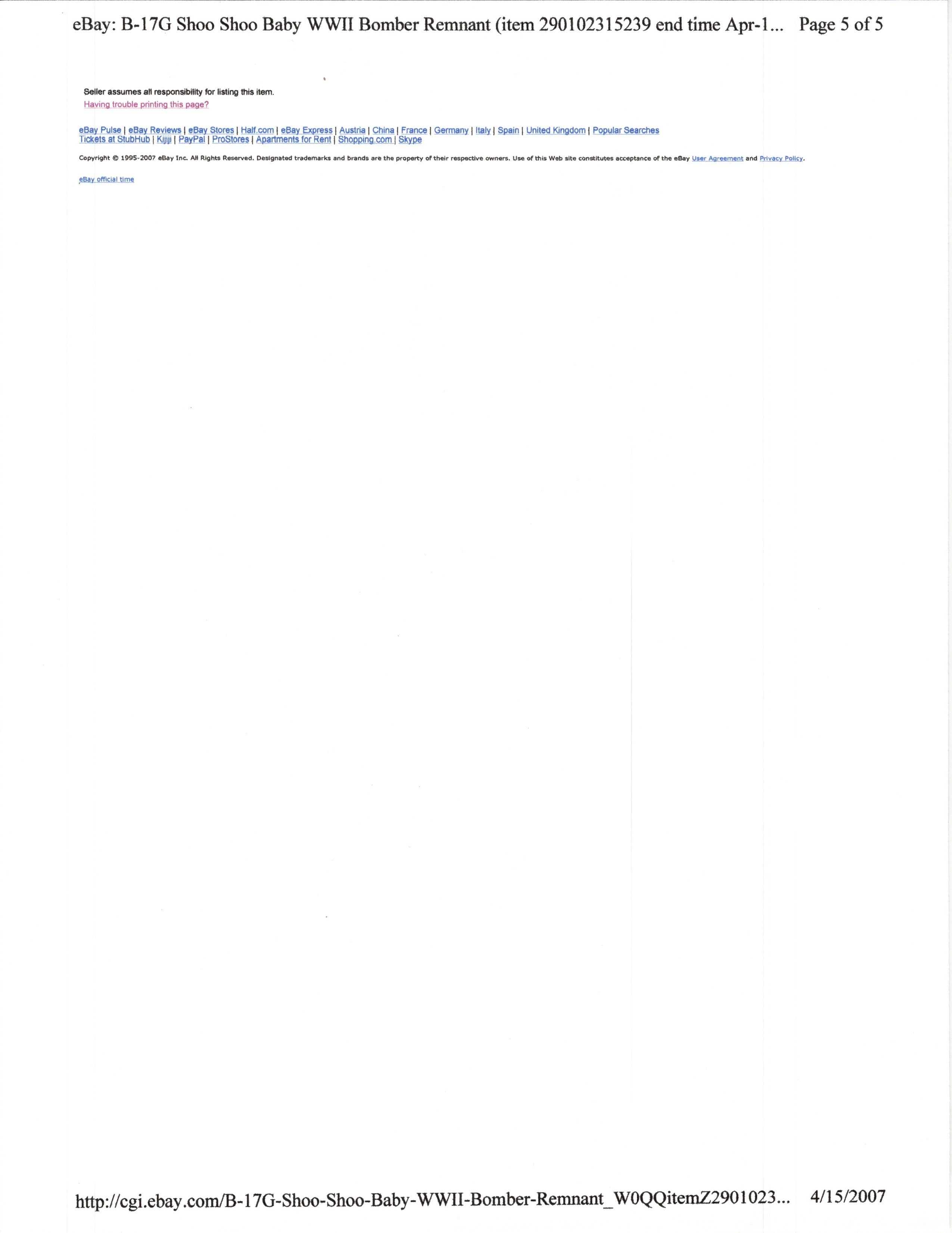 Original Items: One-of-a-kind set. The aircraft that would become Shoo Shoo Baby was accepted into the U.S. Army Air Forces inventory on 19 January 1944, and arrived in Great Britain on 2 March. After depot modifications, it was flown to the 91st Bomb Group at RAF Bassingbourn on 23 March and began flying missions the next day. 2nd Lt. Paul C. McDuffee was the first pilot assigned to the aircraft and flew 14 of his 25 missions in it, but nine different crews flew Shoo Shoo Baby on missions.