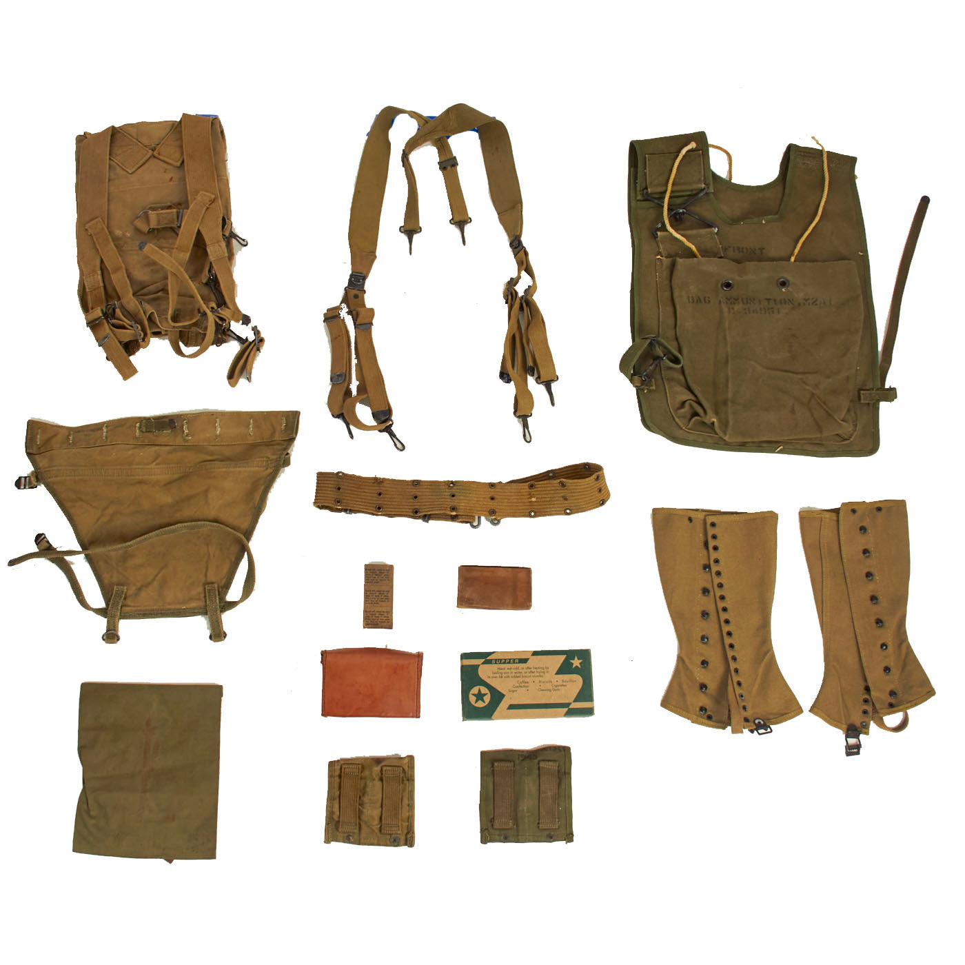 Original Items: Only One Lot of 13 Available. A one of a kind lot of nine WWII GI Field Gear pieces. All pieces except for the reproduction K-ration are in original, unmodified, condition, and show signs of honest use and storage wear that has accumulated over the last several decades. Most will have additional issue markings added at the arsenal or by the soldiers in various places.
