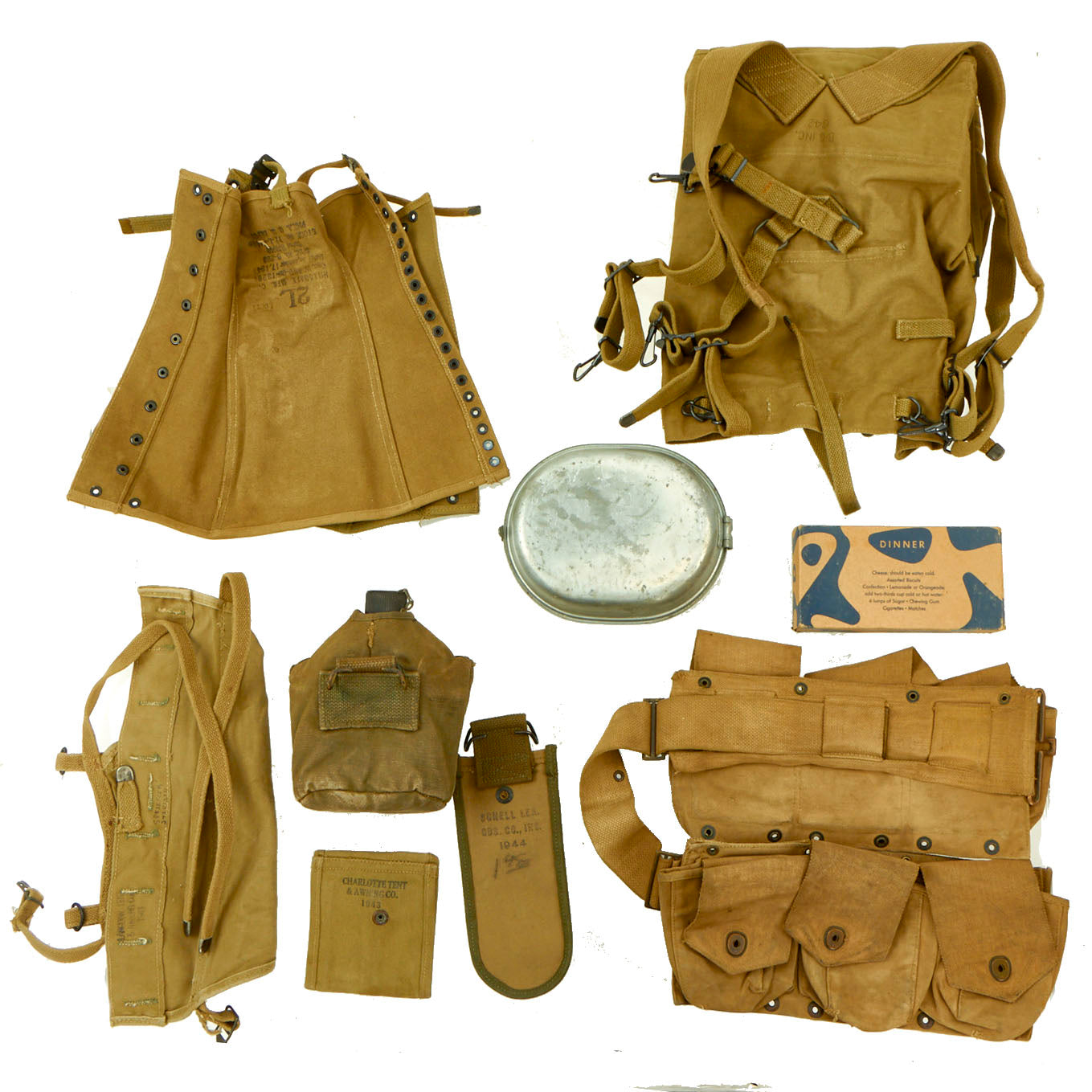 A really great set of field gear that makes up a good portion of the usual load out for a WWII Soldier. Ready to display or use in reenactments!