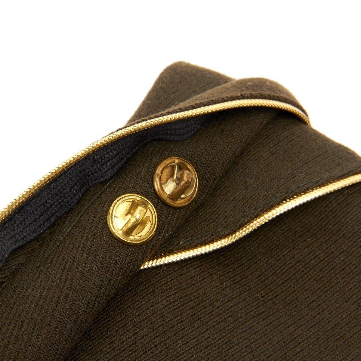 This particular garrison cap, or side cap, we believe was made in England and nicely stamped into the leather headband is the maker's mark of the British Royal Coat of Arms and: