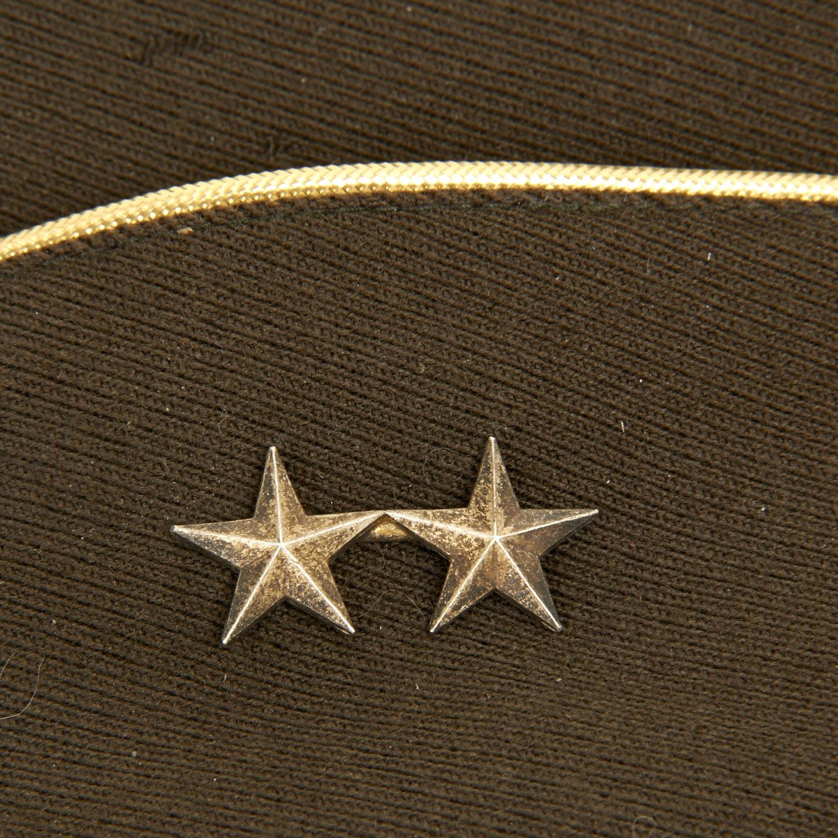 G. PATTON The cap bears two-silvered metal General's Stars (Major General) and is in fine condition. We are not able to authenticate the double star badge as having belonged to General Patton (as it is not named, none were), but the badge is period correct and was attached to the cap at the time it went to auction in 1998, so we believe it to be his.