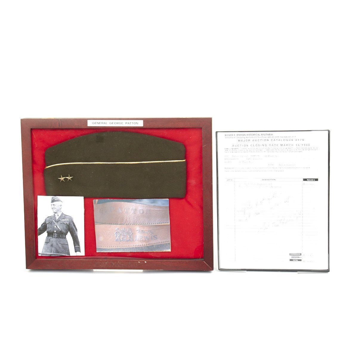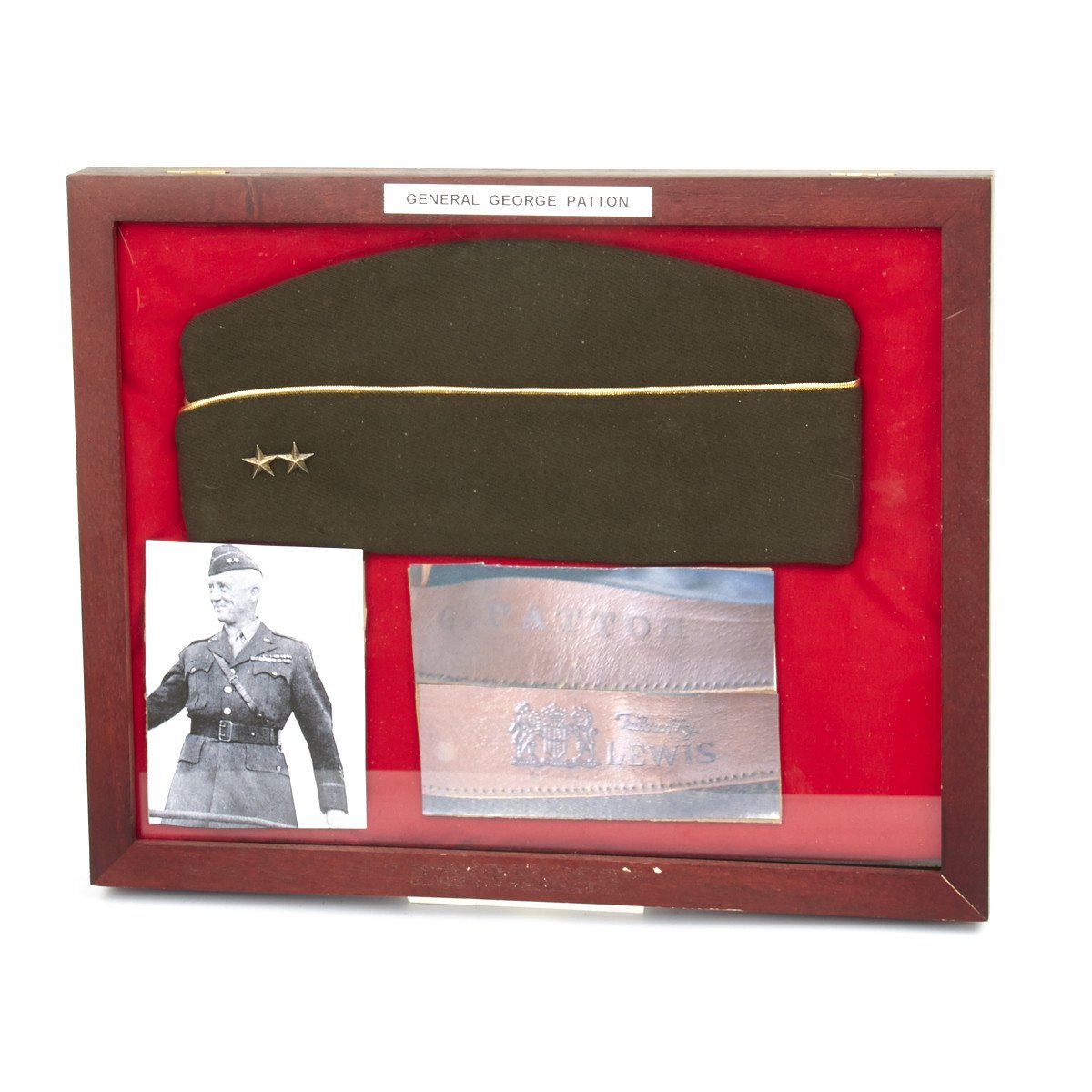 All items are enclosed in a standard glass and wood frame display case showing a photograph of General Patton wearing a two star side cap and detailed photographs of the markings on the leather hatband.