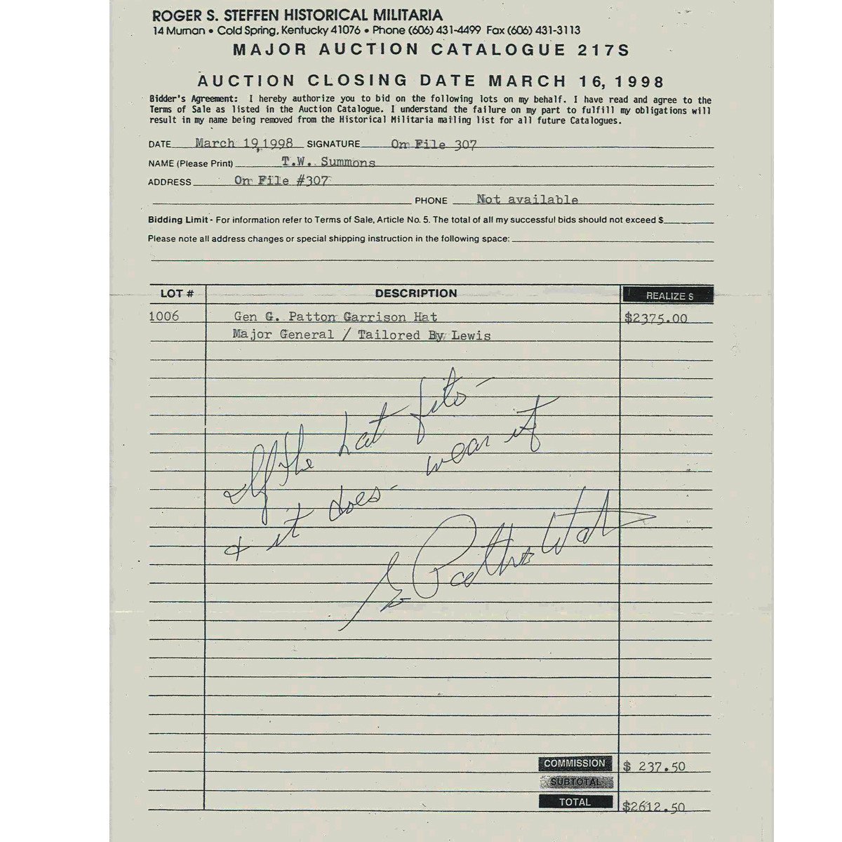 LOT # 1006 as "Gen. G. Patton Garrison Hat, Major General / Tailored by Lewis", the total purchase price with commission was $2,612.50. Who say’s military collectibles aren't a more reliable investment than real estate or the stock market?