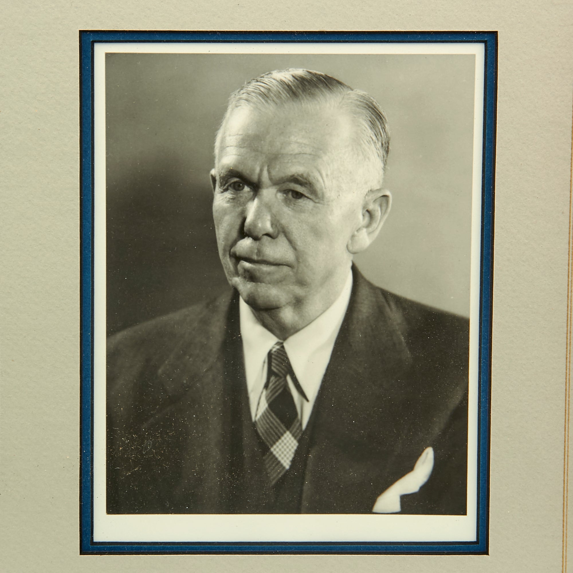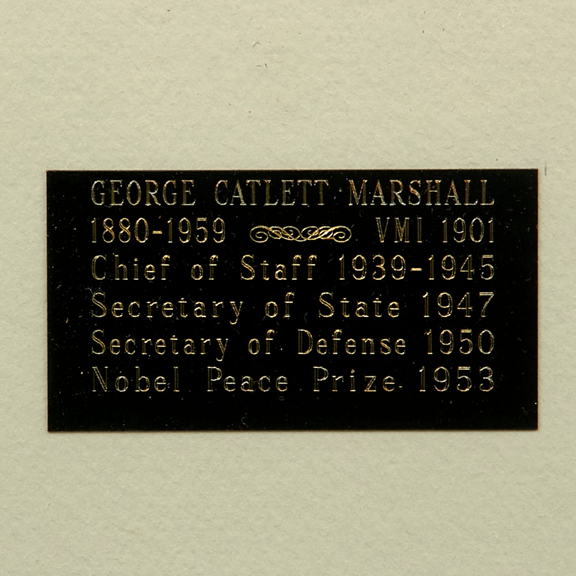 Original Item. One-of-a-Kind. This is a lovely framed autograph of one of the most well-known Generals and statesmen in American history, George Catlett Marshall Jr. He rose through the United States Army to become Chief of Staff of the U.S. Army under presidents Franklin D. Roosevelt and Harry S. Truman, then served as Secretary of State and Secretary of Defense under Truman. Winston Churchill lauded Marshall as the "organizer of victory" for his leadership of the Allied victory in World War II. During the subsequent year, he attempted but failed to avoid the impending continuation of the Chinese Civil War. As Secretary of State, Marshall advocated for a U.S. economic and political commitment to post-war European recovery, including the Marshall Plan that bore his name. In recognition of this work, he was awarded the Nobel Peace Prize in 1953, the only Army general ever to receive the honor.