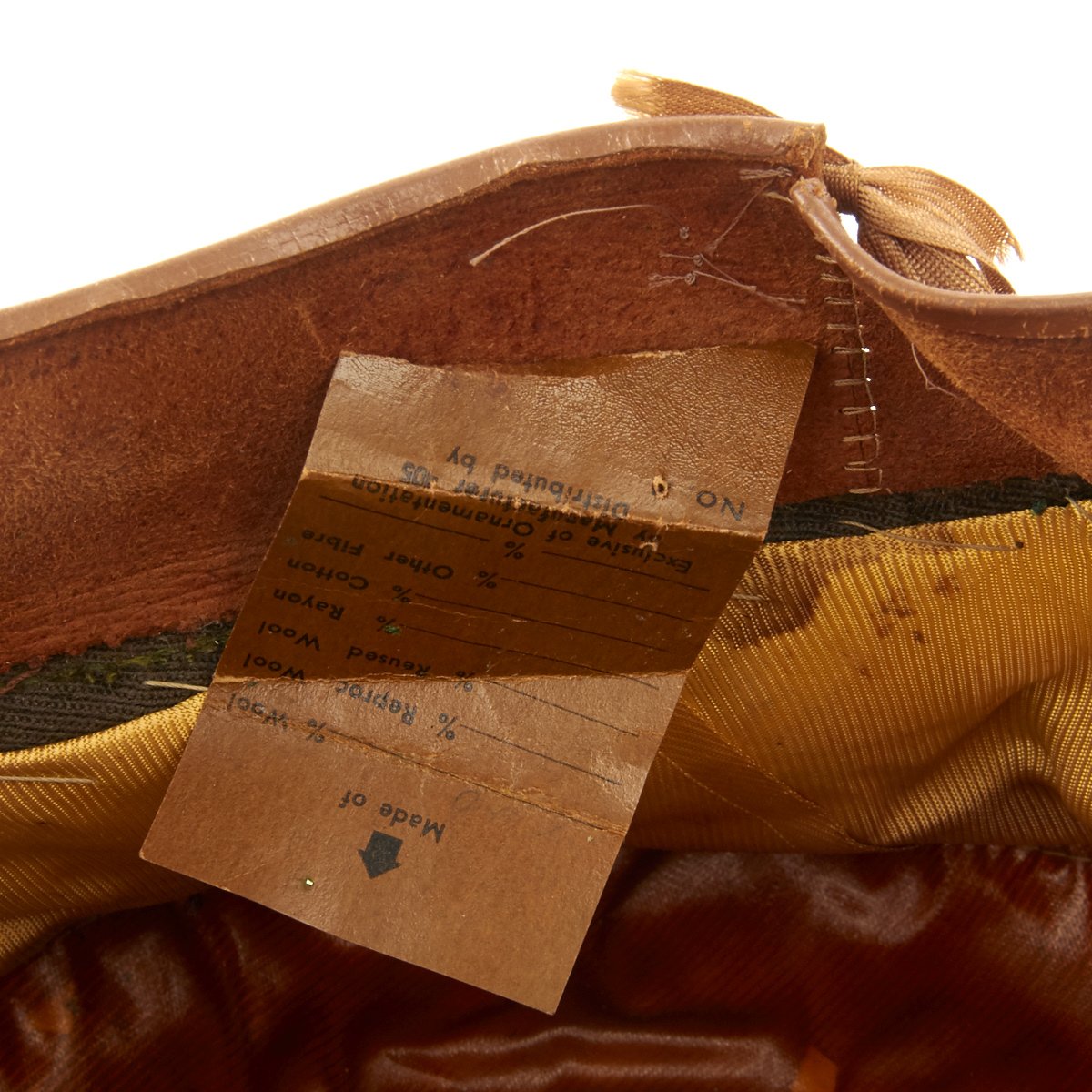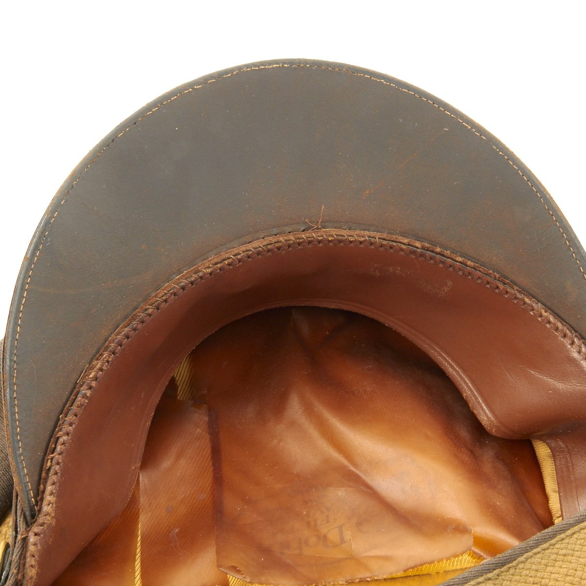 This visor cap, named in embossed gold on the sweatband GEORGE C. MARSHALL O-1616, is constructed in Olive Green Wool and was manufactured by DOBBS of New York. The O-6161 are the last four digits of his Army Serial Number. The cap is of the highest quality and in very good condition with an iconic crush shape. Condition of the hat is very good, the stiffener was removed which allows the hat to form the classic "crush" shape which was very popular with officers during World War Two. Interior waxed lining has torn, otherwise in great condition. Size is approximately 7 1/4 (58cm).
