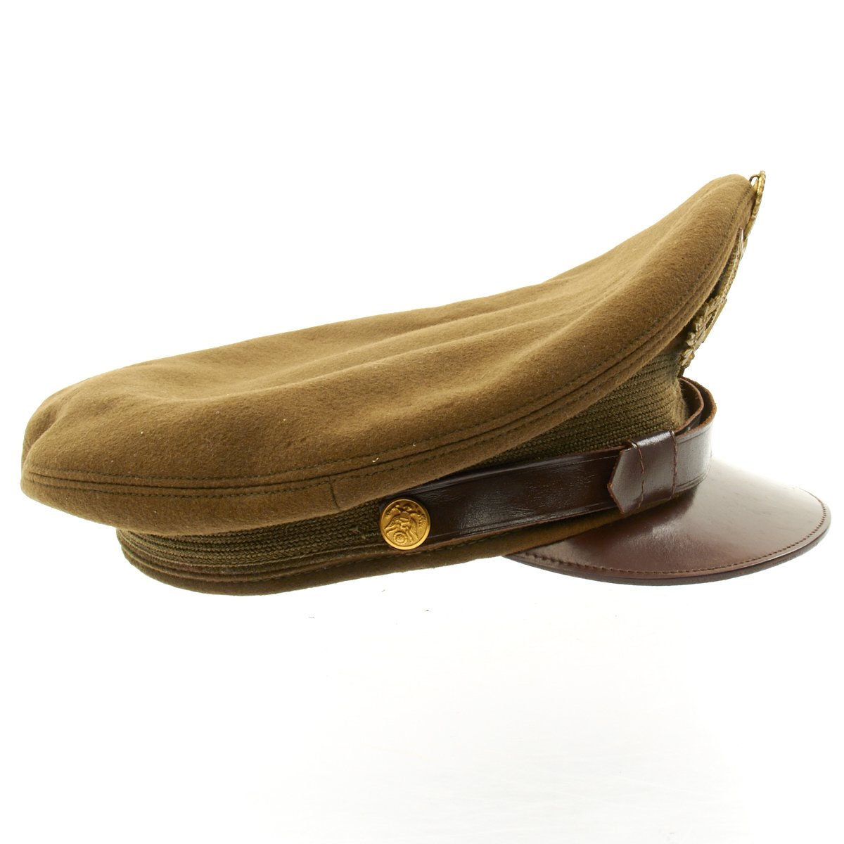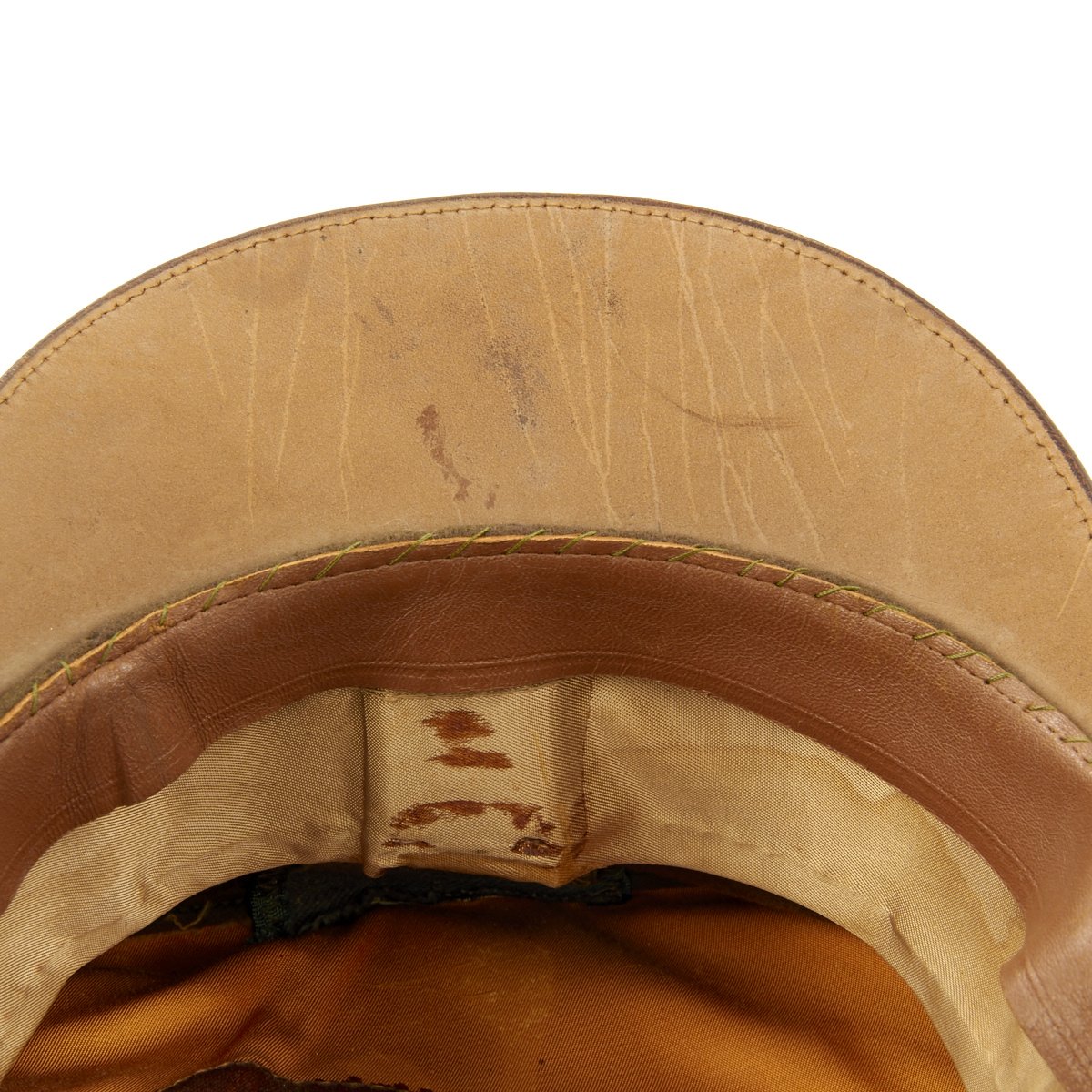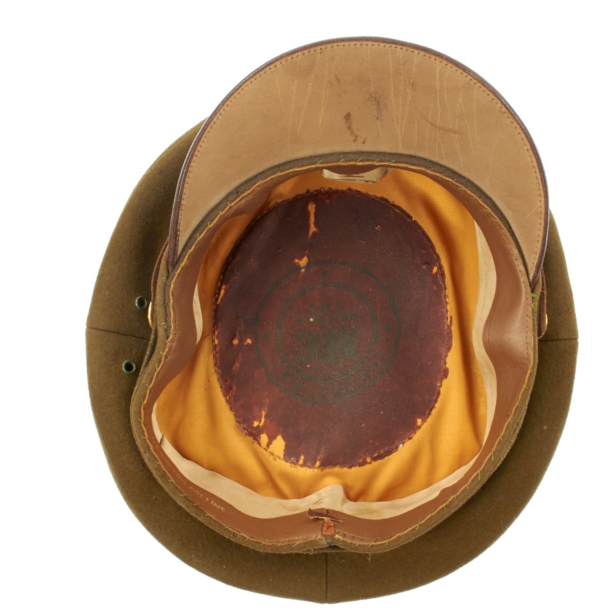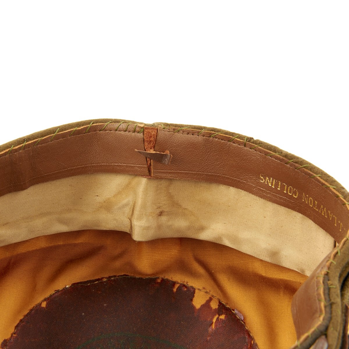 This visor cap, named in embossed gold on the sweatband GEN. J. LAWTON COLLINS, is constructed in Olive Green Wool. The cap is of the highest quality and in very good condition with an iconic crush shape. The stiffener was removed which allows the hat to form the classic "crush" shape which was very popular with officers during World War Two. Interior waxed lining has been removed. Size is approximately 7 3/8 (59cm).