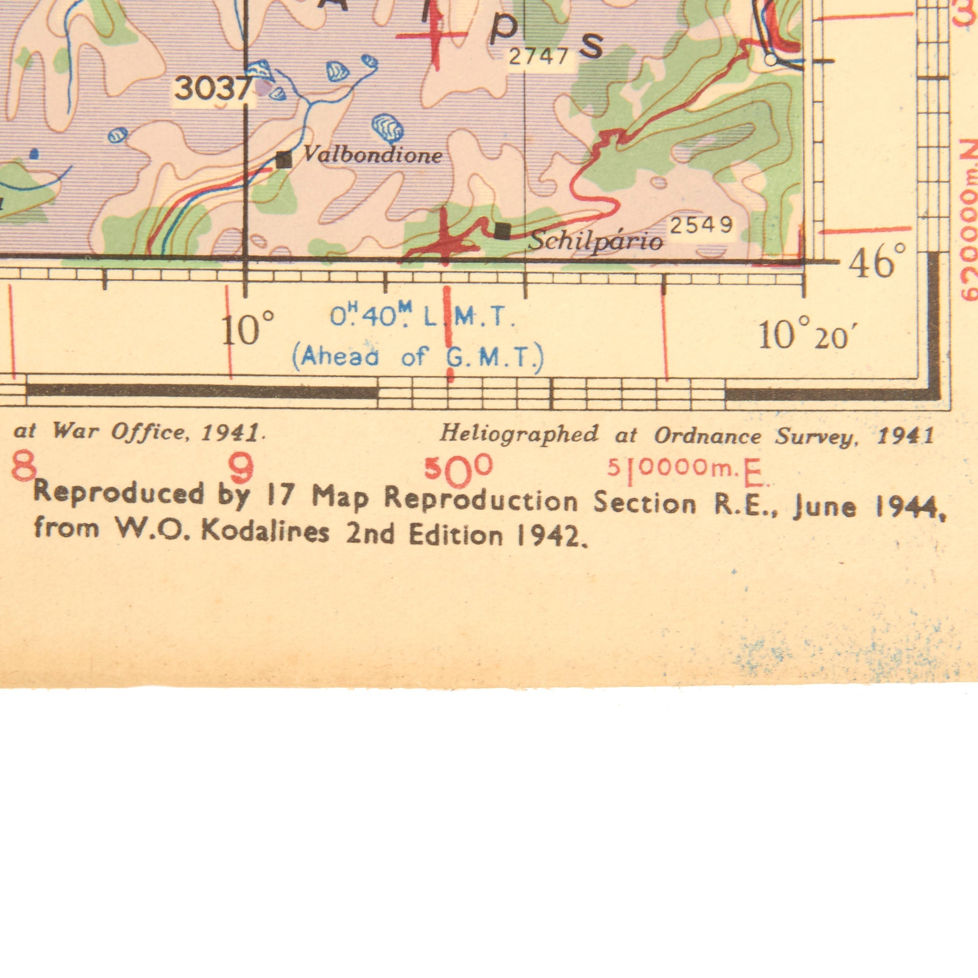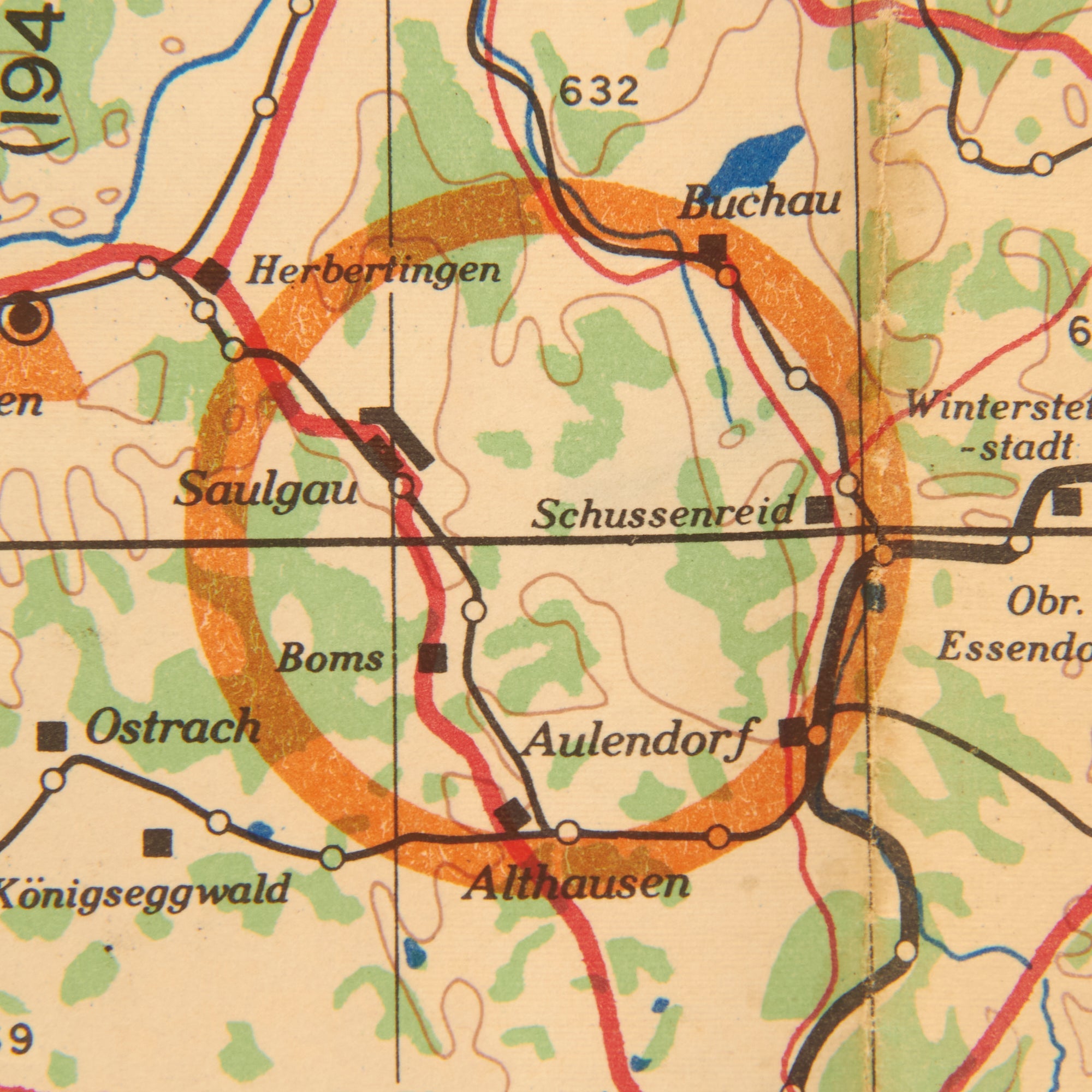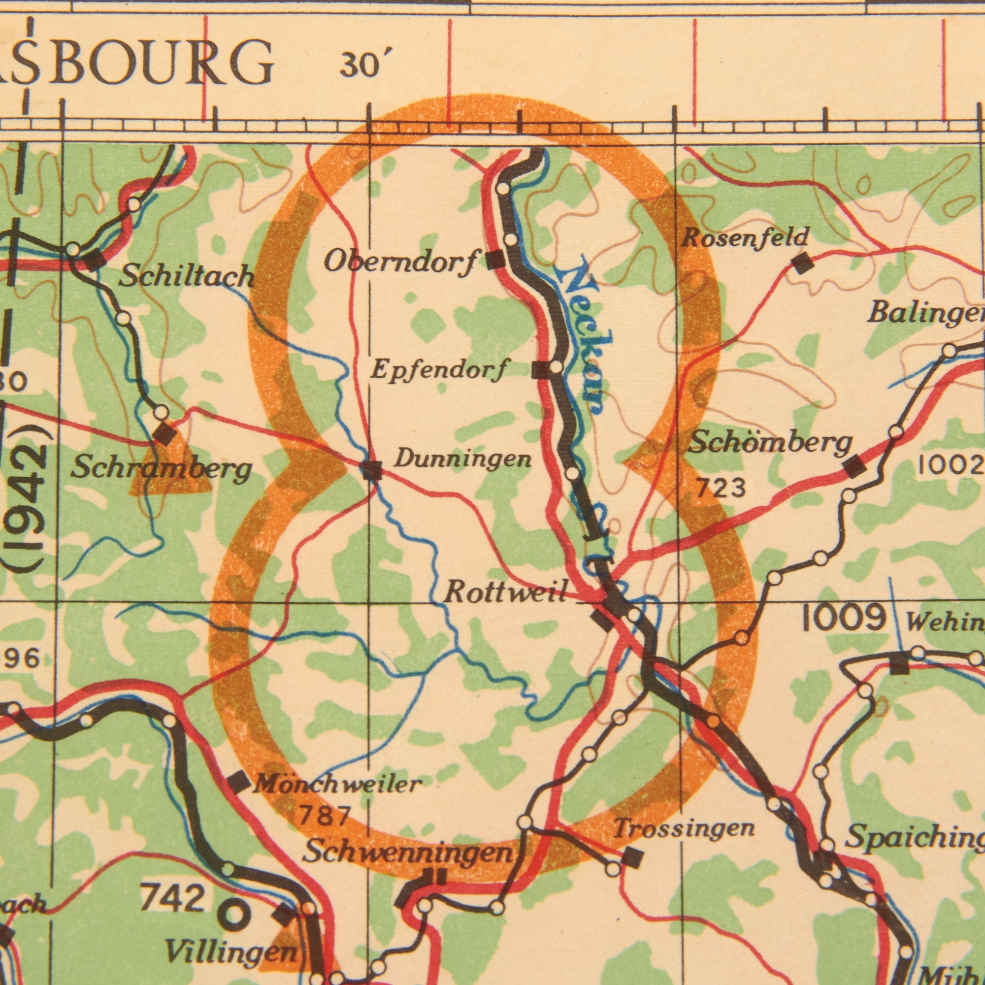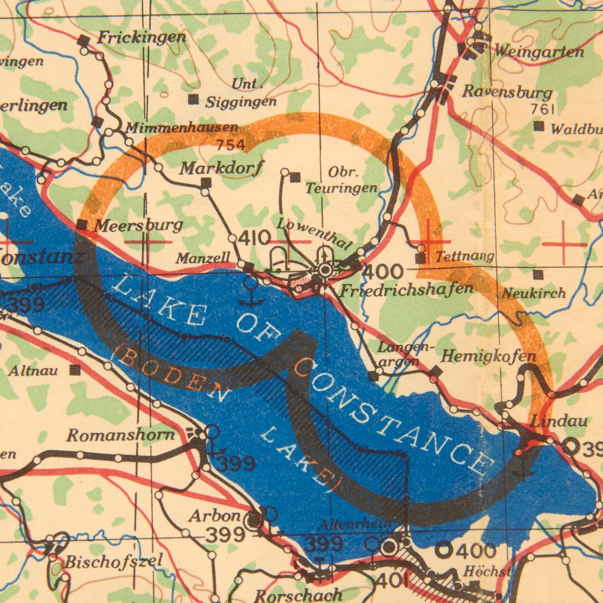 Original Item: Only One Available. This is a spectacular example of a rare Flak denses map of Bern, Switzerland on the German side of Lake Constance. The locations were compiled from all data collected up to March 11, 1945. The map is in wonderful condition but does show use and wear with hard creasing as well as tearing. Finding these maps in any condition is a rarity, but to find one in complete legible condition is not often found in today's market.