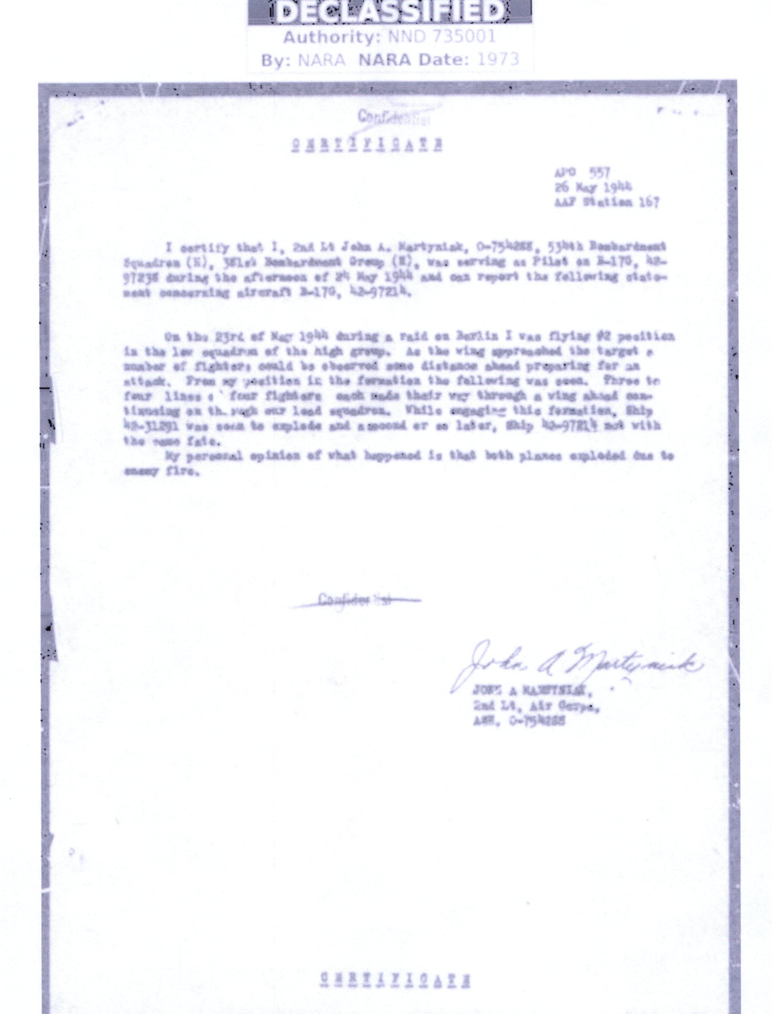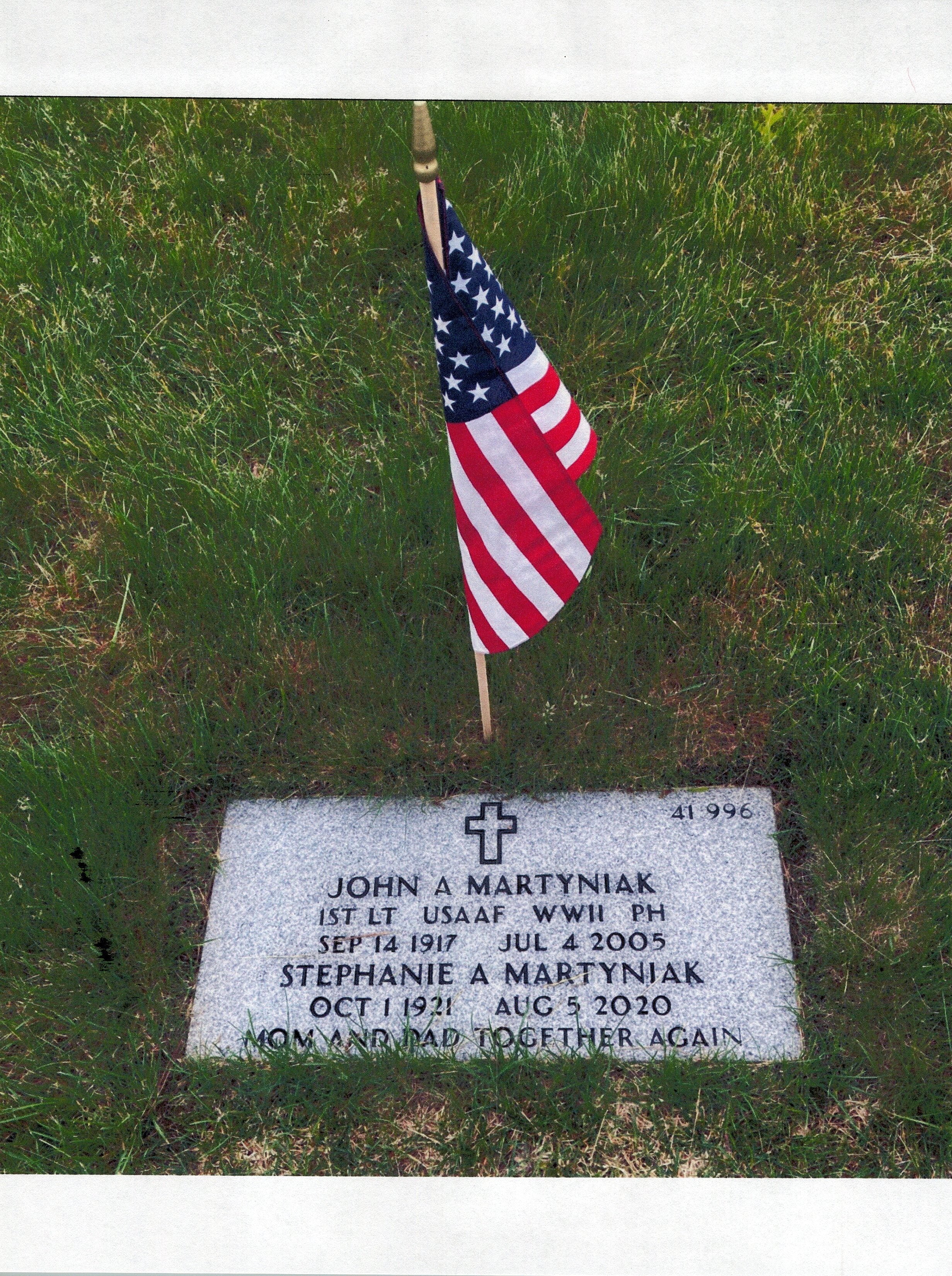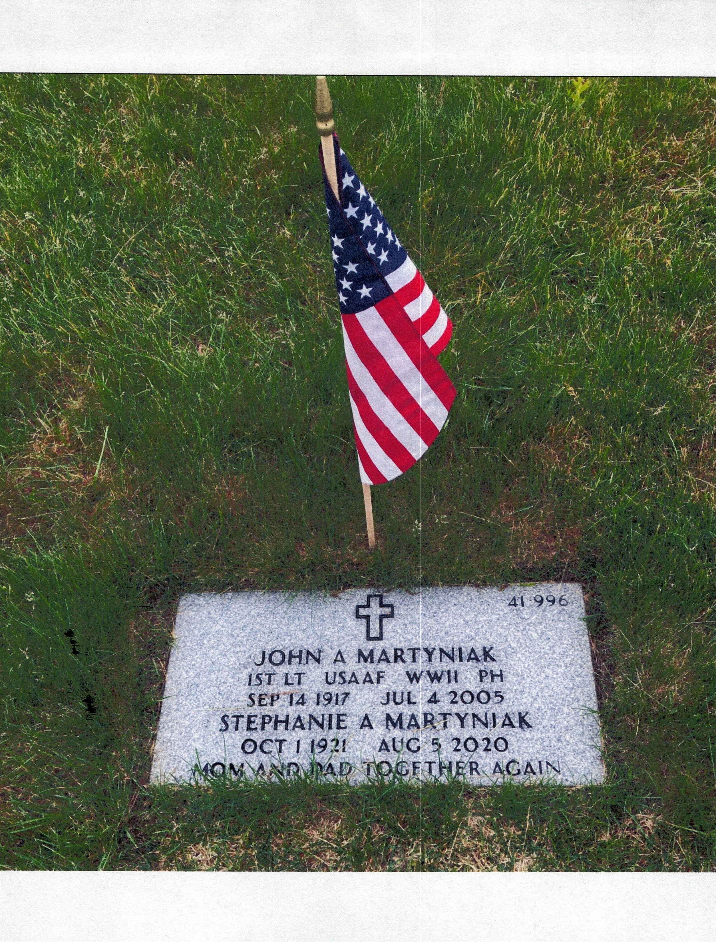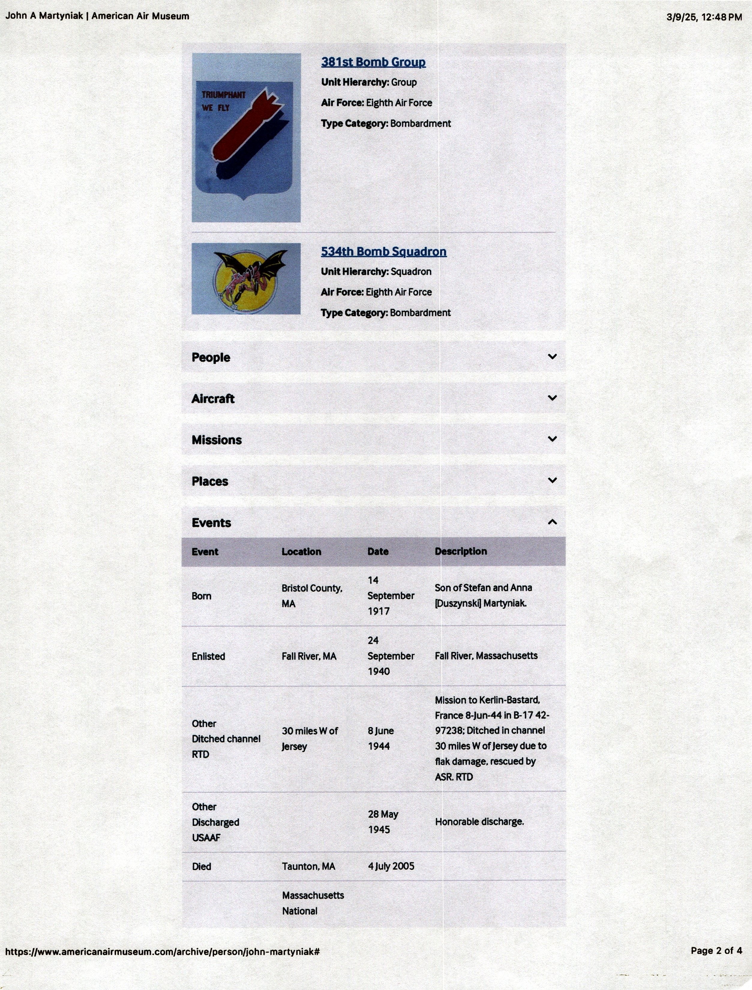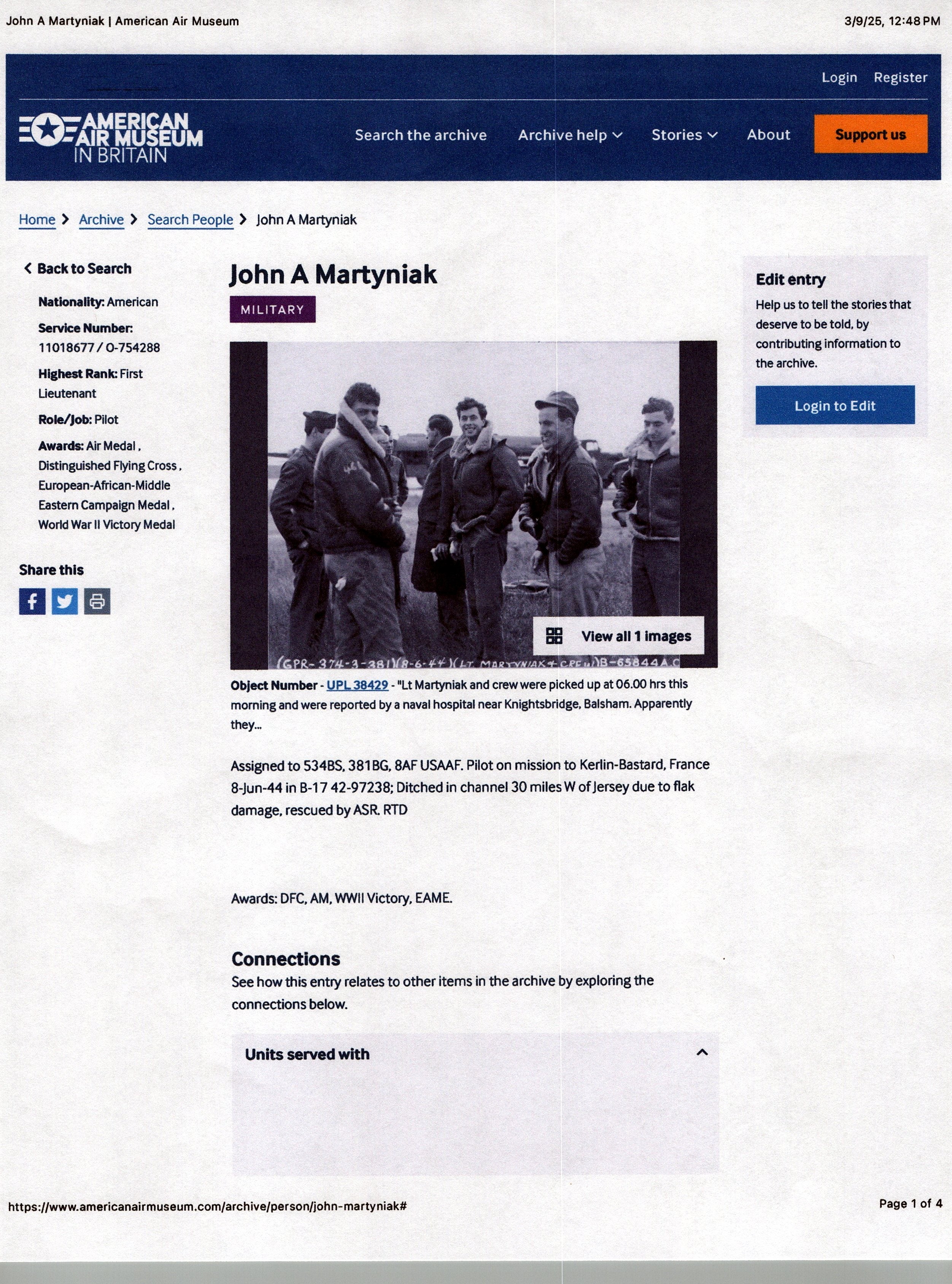 John Andrew Martyniak was born on September 14th, 1917 in Bristol, Massachusetts. He enlisted in the Army on September 24th, 1940, joining the Air Corps. He trained as a B-17 Pilot and was eventually commissioned as a Lieutenant. He traveled overseas and joined the 534th Bombardment Squadron, 381st Bombardment Group, 8th Air Force on April 6th, 1944. He bailed out of B-17 42-97238 30 miles west of Jersey on June 8th, 1944 after suffering flak damage, later joining the Goldfish Club. He was awarded the Distinguished Flying Cross as well as the Air Medal with four Oak Leaf Clusters. He returned home and worked as a refrigeration mechanic. He passed away on July 4th, 2005 at the age of 87.