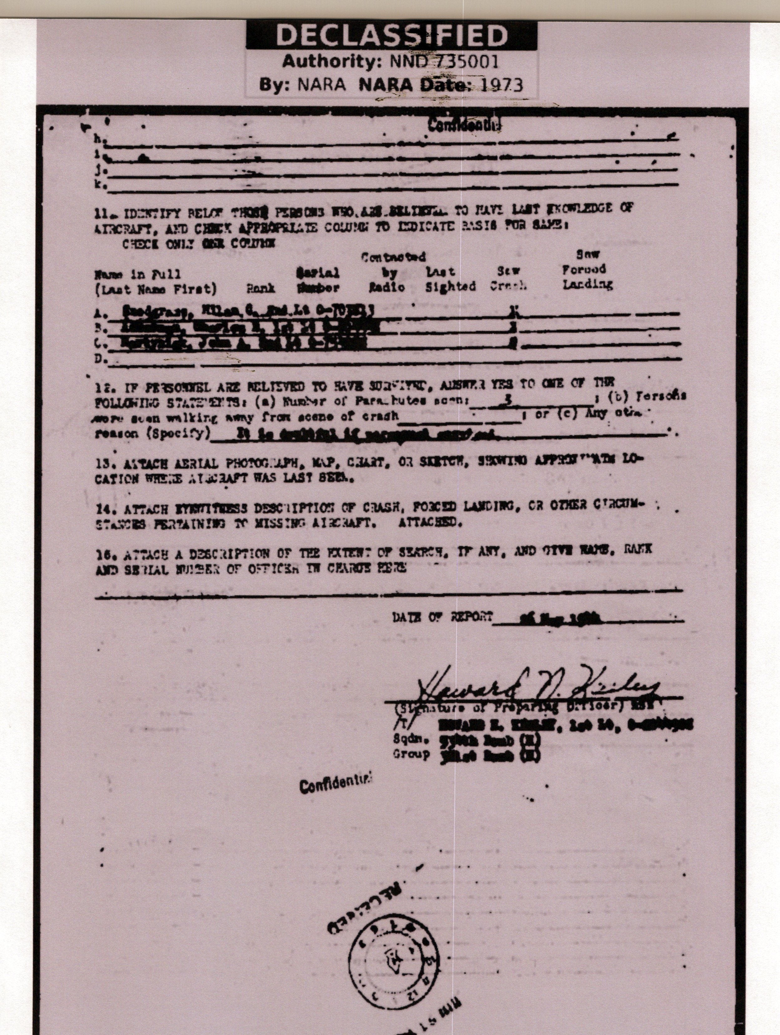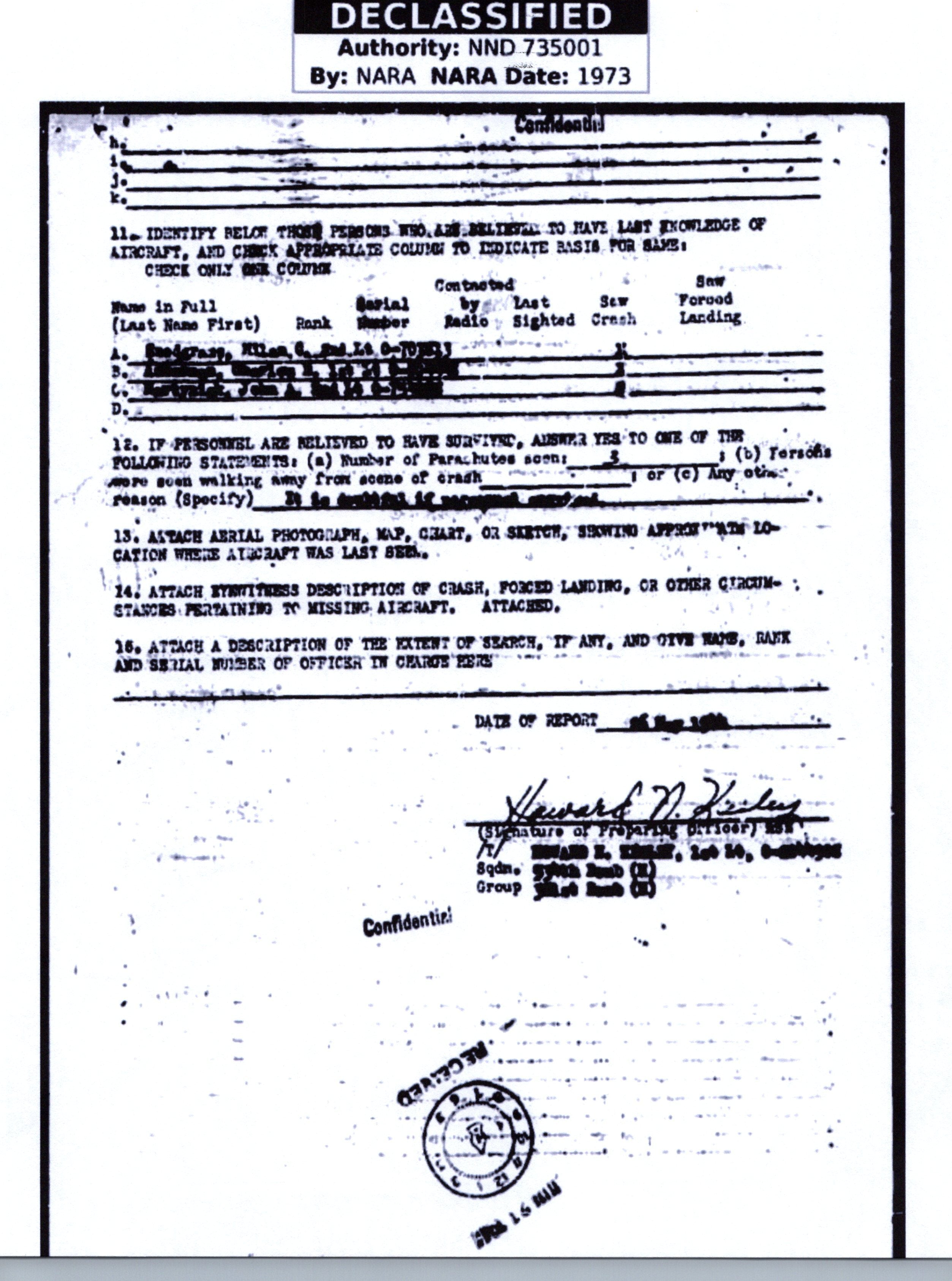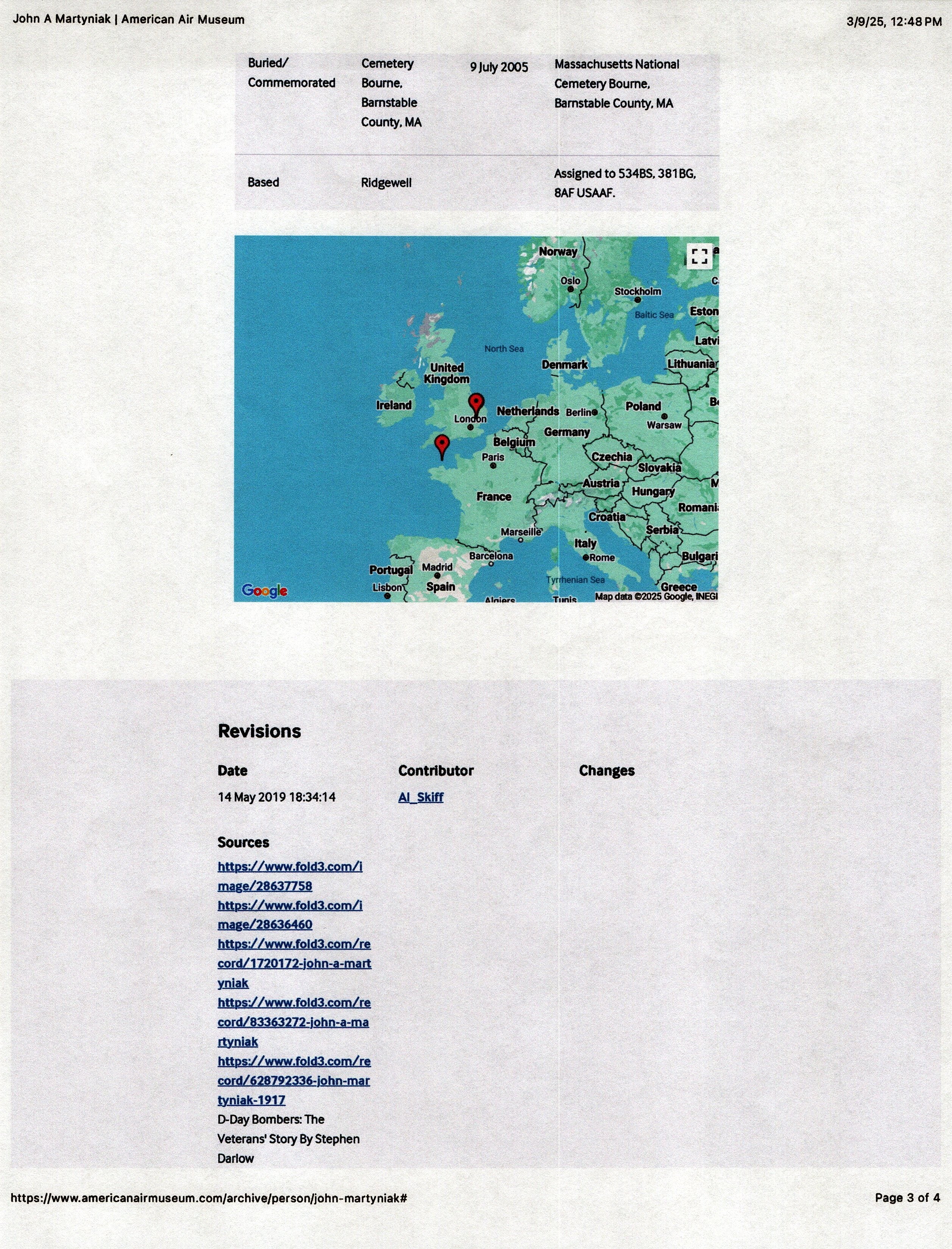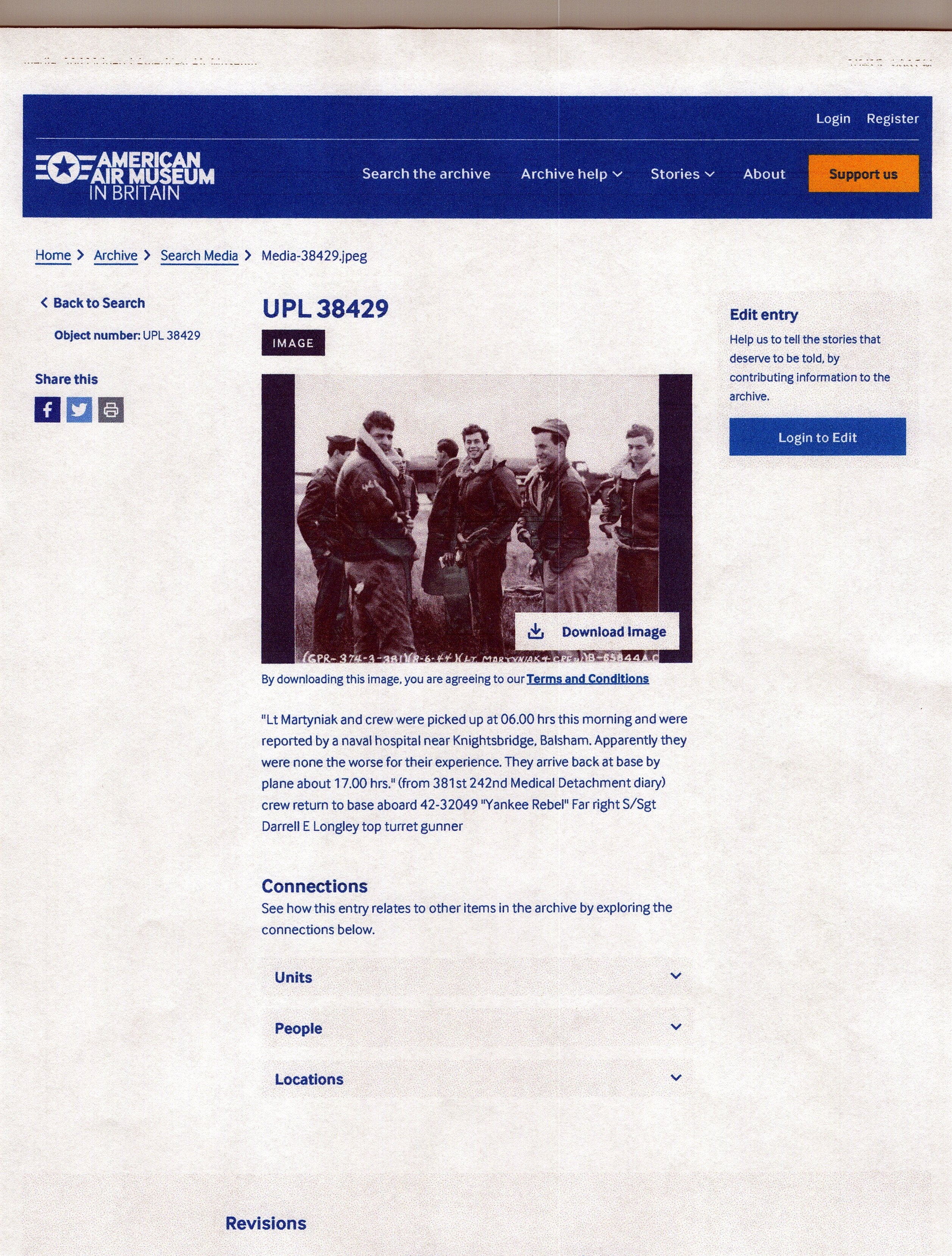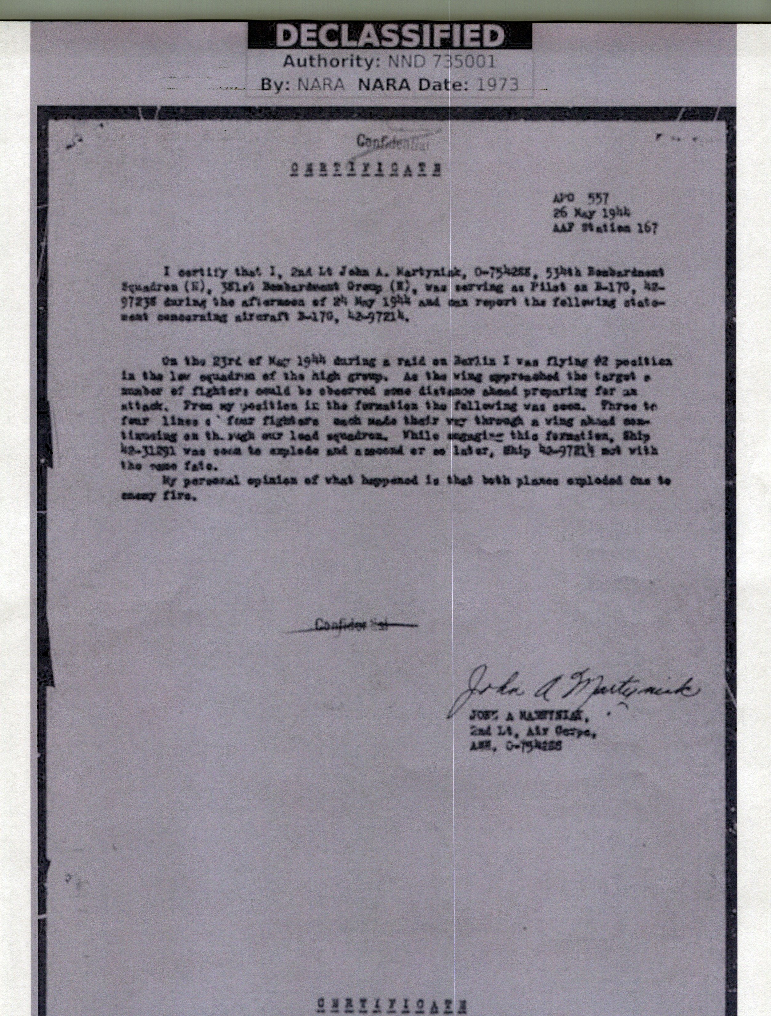 John Andrew Martyniak was born on September 14th, 1917 in Bristol, Massachusetts. He enlisted in the Army on September 24th, 1940, joining the Air Corps. He trained as a B-17 Pilot and was eventually commissioned as a Lieutenant. He traveled overseas and joined the 534th Bombardment Squadron, 381st Bombardment Group, 8th Air Force on April 6th, 1944. He bailed out of B-17 42-97238 30 miles west of Jersey on June 8th, 1944 after suffering flak damage, later joining the Goldfish Club. He was awarded the Distinguished Flying Cross as well as the Air Medal with four Oak Leaf Clusters. He returned home and worked as a refrigeration mechanic. He passed away on July 4th, 2005 at the age of 87.