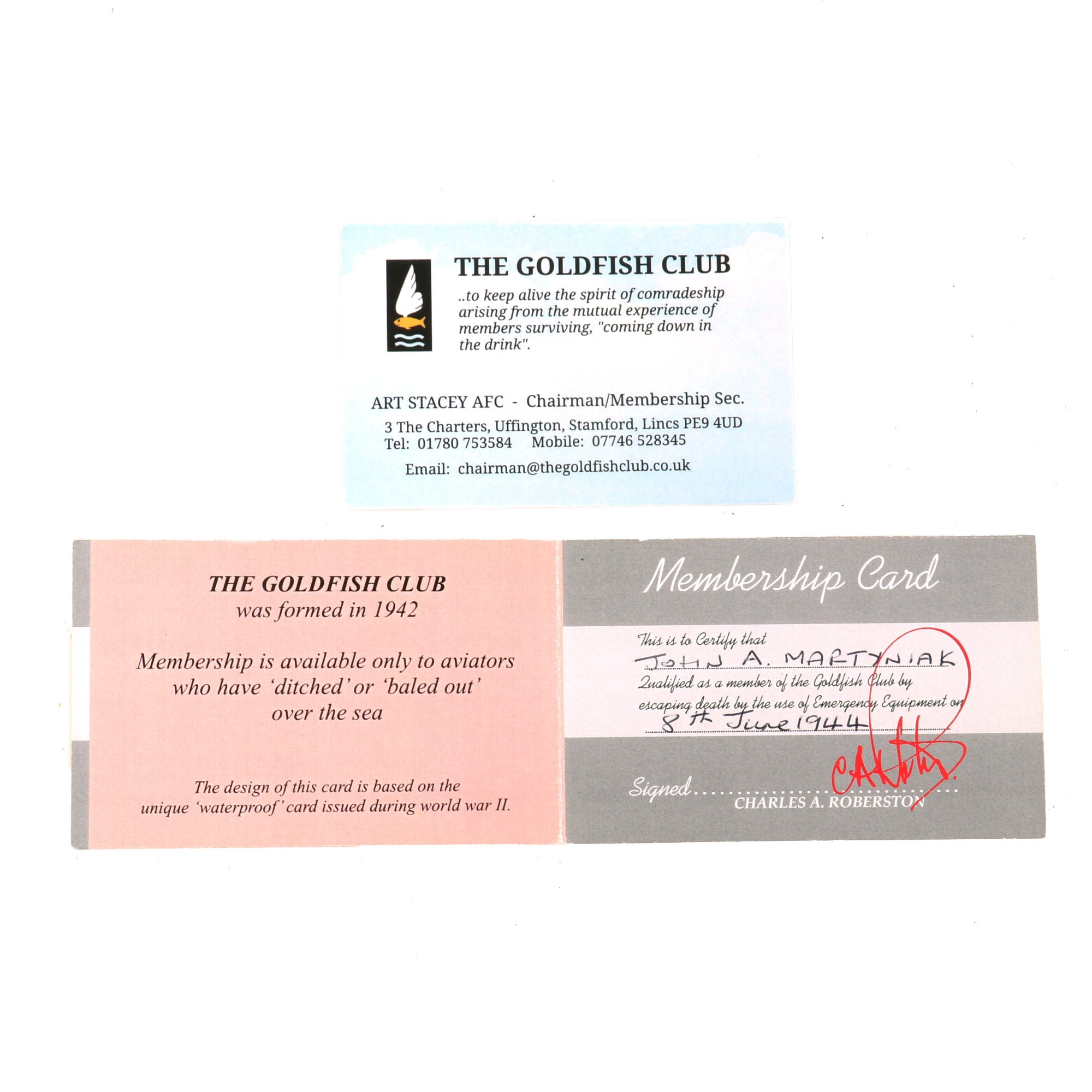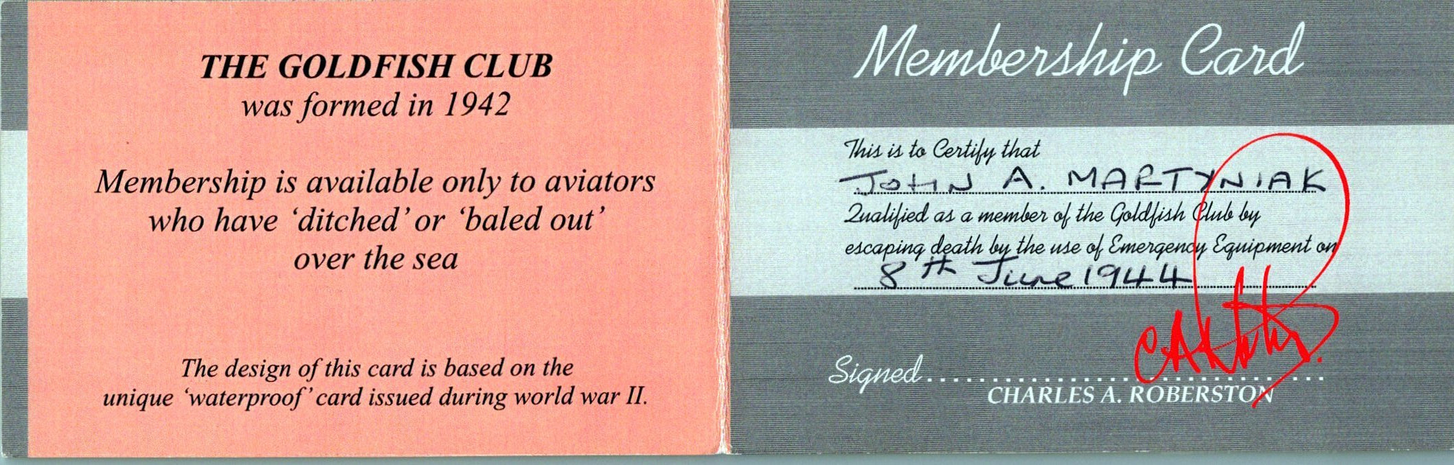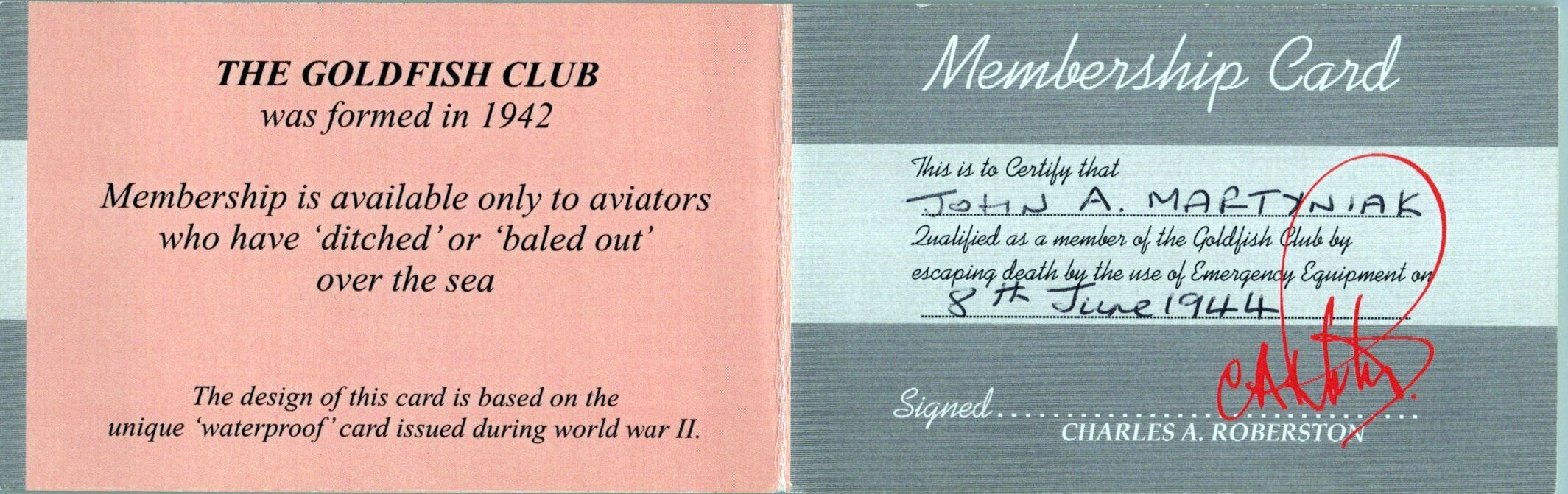- Martyniak’s Goldfish Club membership card with his name and date of bailing out.