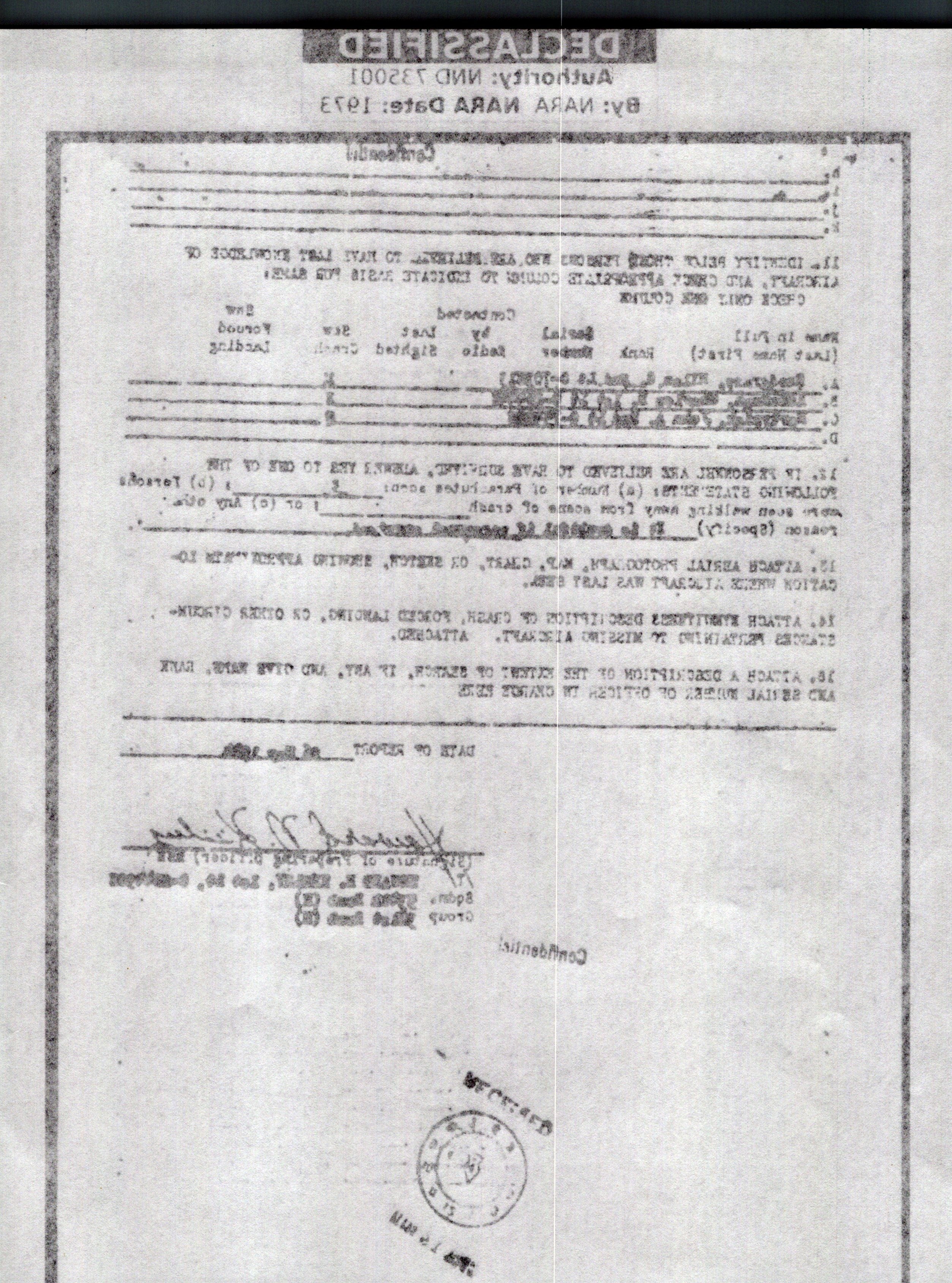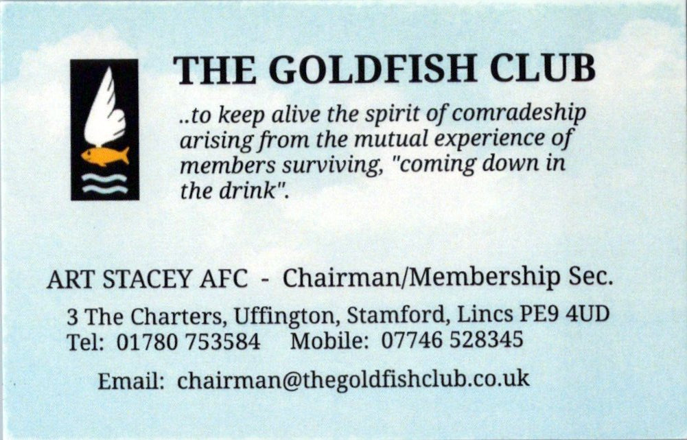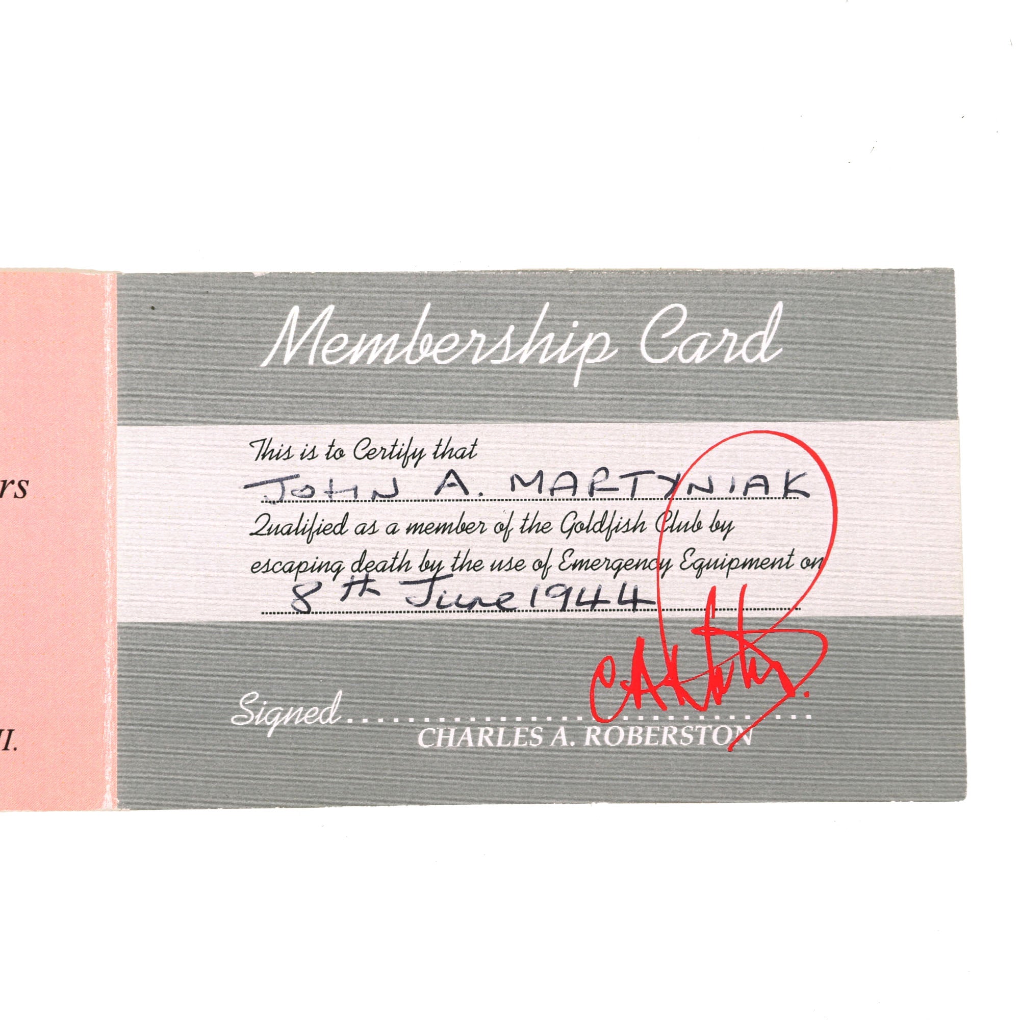 - Martyniak’s Goldfish Club membership card with his name and date of bailing out.