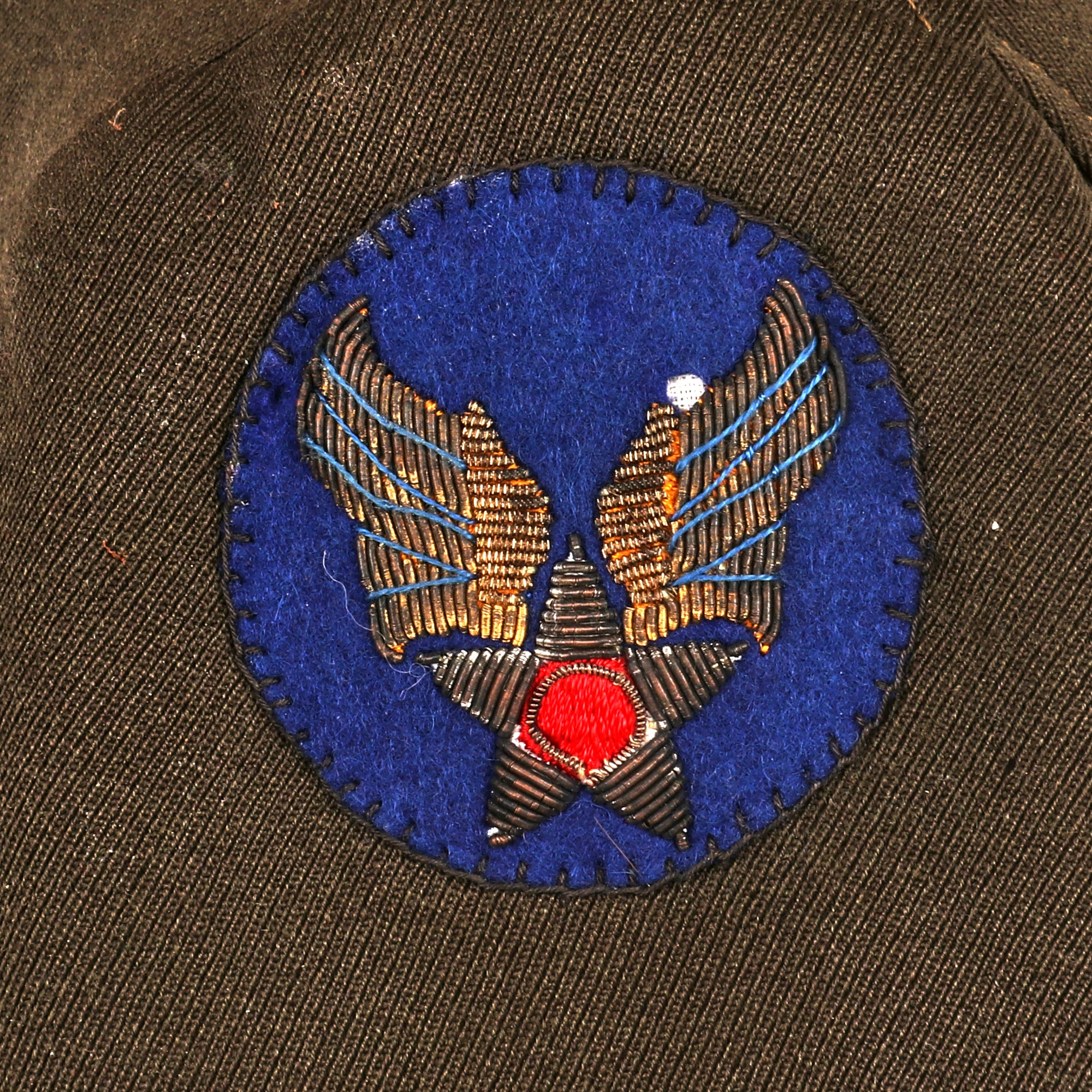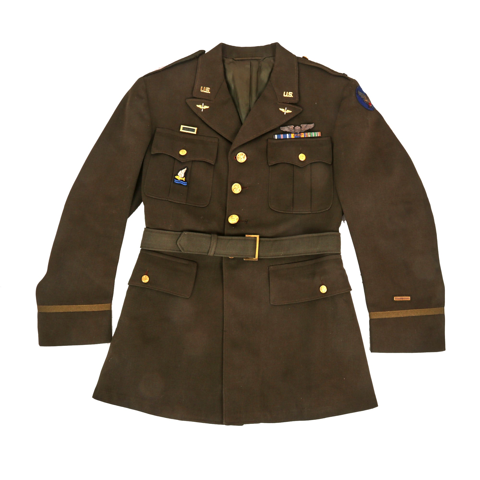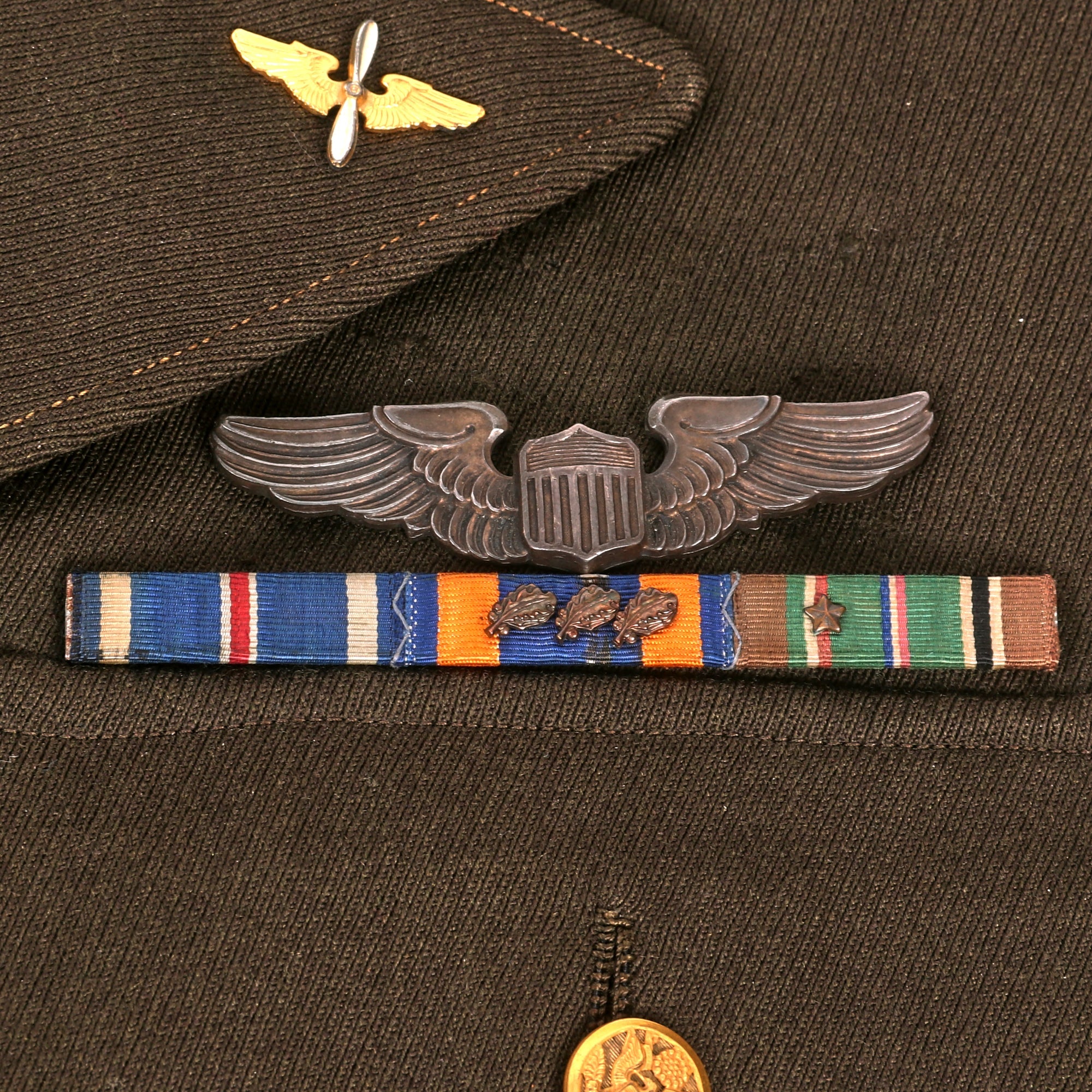 - Martyniak’s Army officer’s uniform jacket with 1st Lieutenant bars on the shoulders, a gorgeous bullion Army Air Forces patch on the left shoulder, one overseas stripe on the left cuff, US & Aviation collar insignia, a set of Sterling Pilot’s wings over a 3-place ribbon bar with the Distinguished Flying Cross, Air Medal with three OLCs, and the European-African-Middle Eastern Campaign ribbon with one star. Above the right breast pocket is a Presidential Unit Citation, and on the pocket is an extremely scare British-made Goldfish Club patch hand-stitched on. This is certainly the rarest aspect of the group.