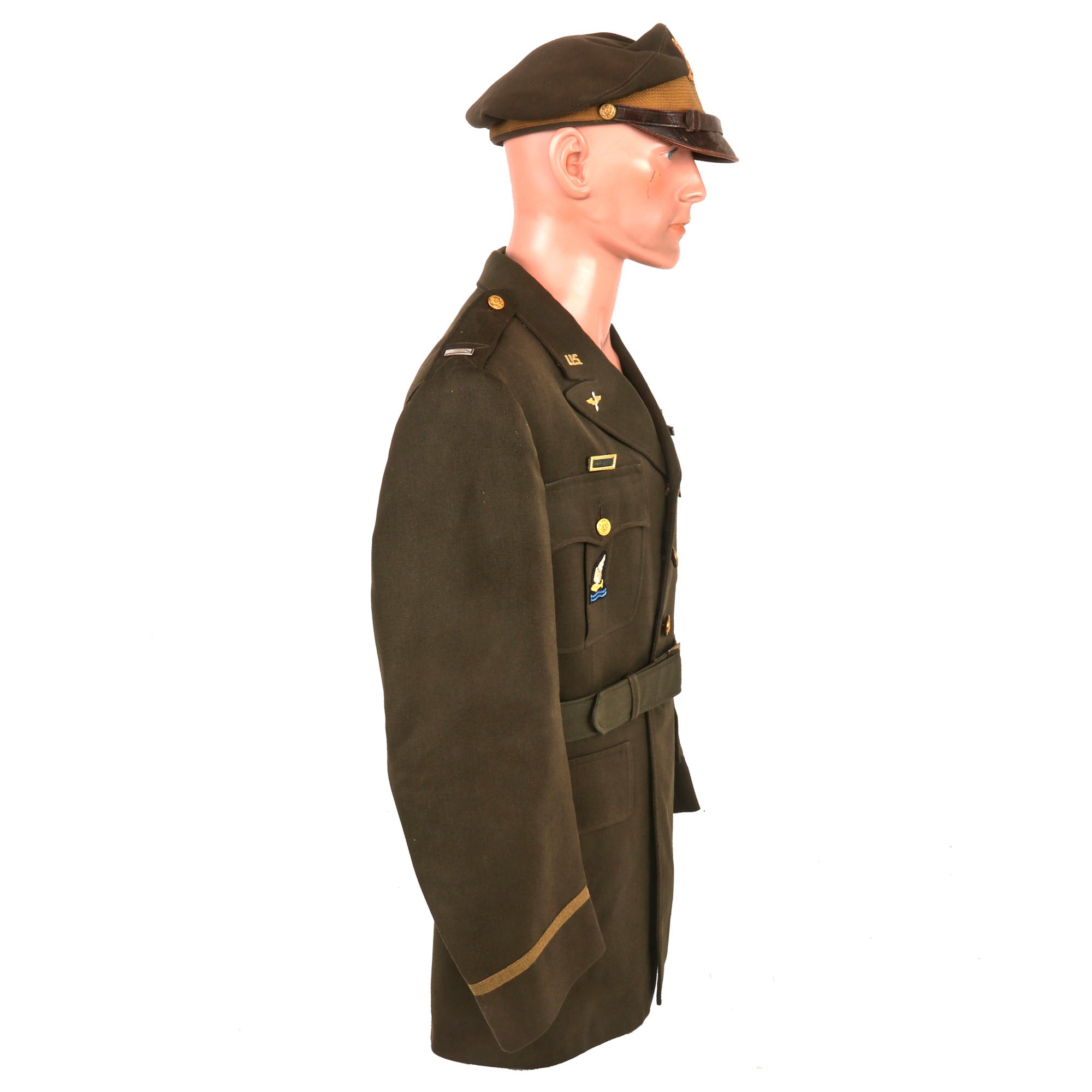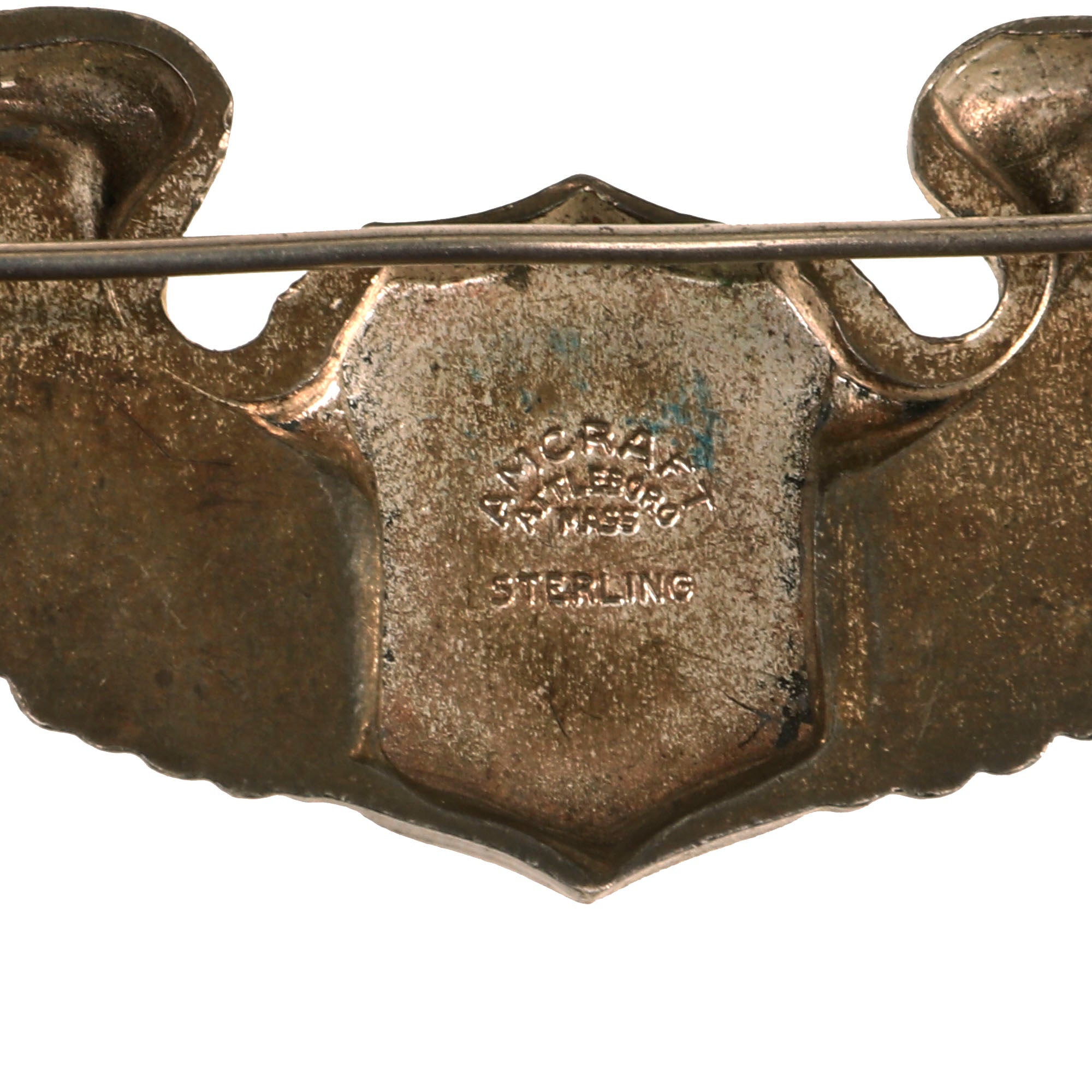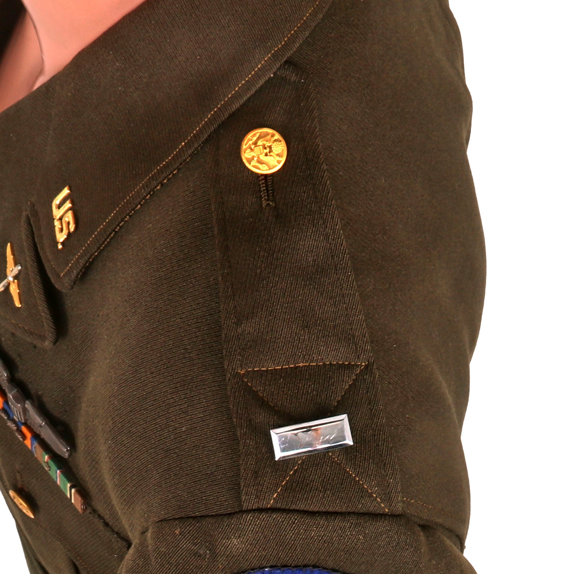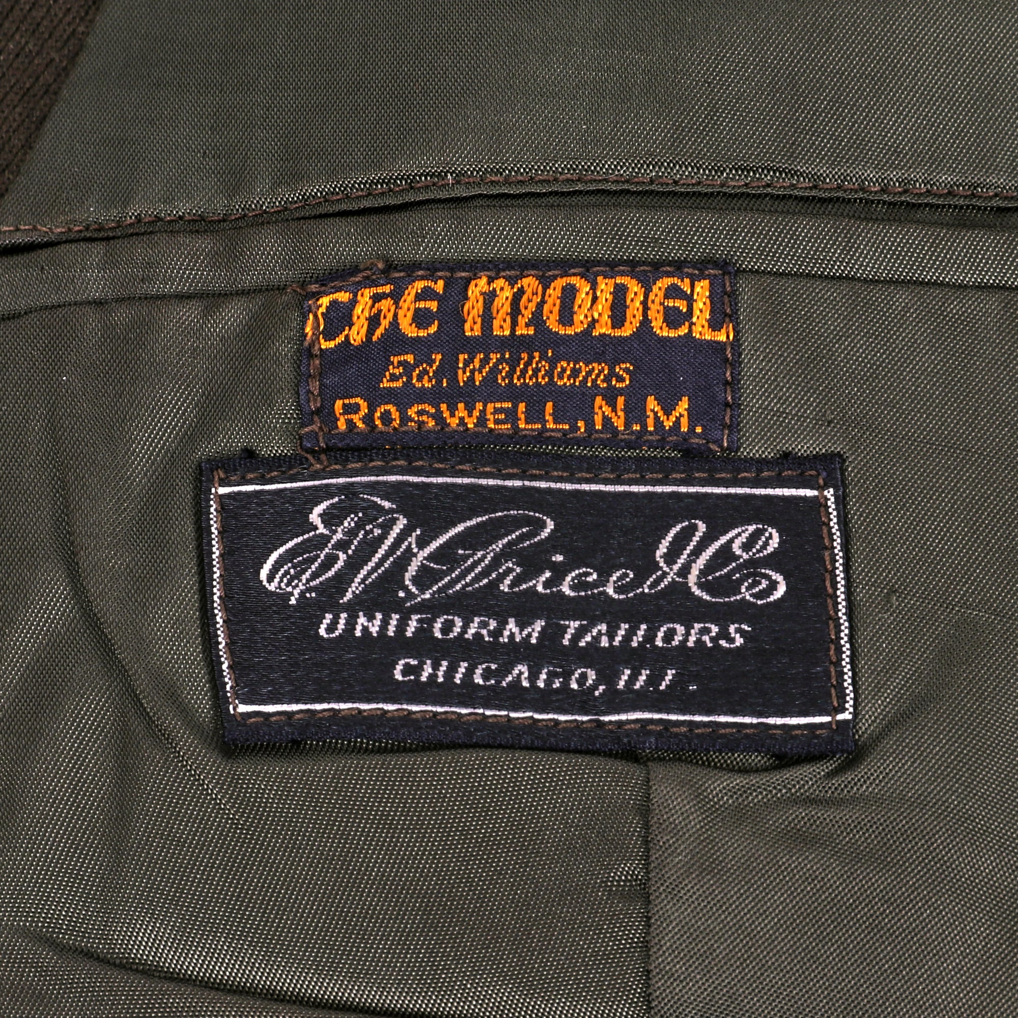 - Martyniak’s Army officer’s uniform jacket with 1st Lieutenant bars on the shoulders, a gorgeous bullion Army Air Forces patch on the left shoulder, one overseas stripe on the left cuff, US & Aviation collar insignia, a set of Sterling Pilot’s wings over a 3-place ribbon bar with the Distinguished Flying Cross, Air Medal with three OLCs, and the European-African-Middle Eastern Campaign ribbon with one star. Above the right breast pocket is a Presidential Unit Citation, and on the pocket is an extremely scare British-made Goldfish Club patch hand-stitched on. This is certainly the rarest aspect of the group.