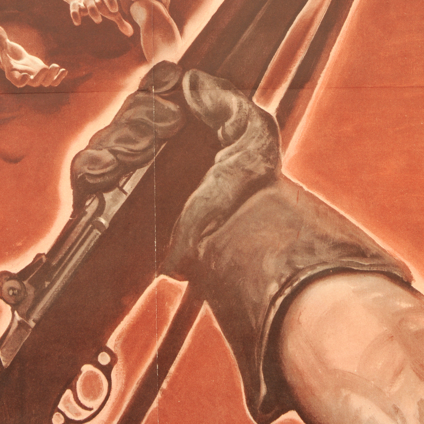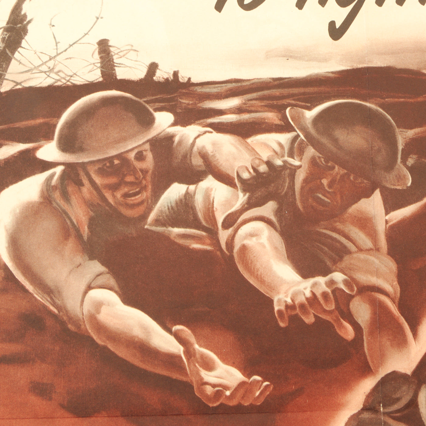 This 20” x 14” poster with artwork by John Falter in 1942, features two soldiers wearing the doughboy style helmets reaching for an M1 Garand rifle from a foxhole. The M1 is being held out towards the soldiers, both with a look of desperation on their faces.