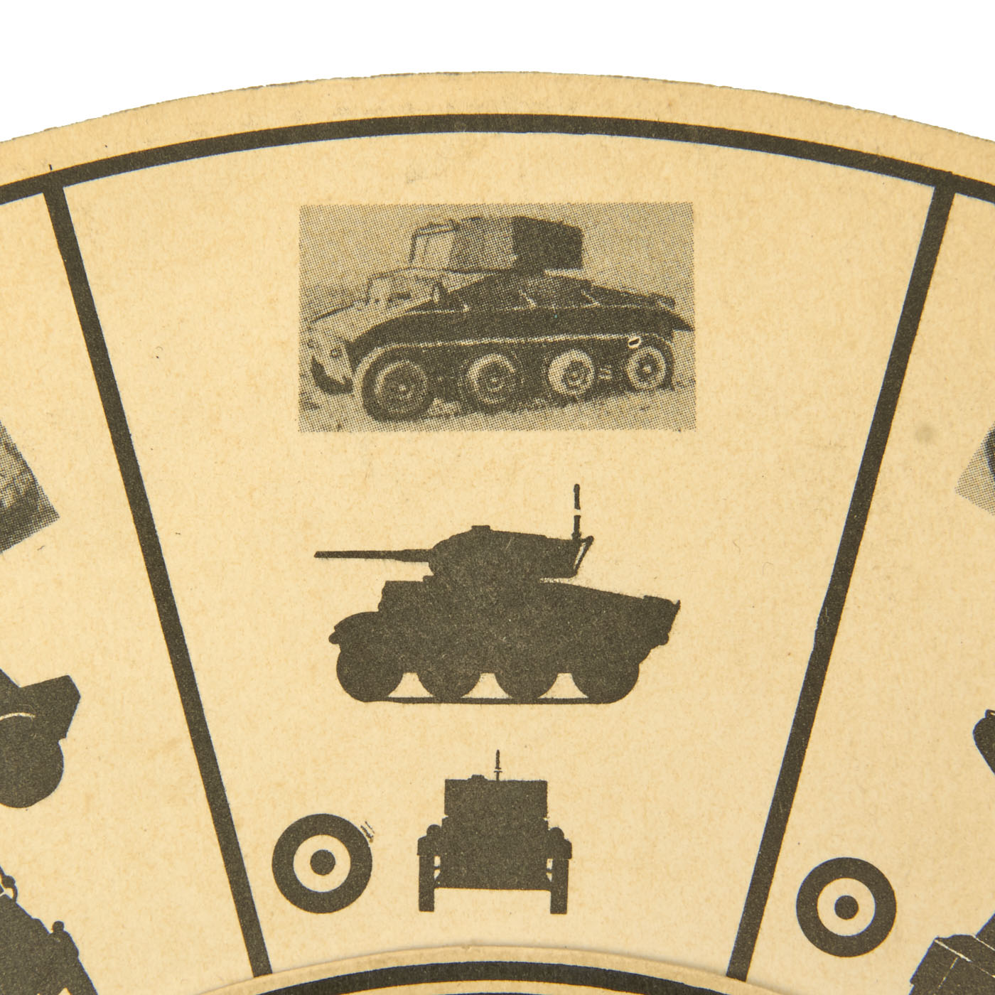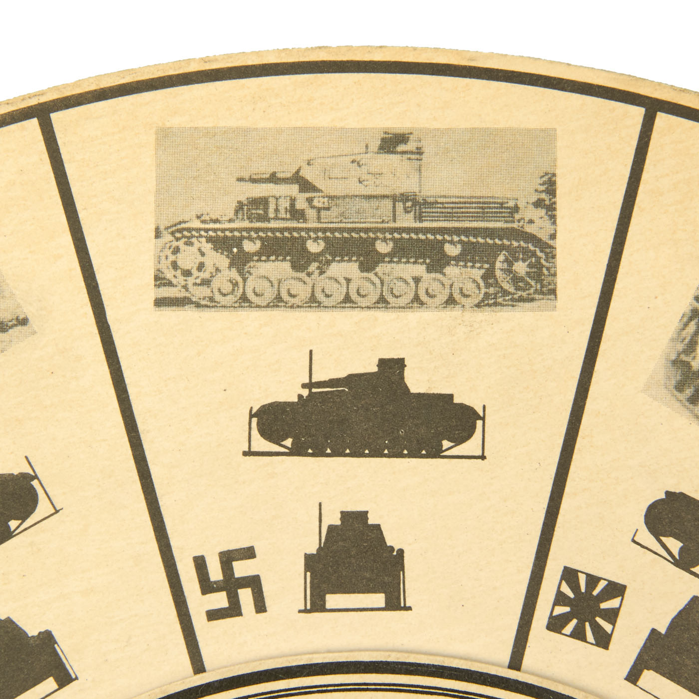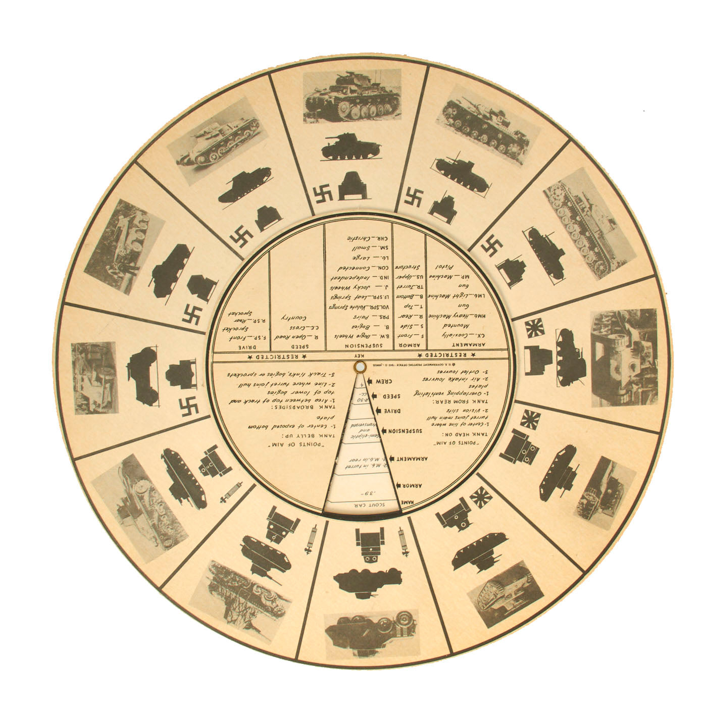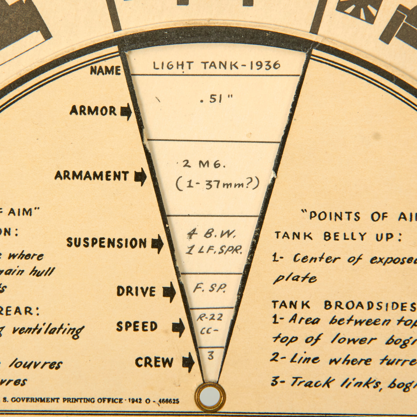Original Item: Only One Available. Understanding your country’s own armor capabilities and armaments is one thing, to know about your enemy’s is a game changer. This chart was printed during WWII by the Government Printing Office to help civilians and the military in identifying the threat and capabilities of enemy vehicles. Homefront life during wars as big of a scale as both WW1 and WW2 was terrifying, it’s important to distinguish between friend and foe. For replacements being sent to Europe and the Pacific, this wheel would have been a great reference tool for them, to help them get “spun” up on the enemy armor and armament situation.