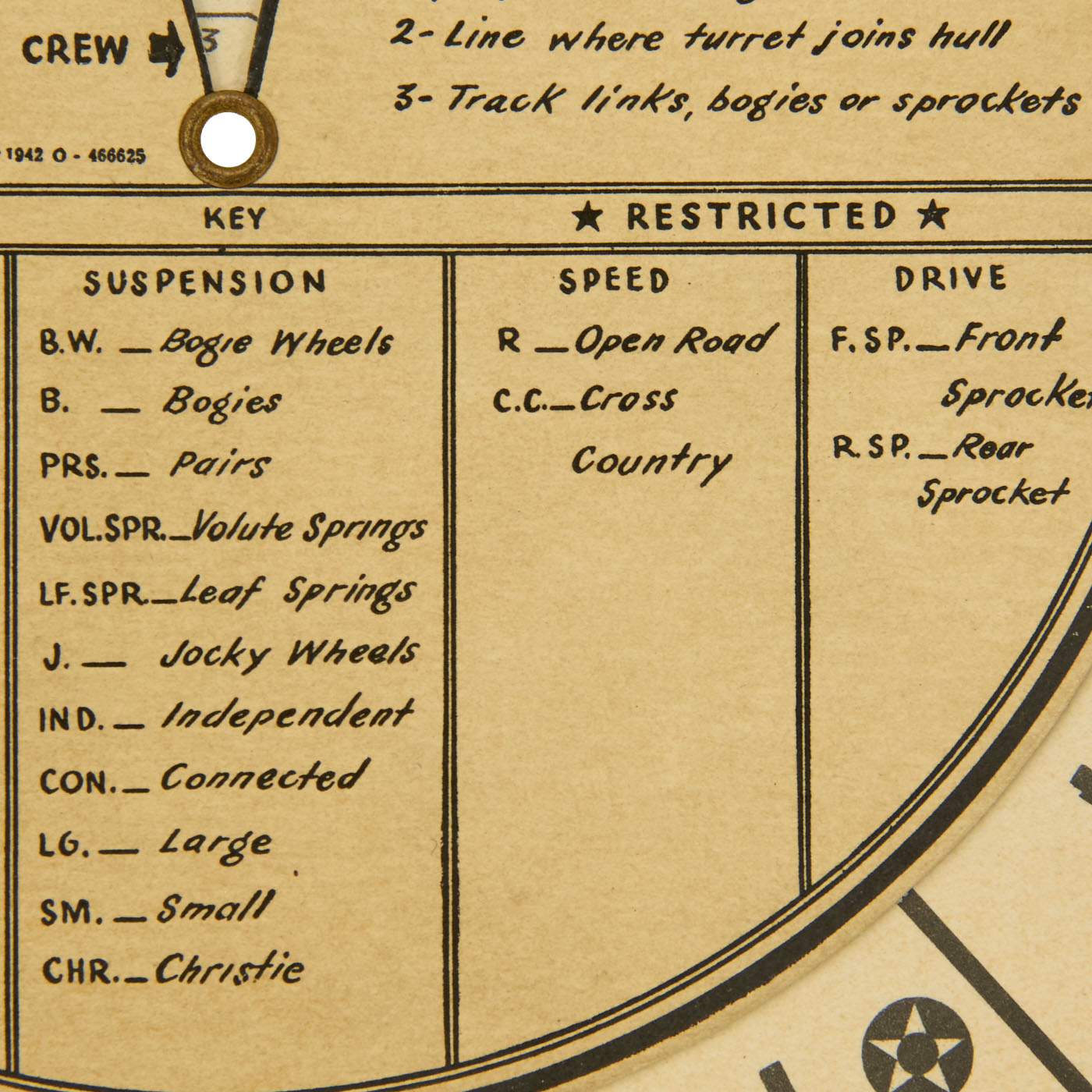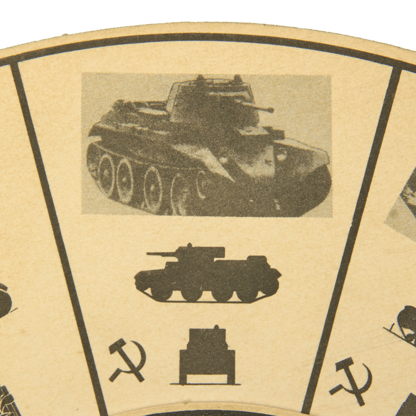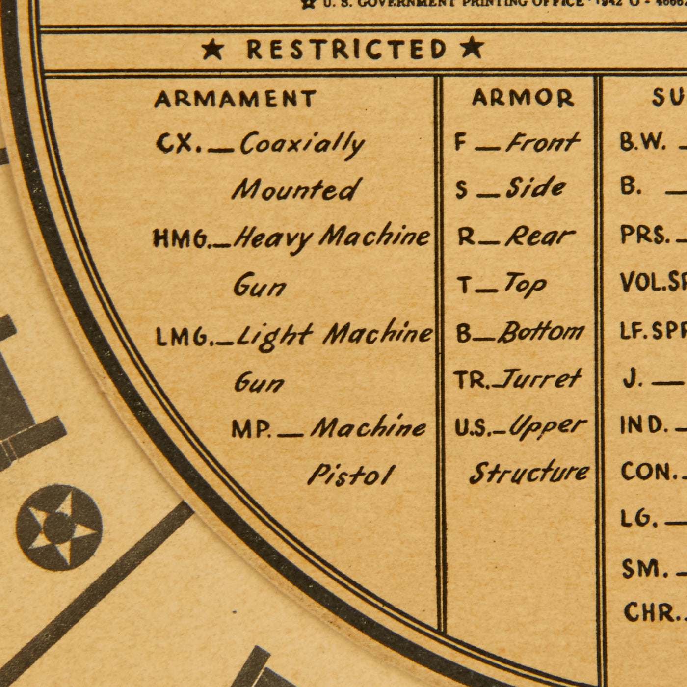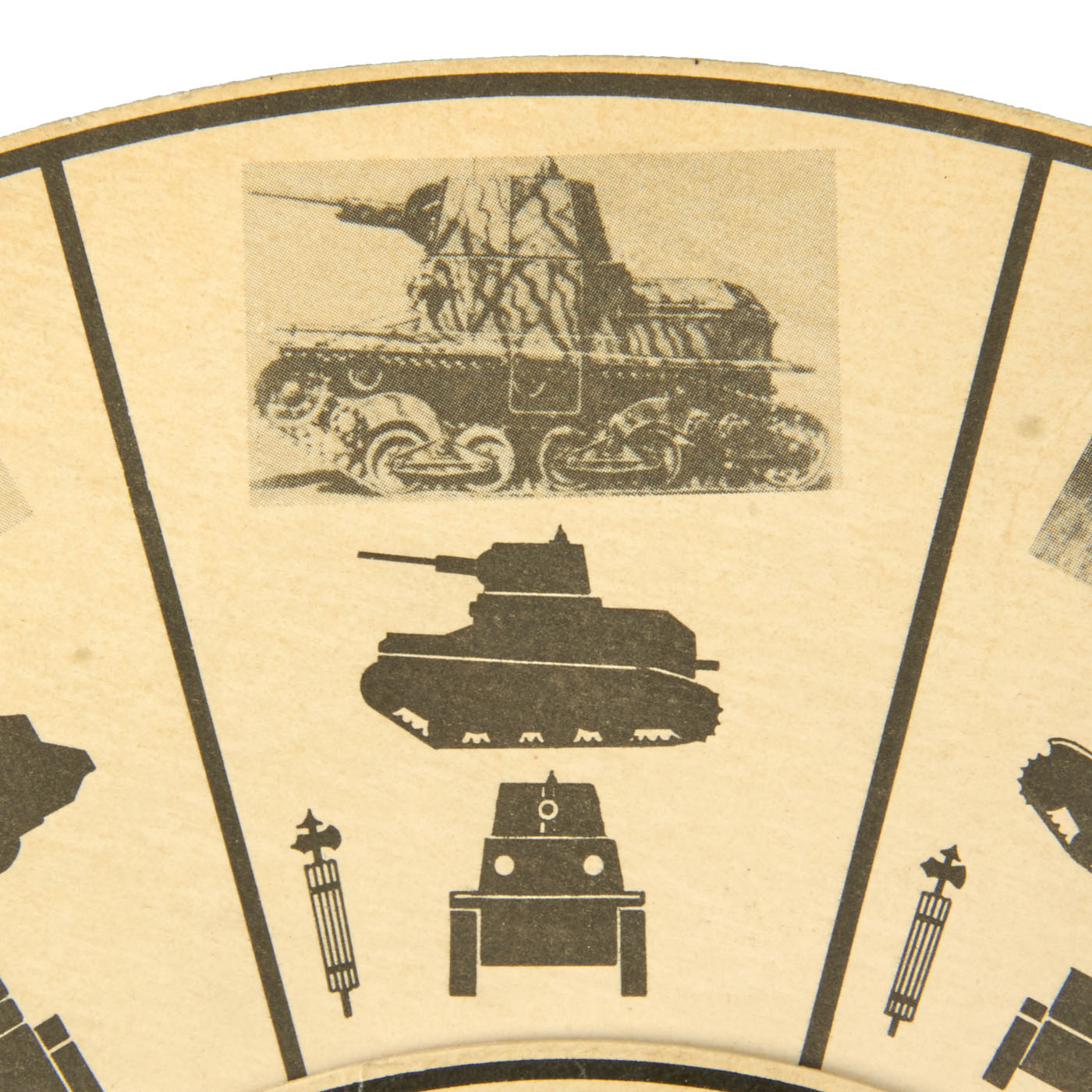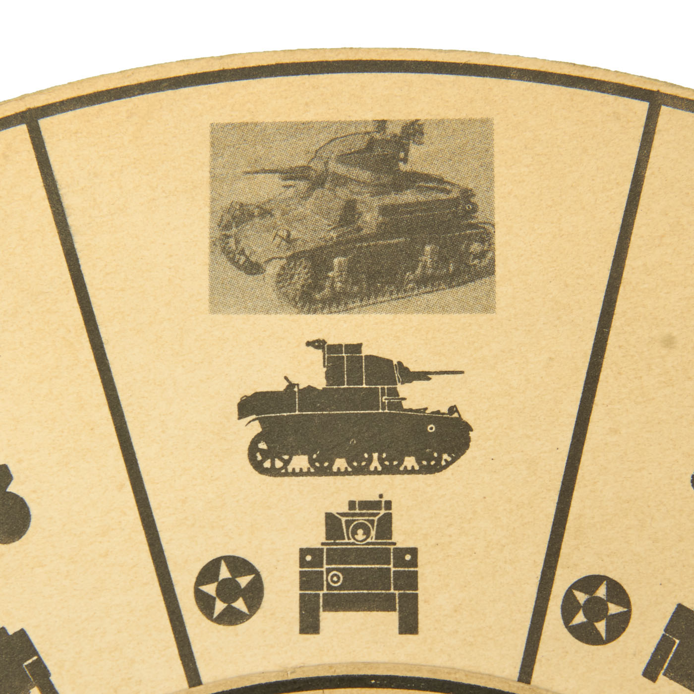 Original Item: Only One Available. Understanding your country’s own armor capabilities and armaments is one thing, to know about your enemy’s is a game changer. This chart was printed during WWII by the Government Printing Office to help civilians and the military in identifying the threat and capabilities of enemy vehicles. Homefront life during wars as big of a scale as both WW1 and WW2 was terrifying, it’s important to distinguish between friend and foe. For replacements being sent to Europe and the Pacific, this wheel would have been a great reference tool for them, to help them get “spun” up on the enemy armor and armament situation.