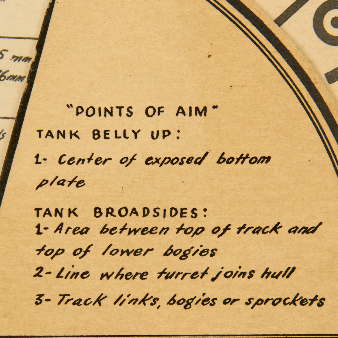 The center wheel also gives the user “POINTS OF AIM” for taking a tank head on and “POINTS OF AIM” for “belly up” shots. There is also a KEY at the bottom to help identify all the abbreviations present on the chart.