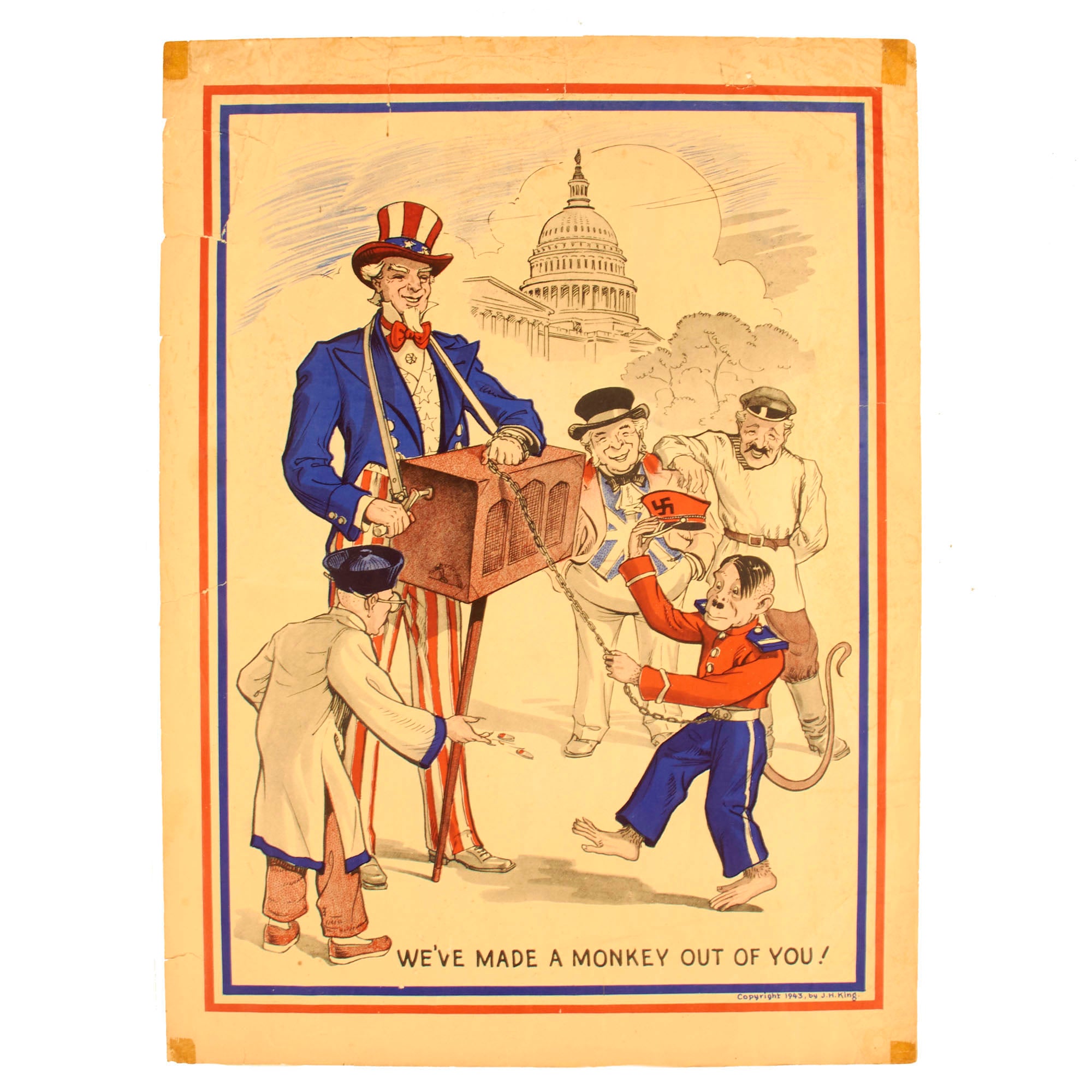 This World War II Propaganda poster features artwork by J. H. King (U.S. Government Printing Office, 1943). The masses greatly enjoyed this poster upon release, as it depicts Adolf H as a struggling organ grinder's monkey. John Bull, Joseph Stalin, and Chiang Kai-shek all stand amused, as Uncle Sam grinds the organ. The bottom of the poster has the caption “WE’VE MADE A MONKEY OUT OF YOU!”. An unrestored poster with good color and an overall very presentable appearance. It does have tears, slight paper loss, creases, and edge wear.