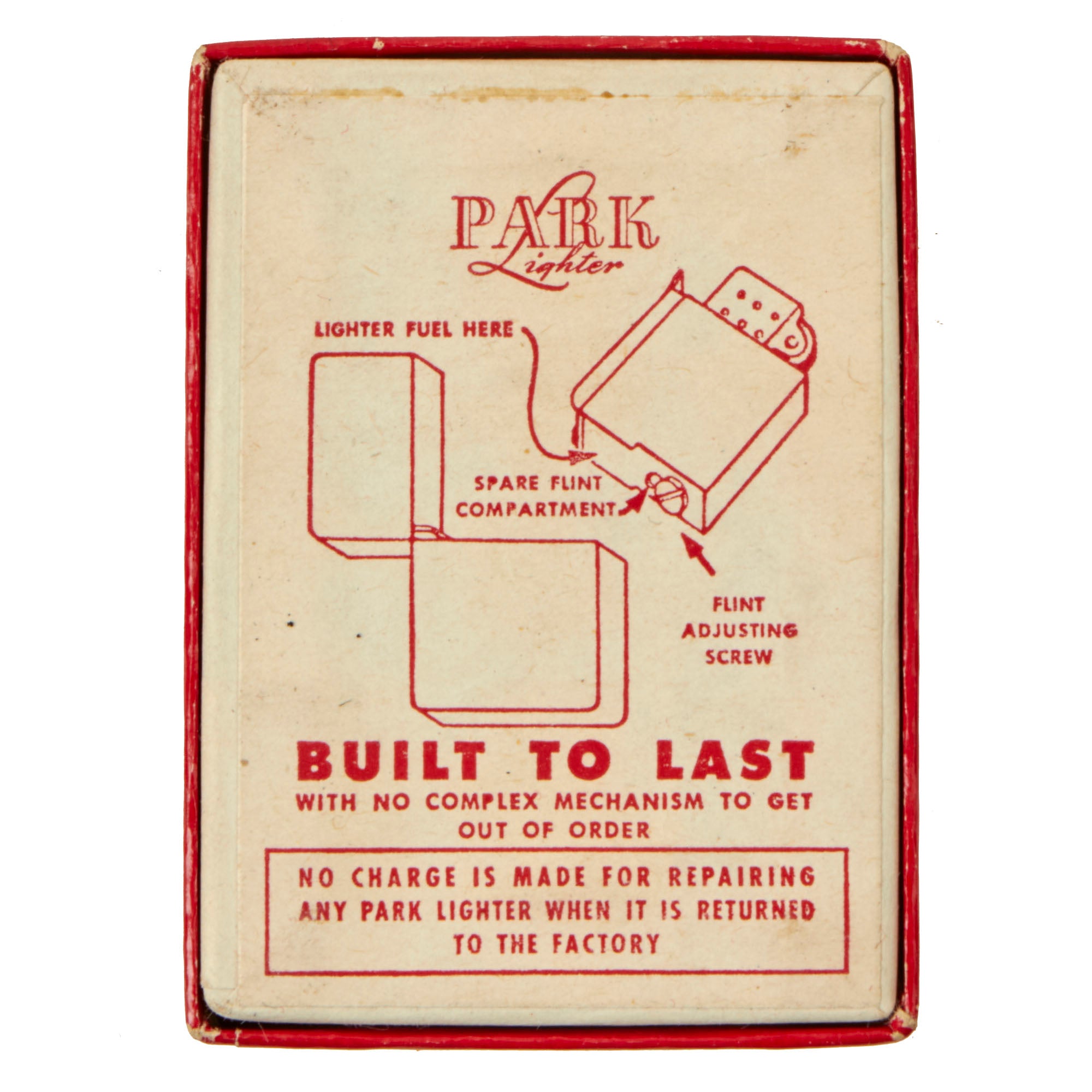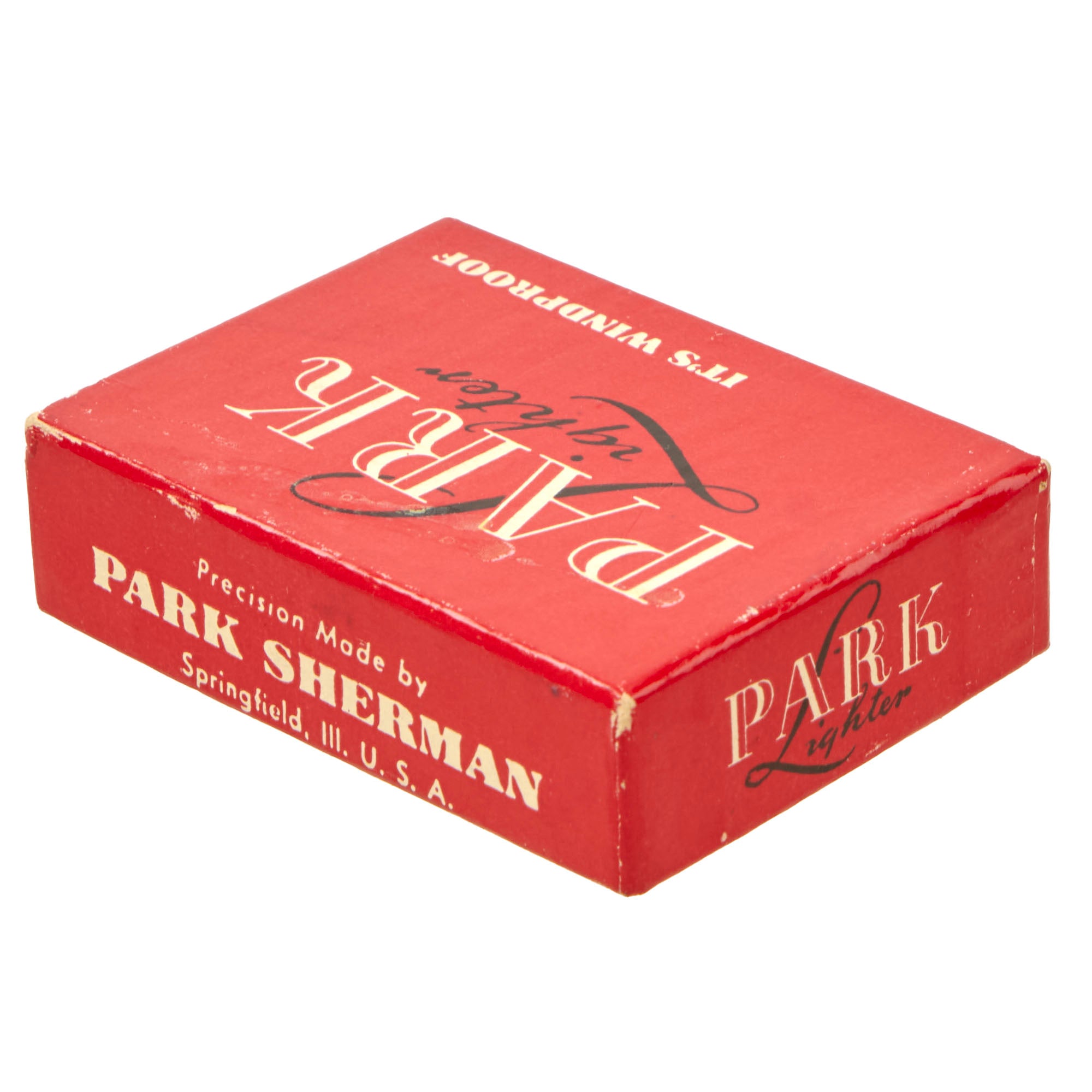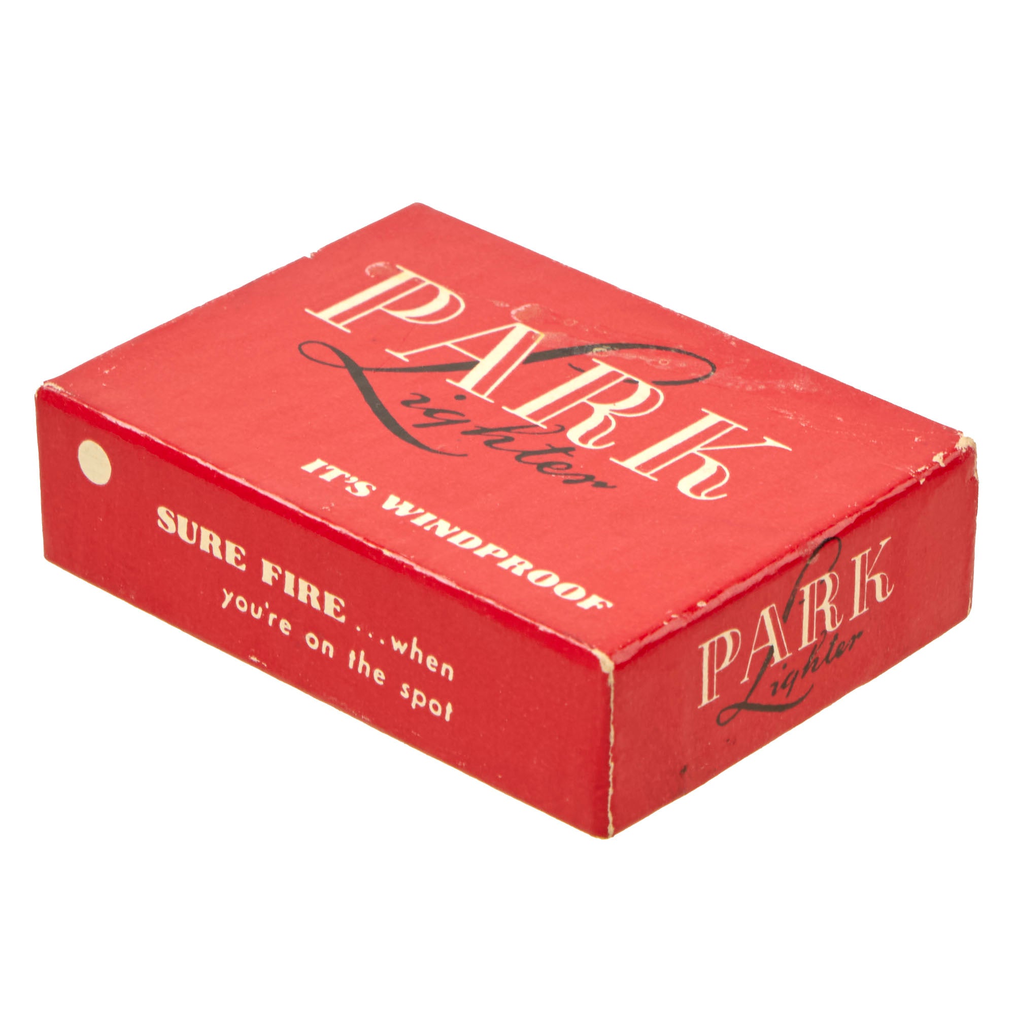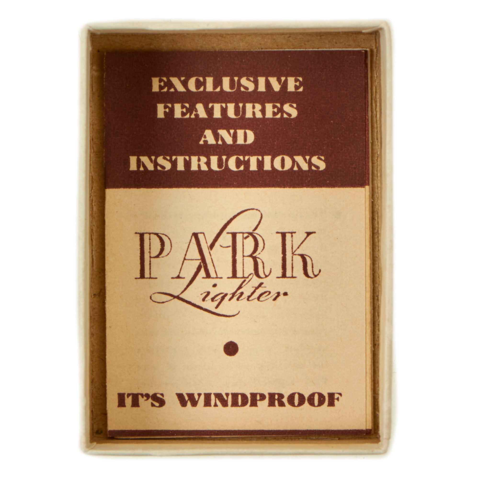 This lighter is a lovely example by Park in its original box. The lighter is mint and still sparks very well, a good example that could still be used today! The box even retains the instructions sheets. The box measures 2½ x 1⅞ x ¾”.