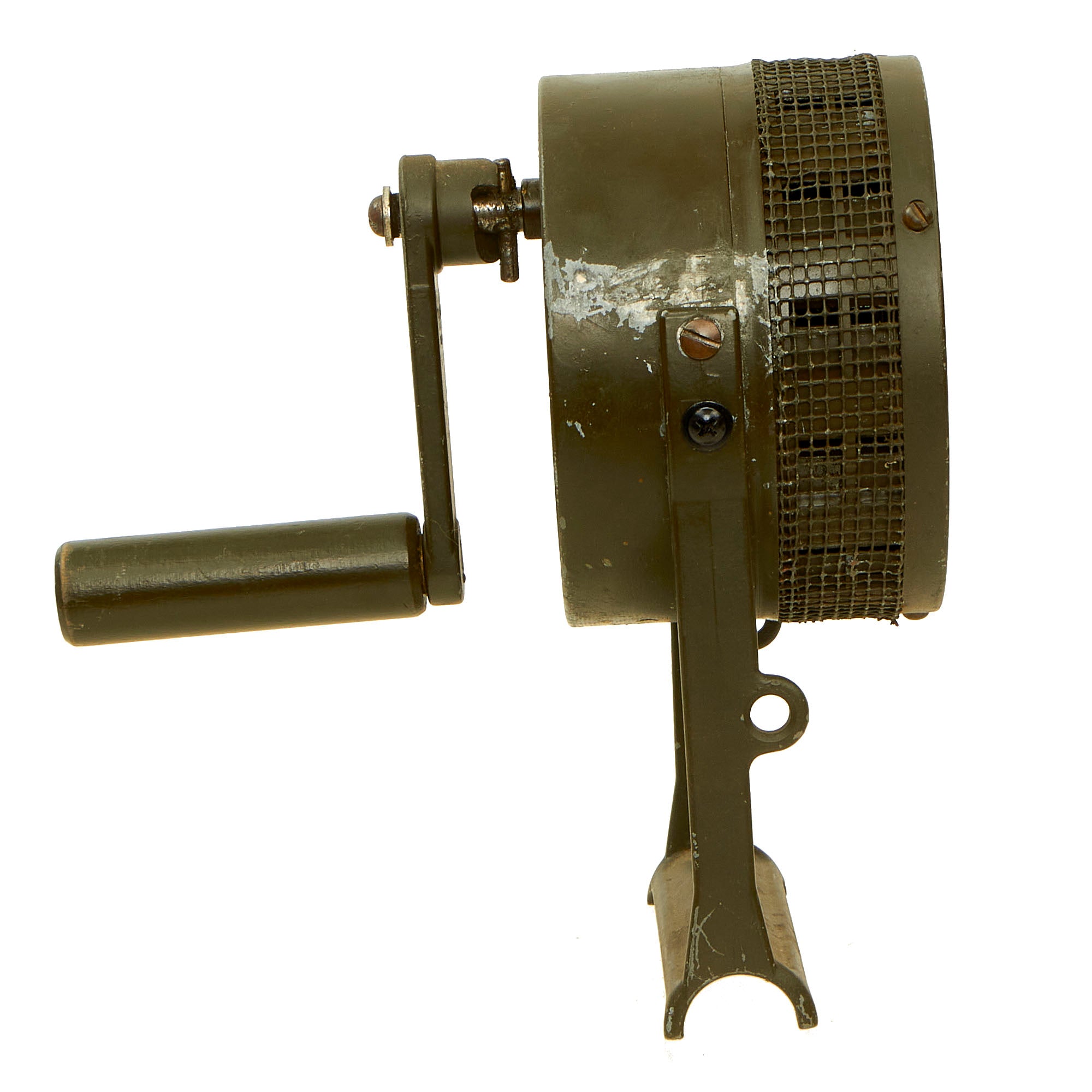 Constructed predominantly of aluminum with integral one piece carry handle and crank handle. These were originally painted OD green, however the paint does not stick to the aluminum very well as it oxidizes, so often these are missing a lot of the paint. This example still has almost all of the original paint, with just a few areas of flaking. It also still has the cover and screen to protect the rotor, items that are often missing.