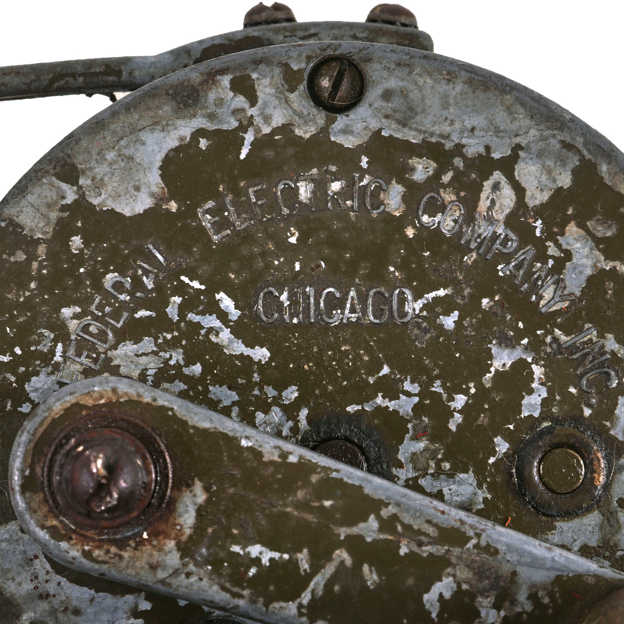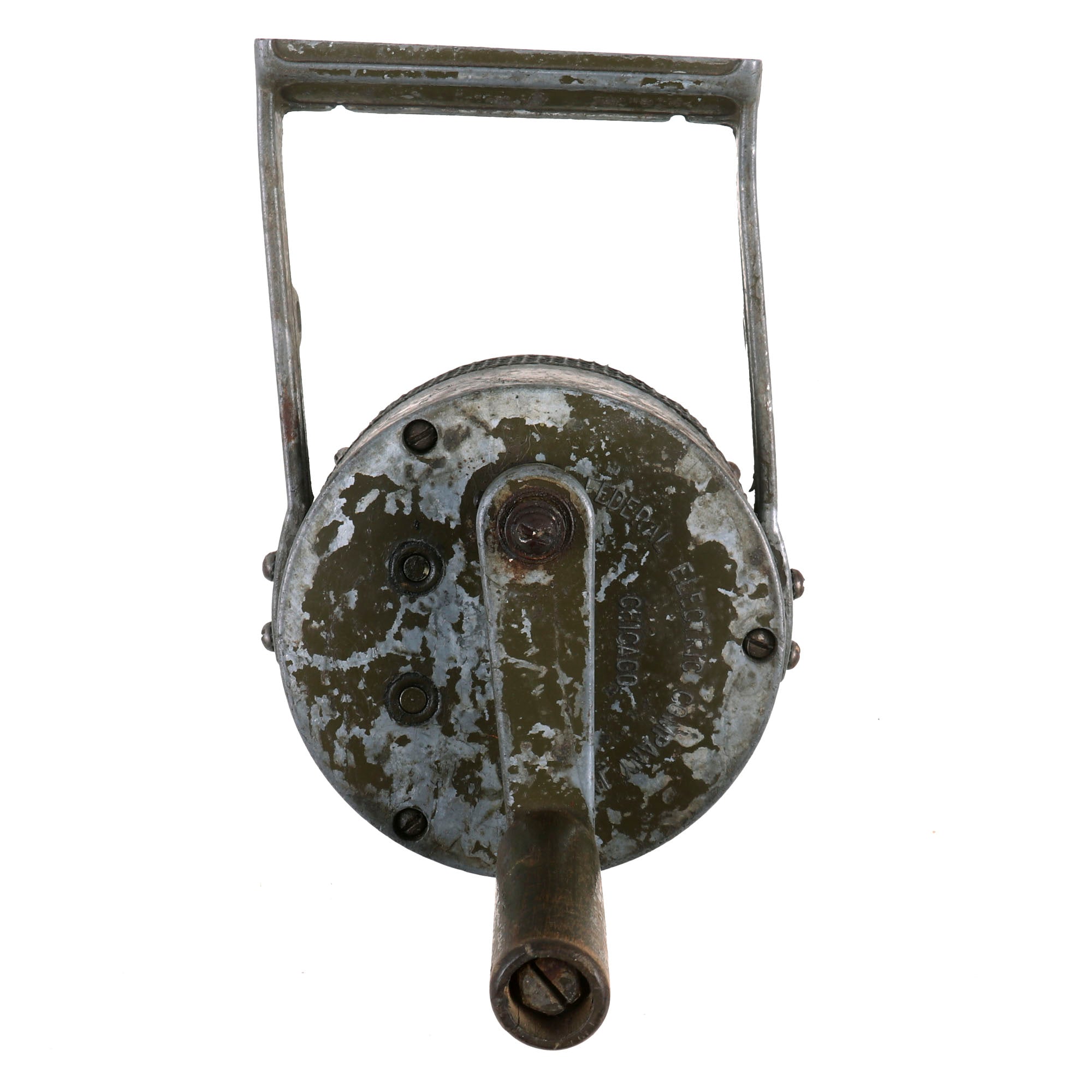 Constructed predominantly of aluminum with integral one piece carry handle and crank handle. These were originally painted OD green, however the paint does not stick to the aluminum very well as it oxidizes, so often these are missing a lot of the paint. This example still has some of the original paint on the back, while it is flaked away on most other areas. It still has the cover and side screen to protect the rotor, items that are often missing. The handle is also a bit loose.