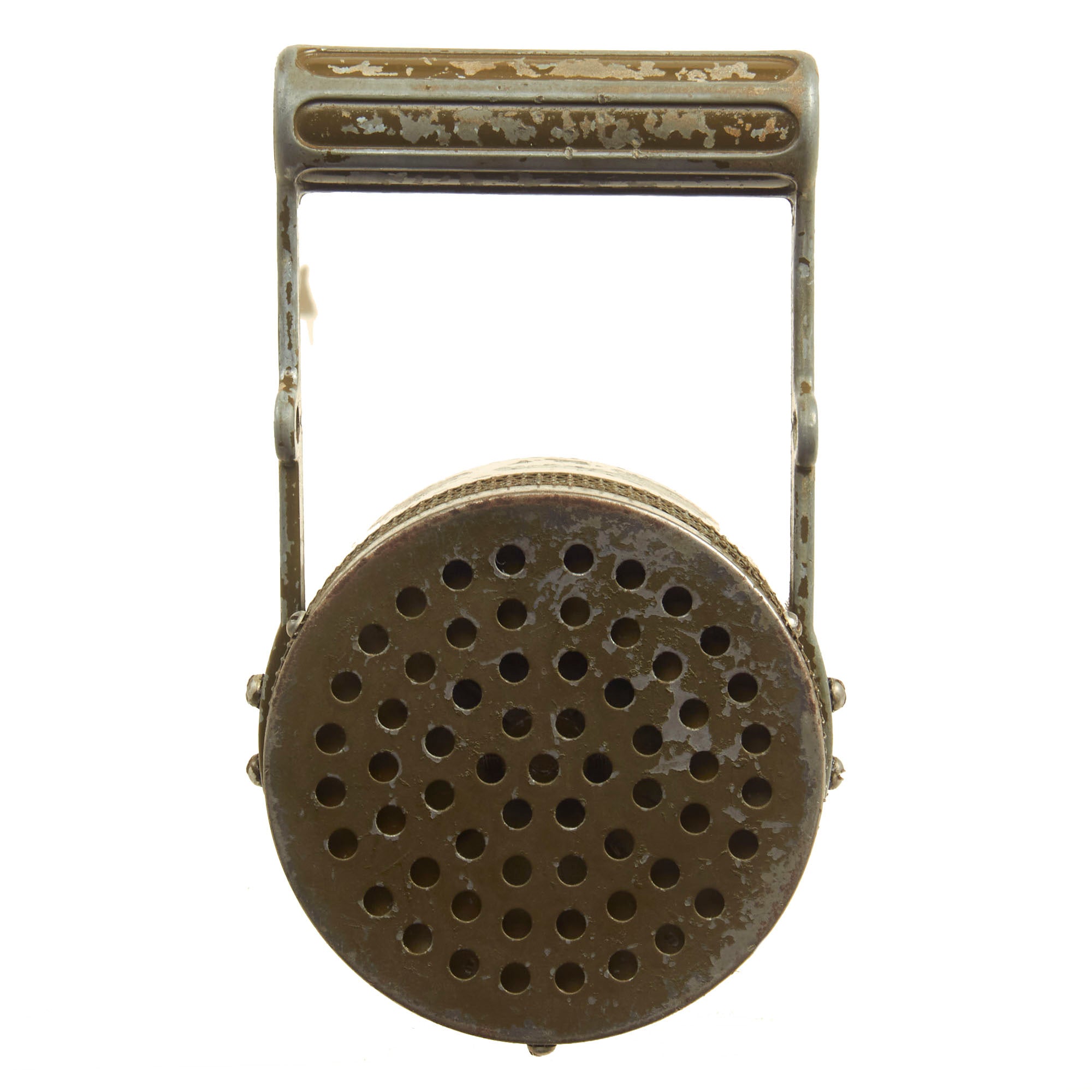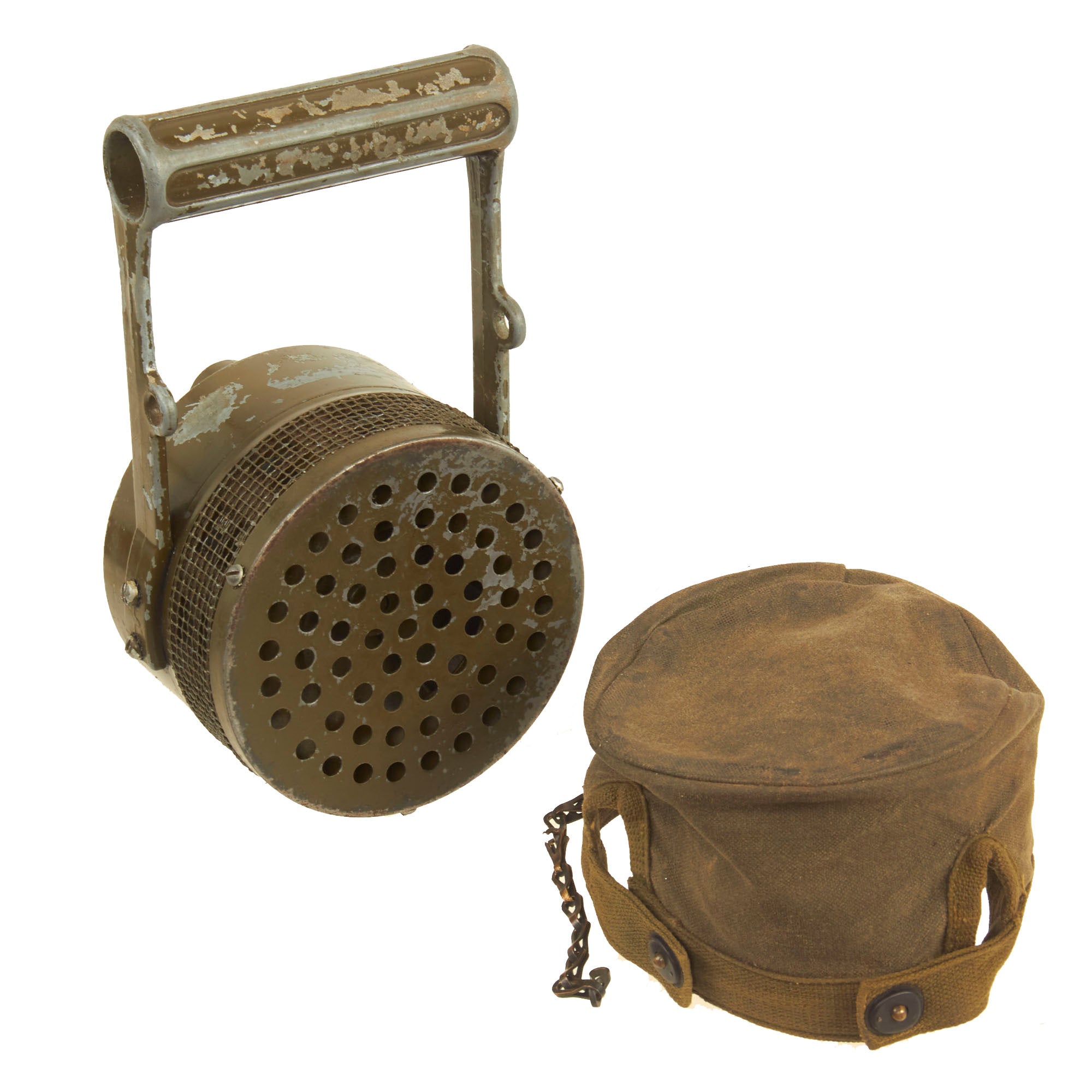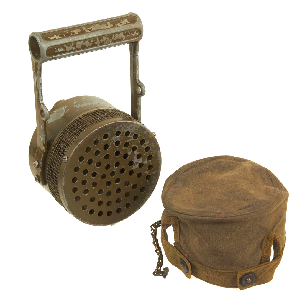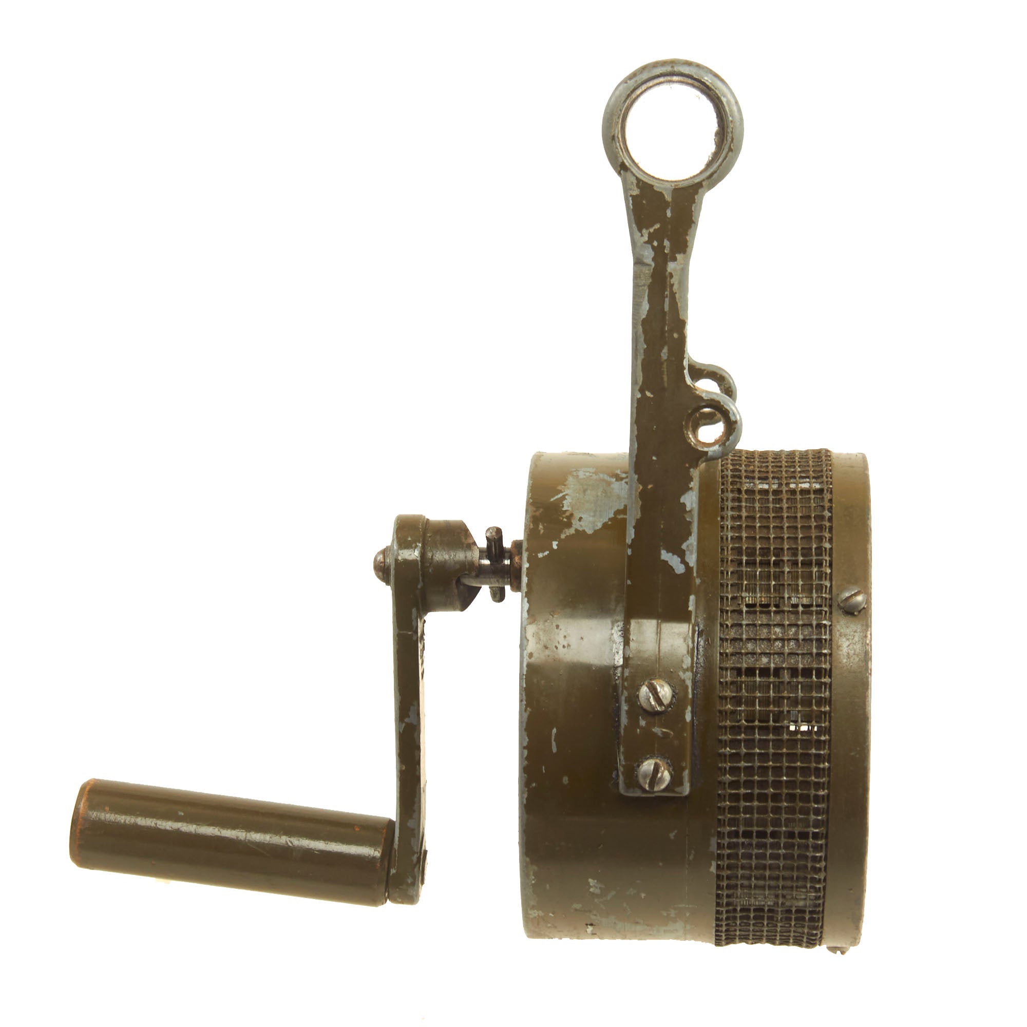 Original Item: Only One Available: This a very rare fully functional (and loud) U.S. WWII Hand Crank Air Raid Siren, complete with the original canvas cover and chain. These covers are almost always missing, and of the few examples we have had, most were without the cover. All that is missing is the sling.