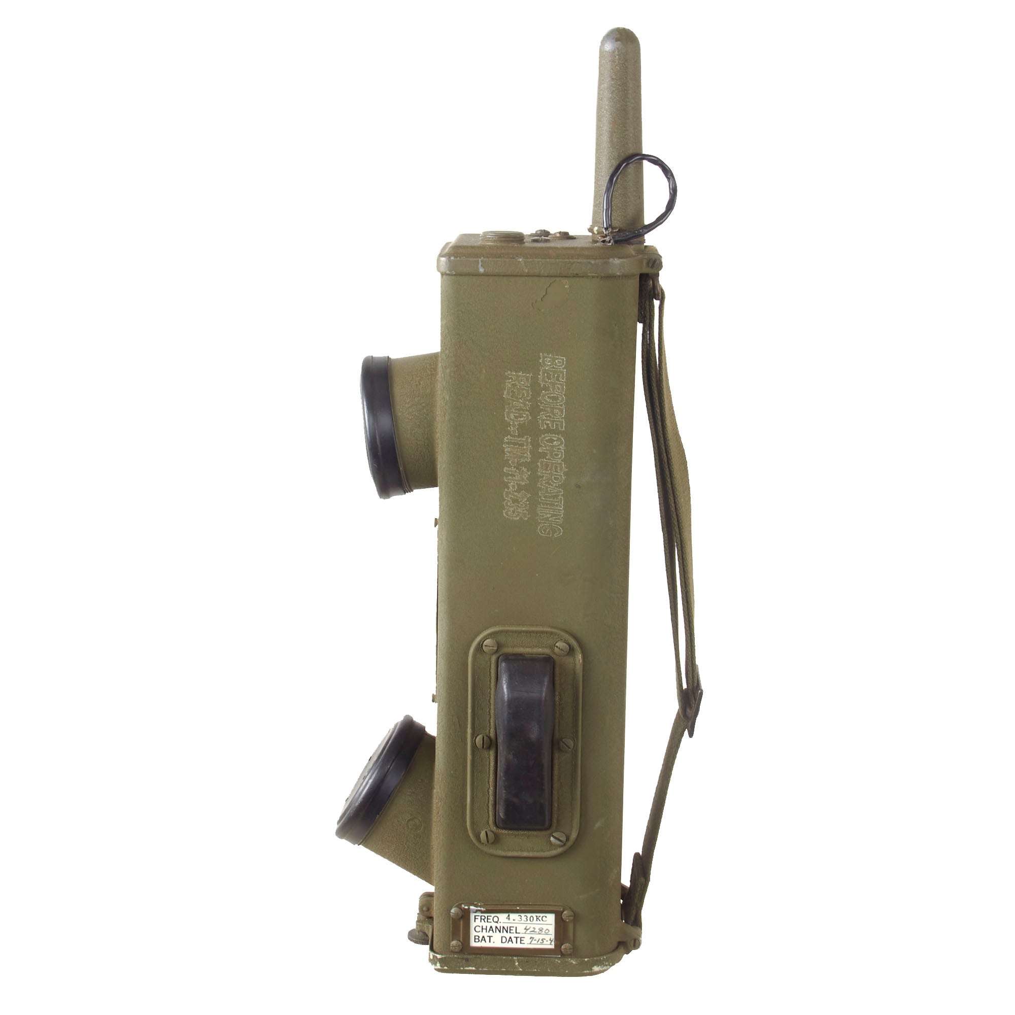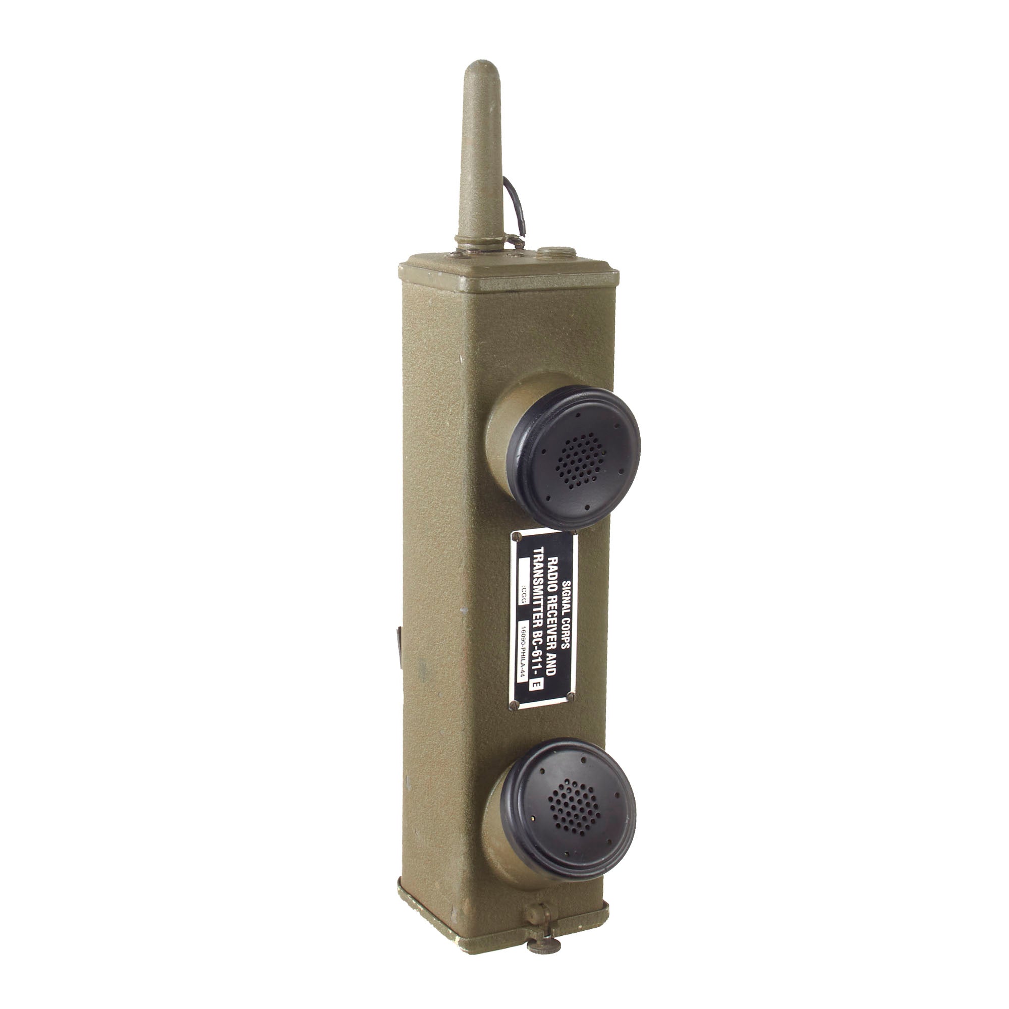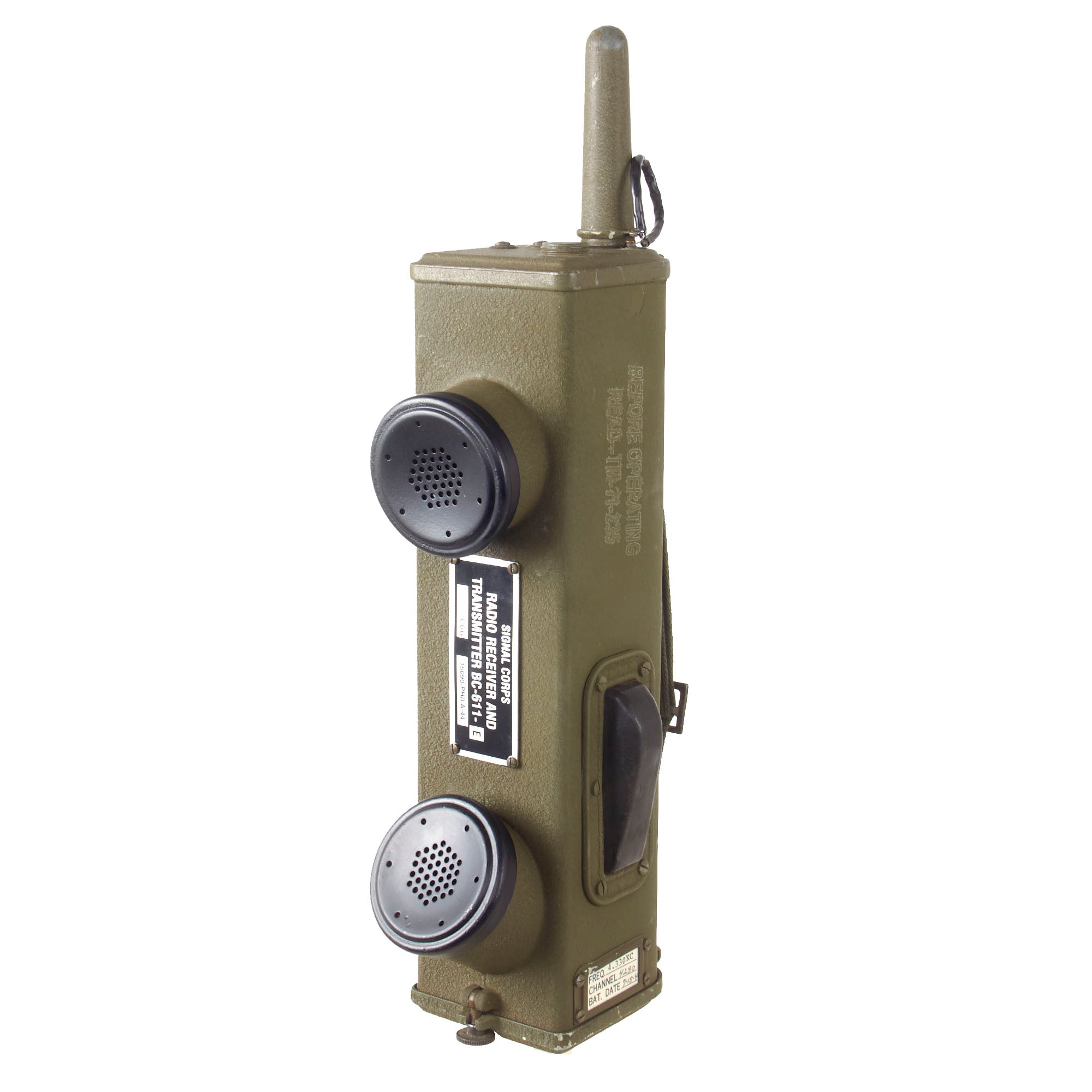 These are popularly referred to as walkie talkies, although they were originally designated as "handie talkies”. This example has a data plate on the side, but it is a reproduction.