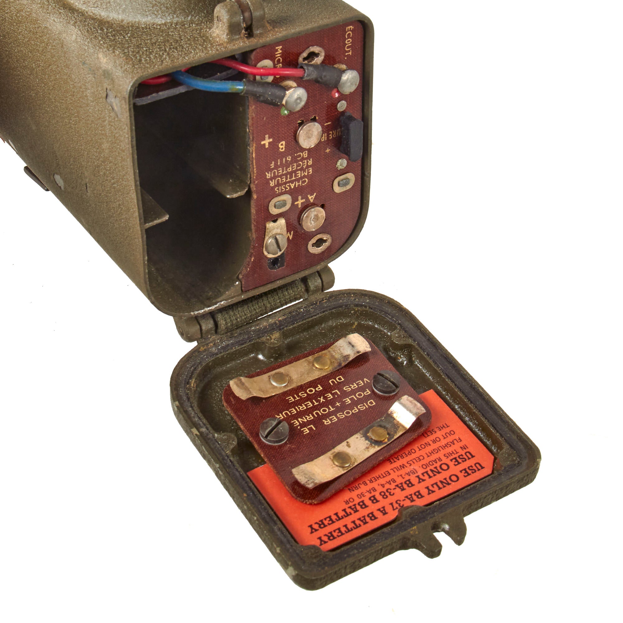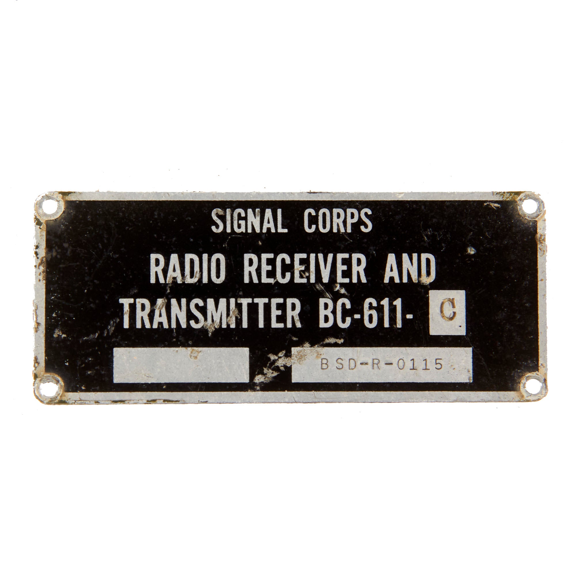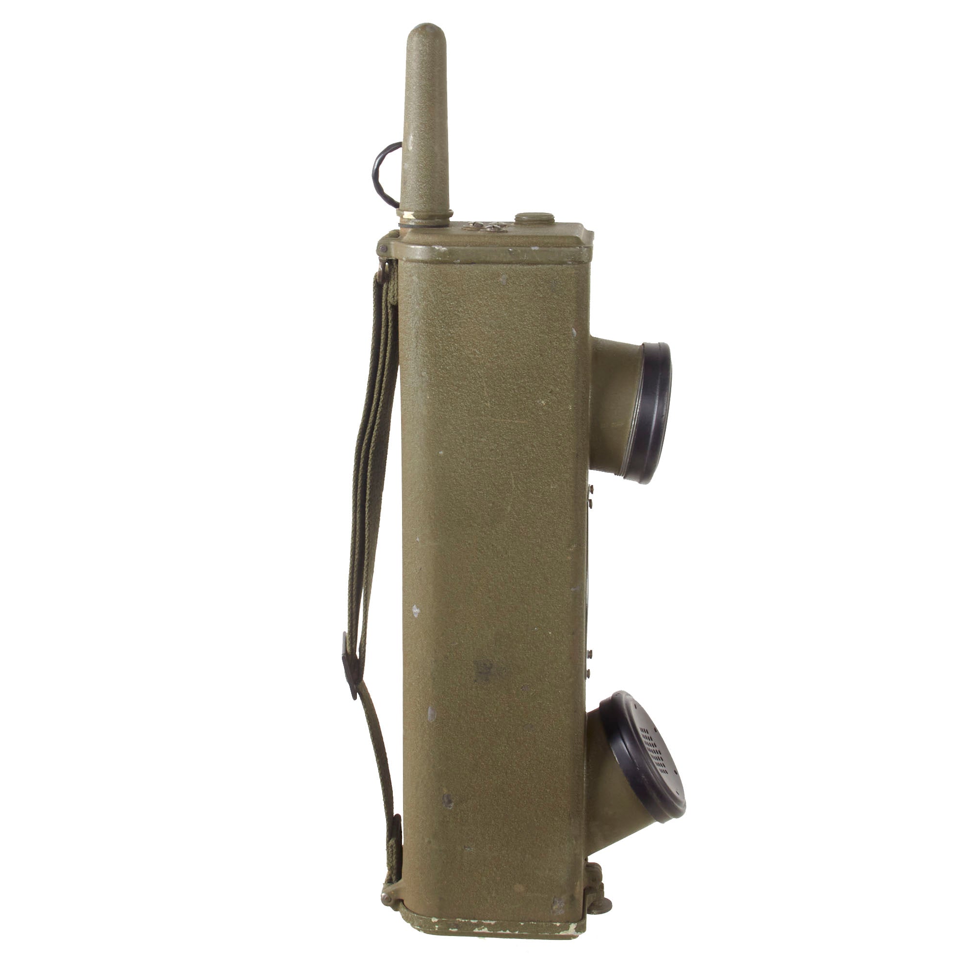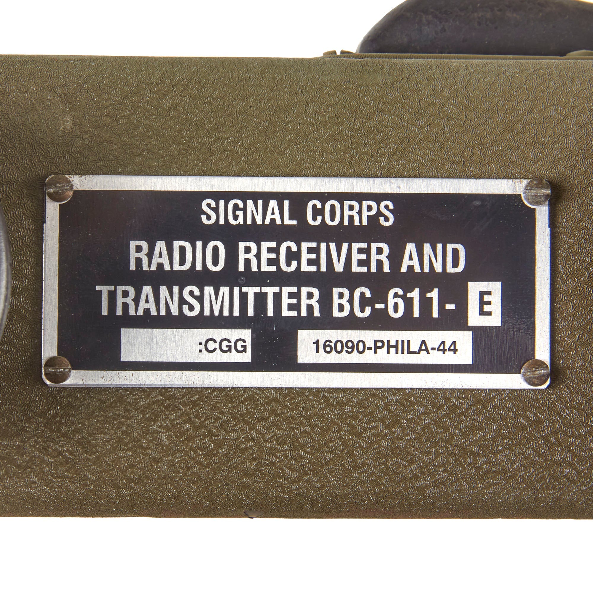 These are popularly referred to as walkie talkies, although they were originally designated as "handie talkies”. This example has a data plate on the side, but it is a reproduction.