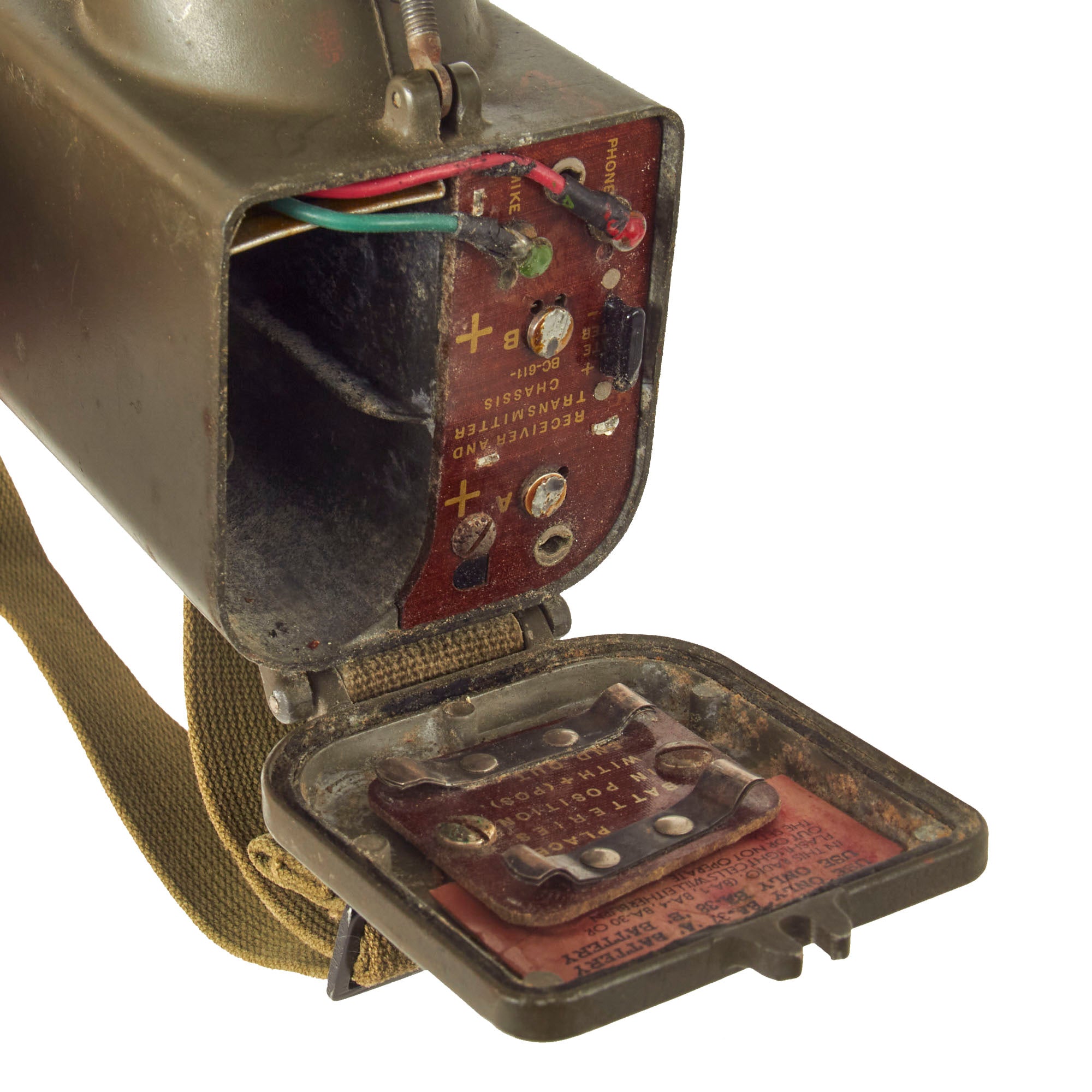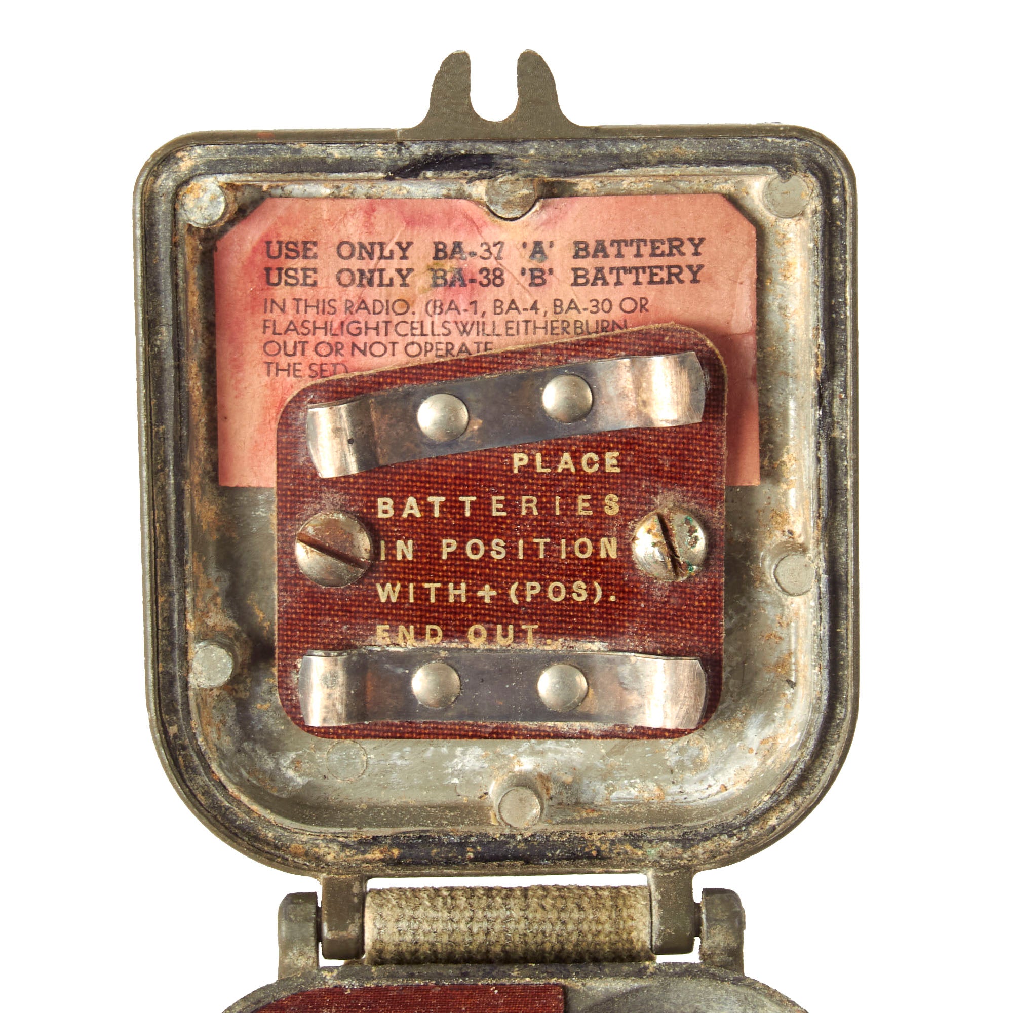The battery door opens, and the contacts appear to be in good condition. The radio also still has the complete antenna with cover, and looks ready for use. This is a really choice example from WWII!