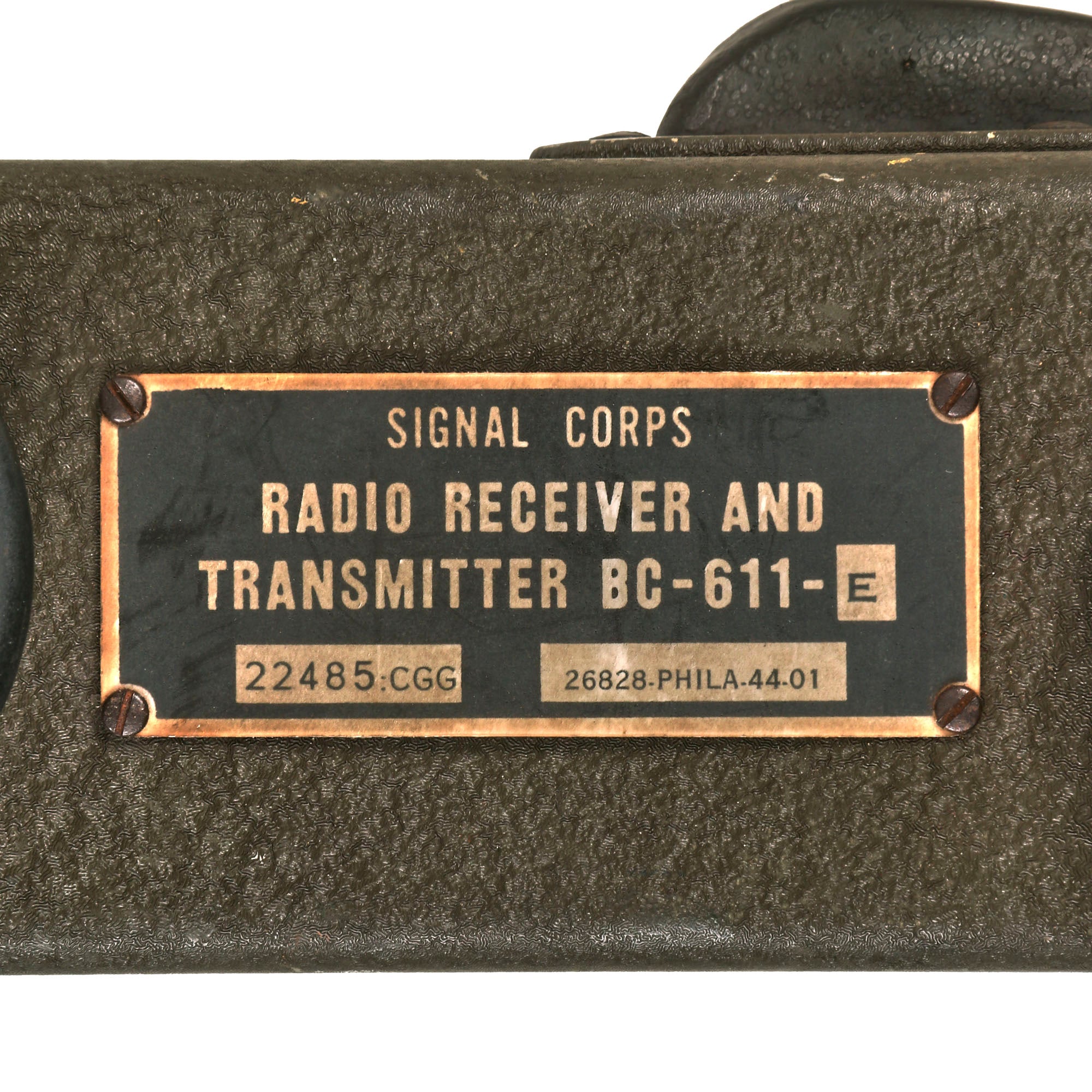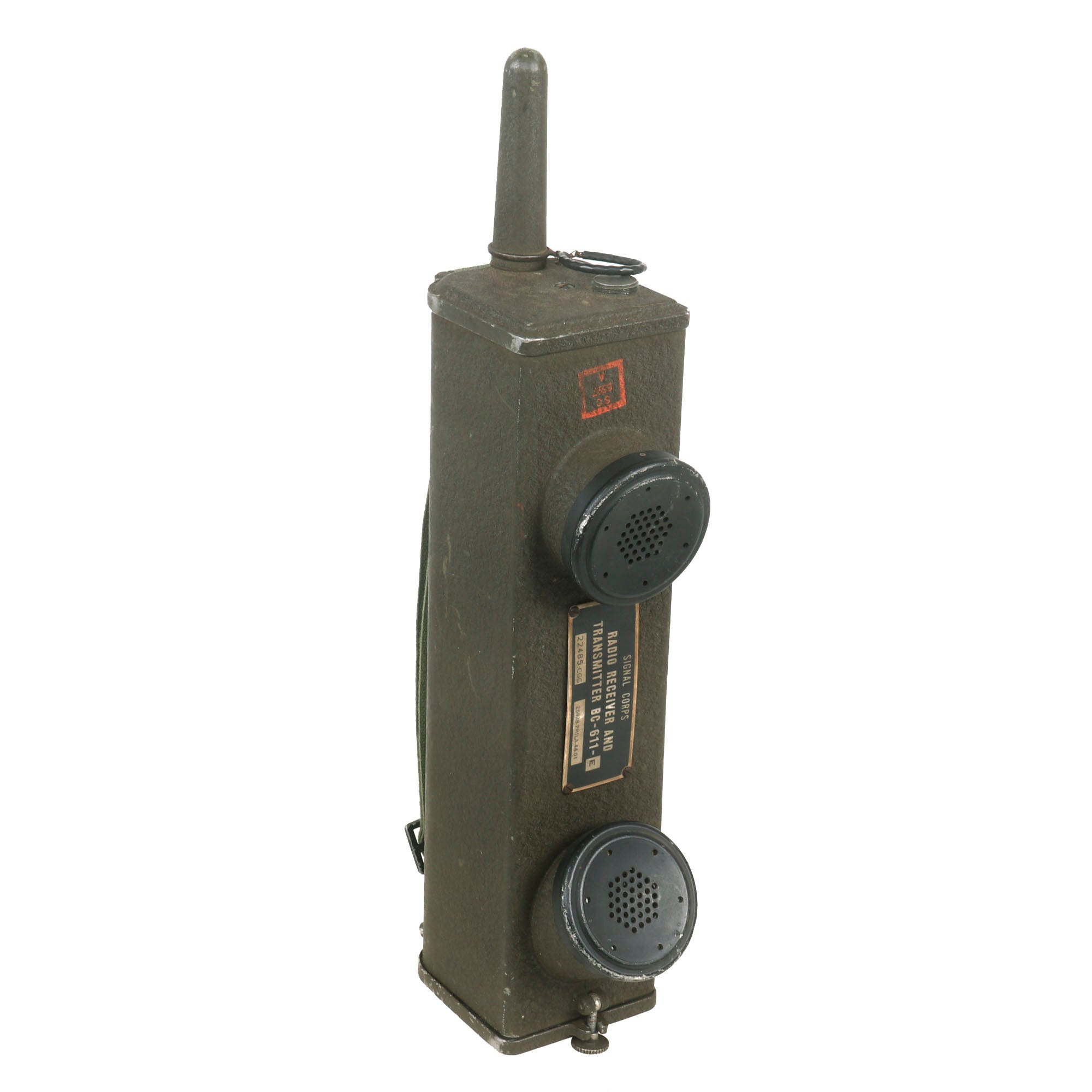 These are popularly referred to as walkie talkies, although they were originally designated as "handie talkies”. This fine example still has the original data plate on the side:
