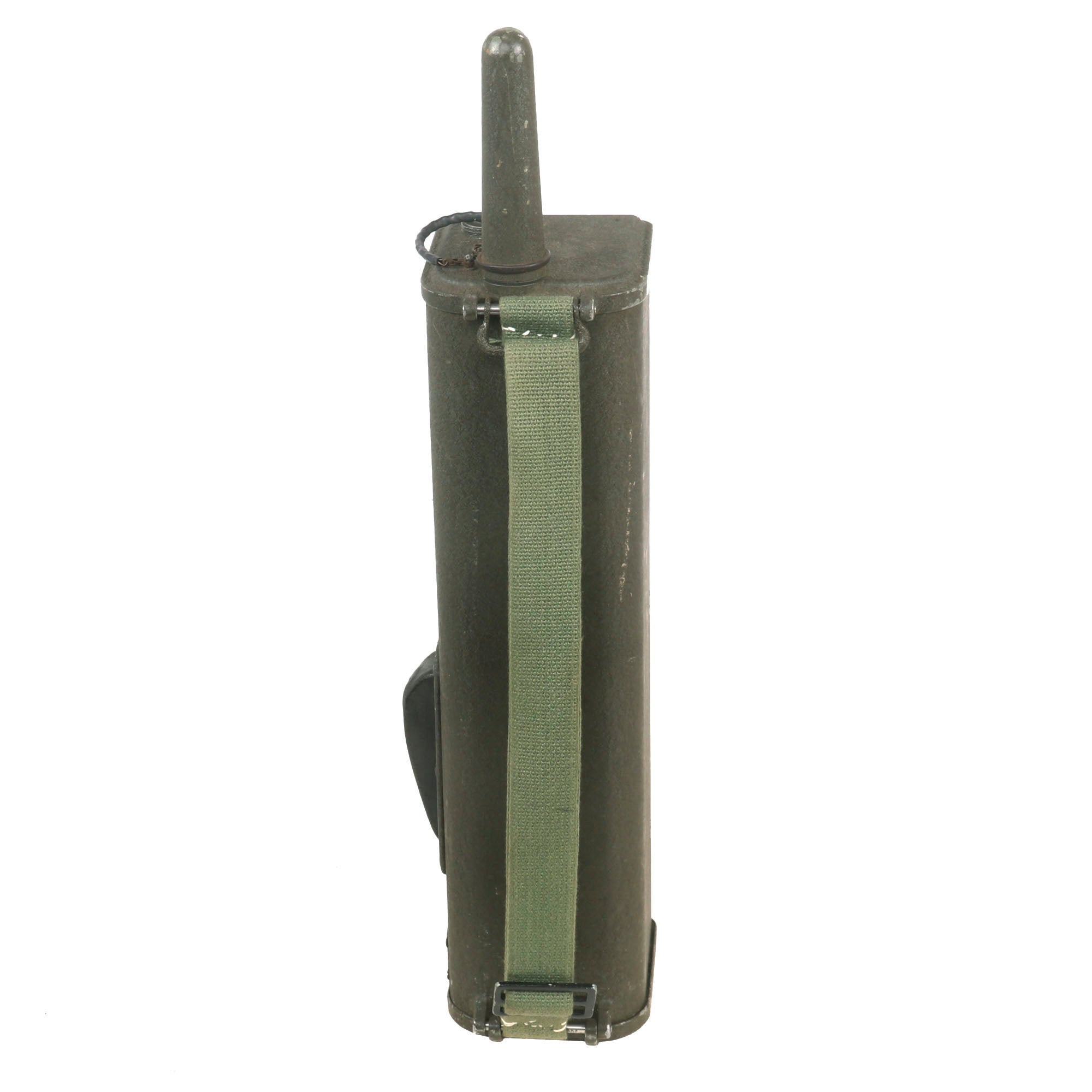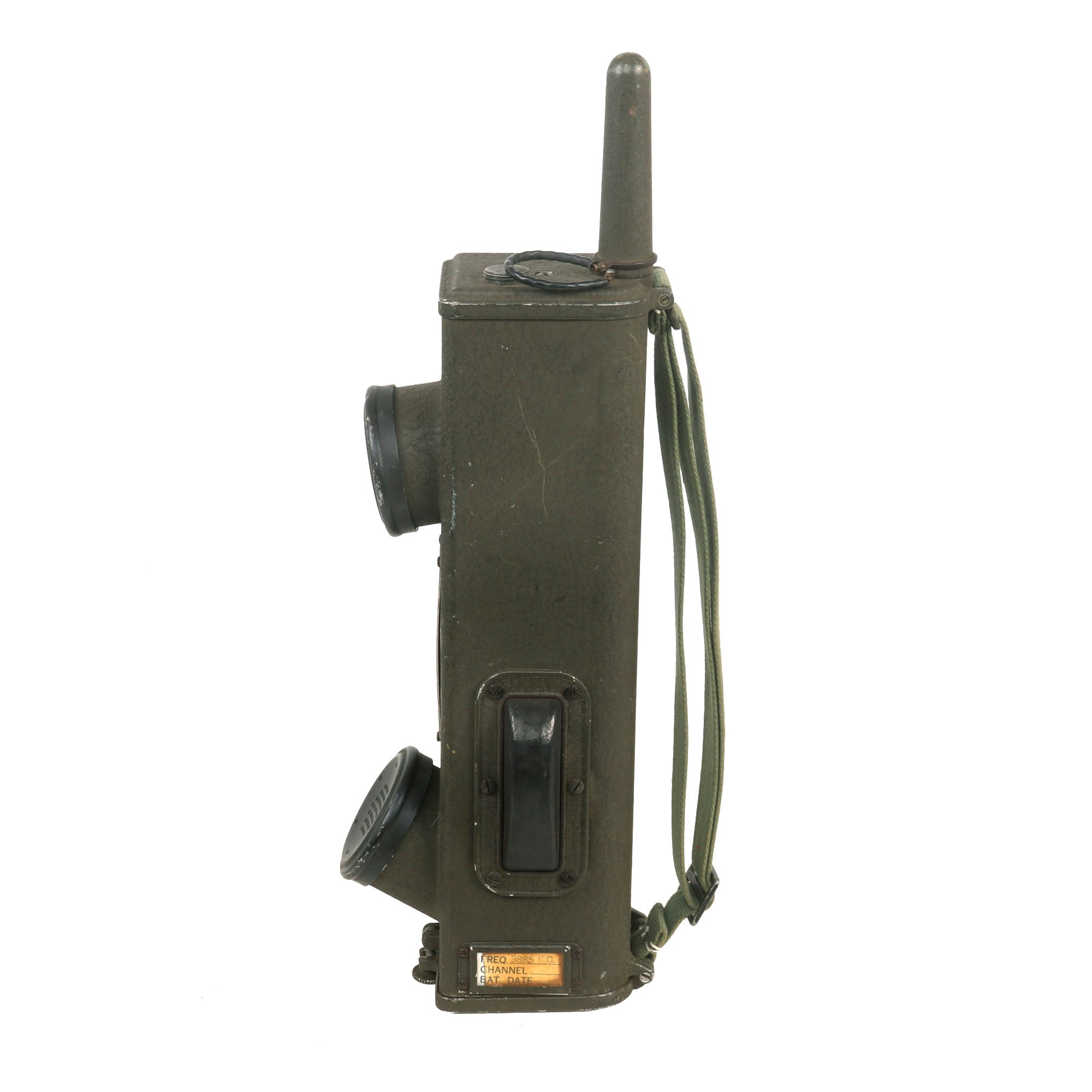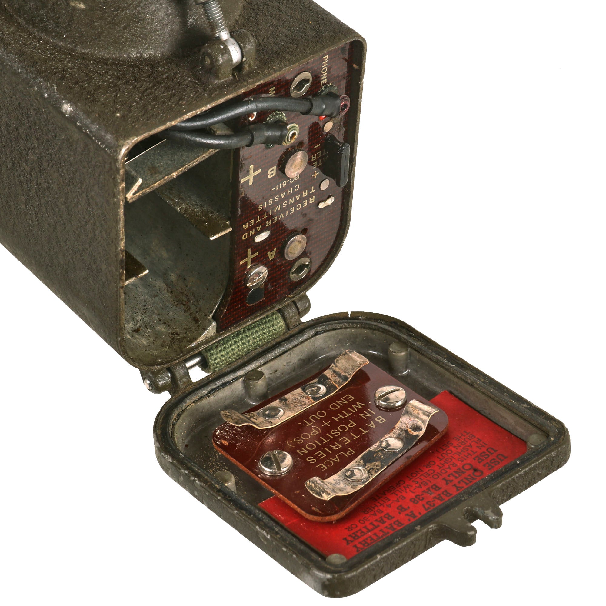 The battery door opens, and the contacts appear to be in fair condition. It also still has its complete extendable antennas with removable cover. The sling is complete, and in good condition. The rubber button cover is worn. Overall this is a great Handie Talkie radio, ready to add to your collection, or to use in reenactments.