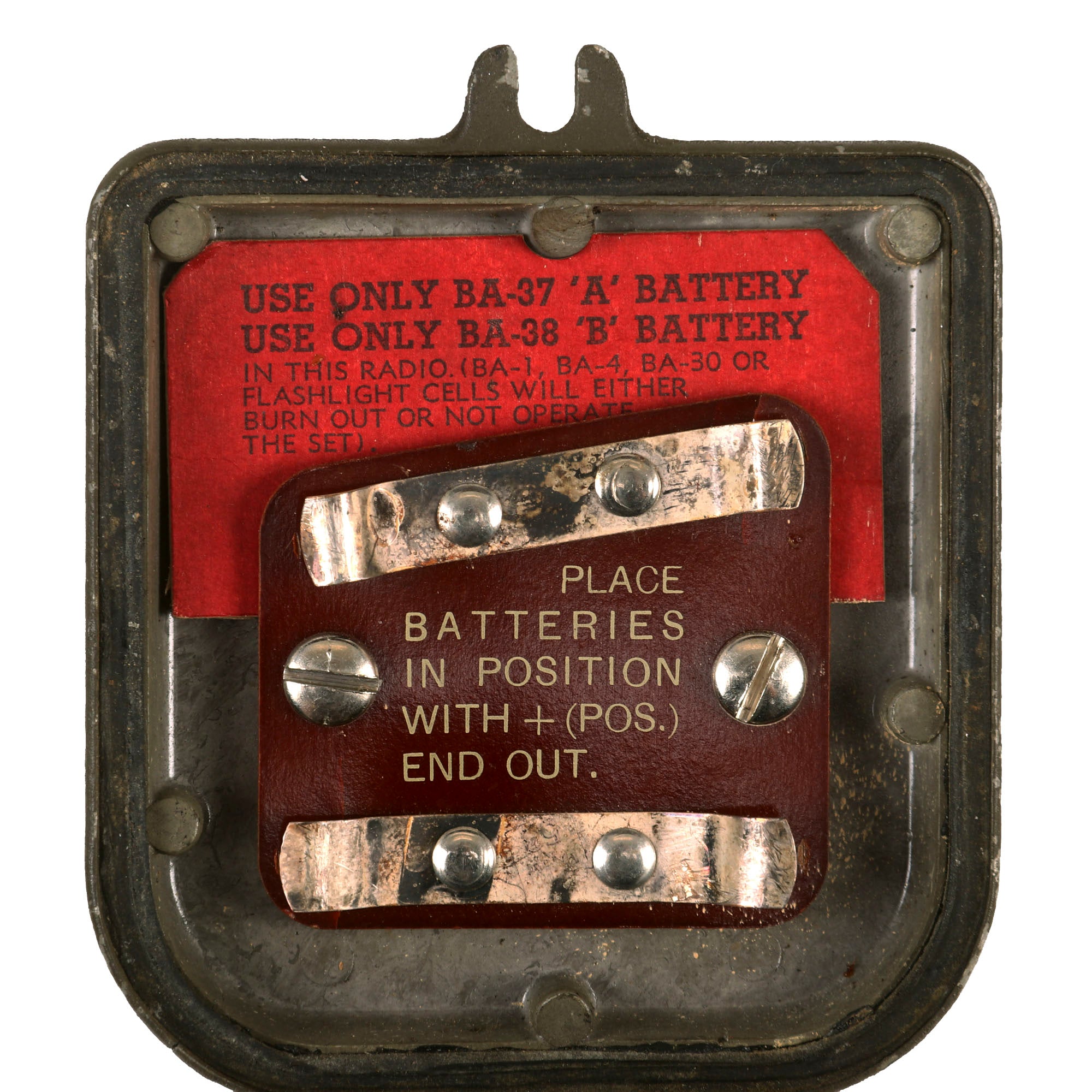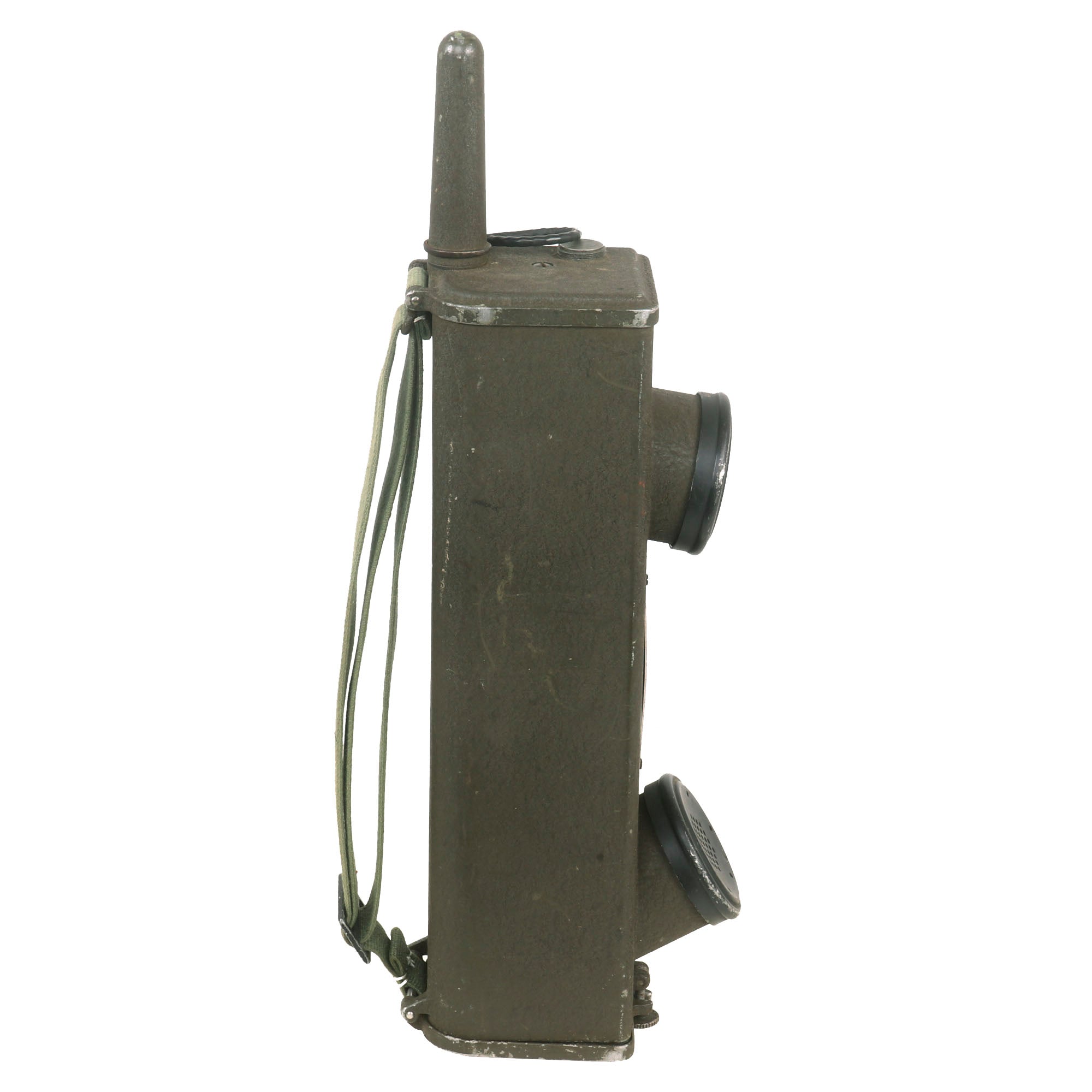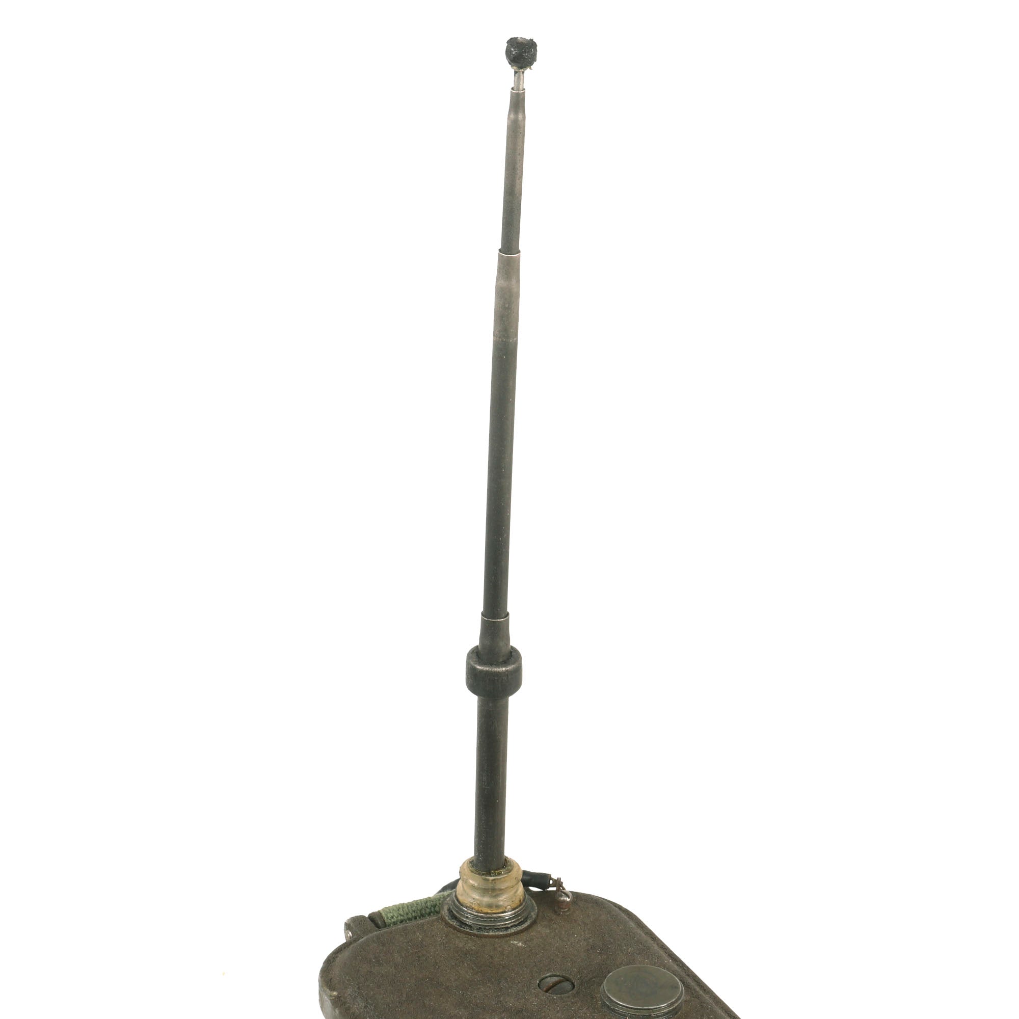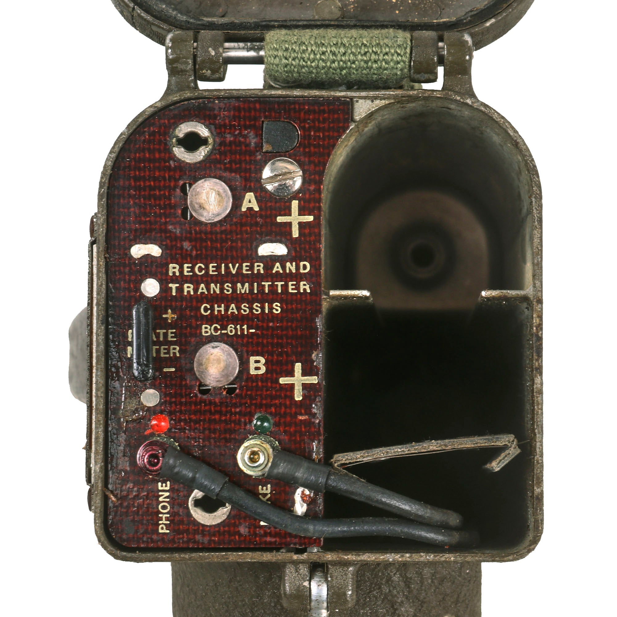 The battery door opens, and the contacts appear to be in fair condition. It also still has its complete extendable antennas with removable cover. The sling is complete, and in good condition. The rubber button cover is worn. Overall this is a great Handie Talkie radio, ready to add to your collection, or to use in reenactments.