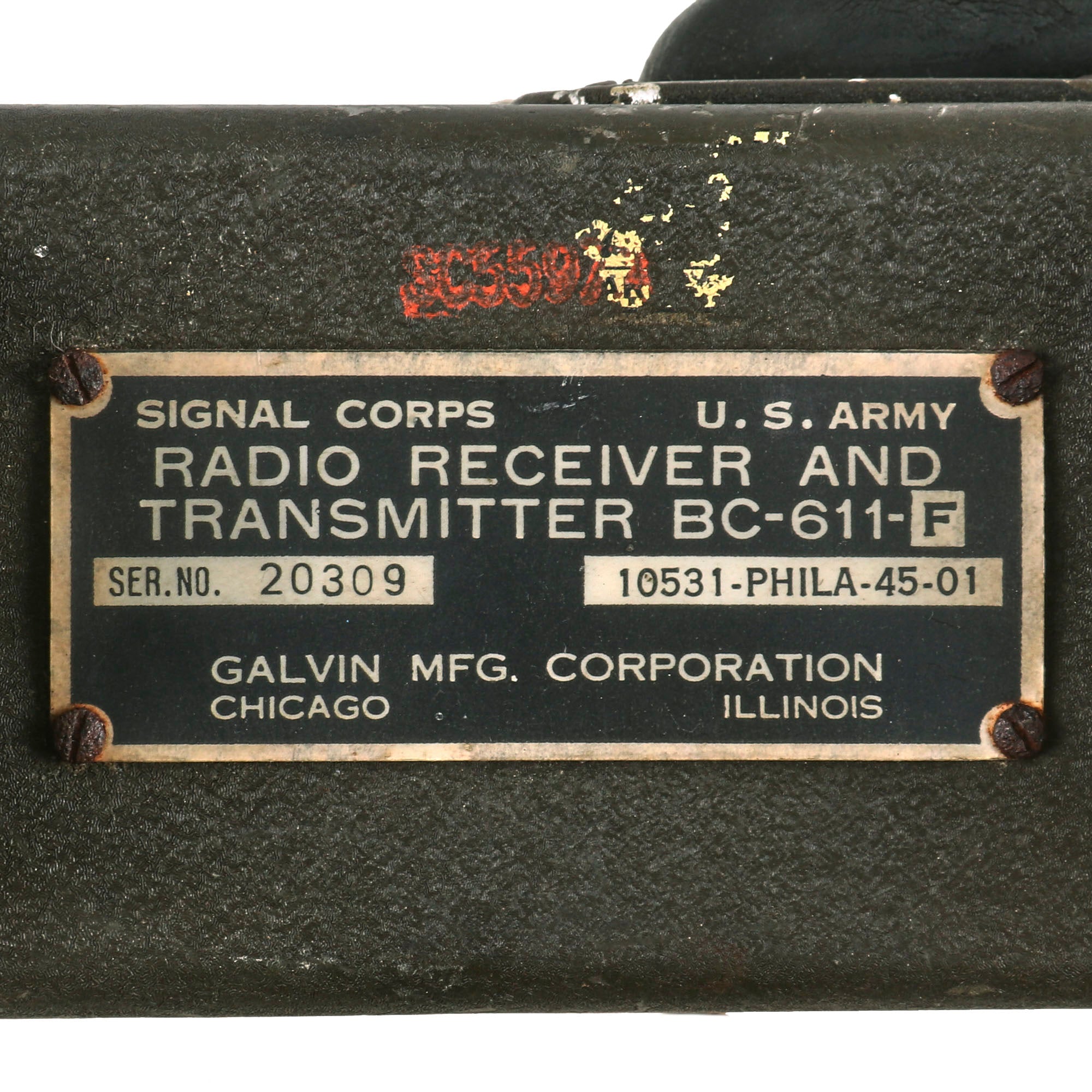 These are popularly referred to as walkie talkies, although they were originally designated as "handie talkies”. This fine example still has the original data plate on the side: