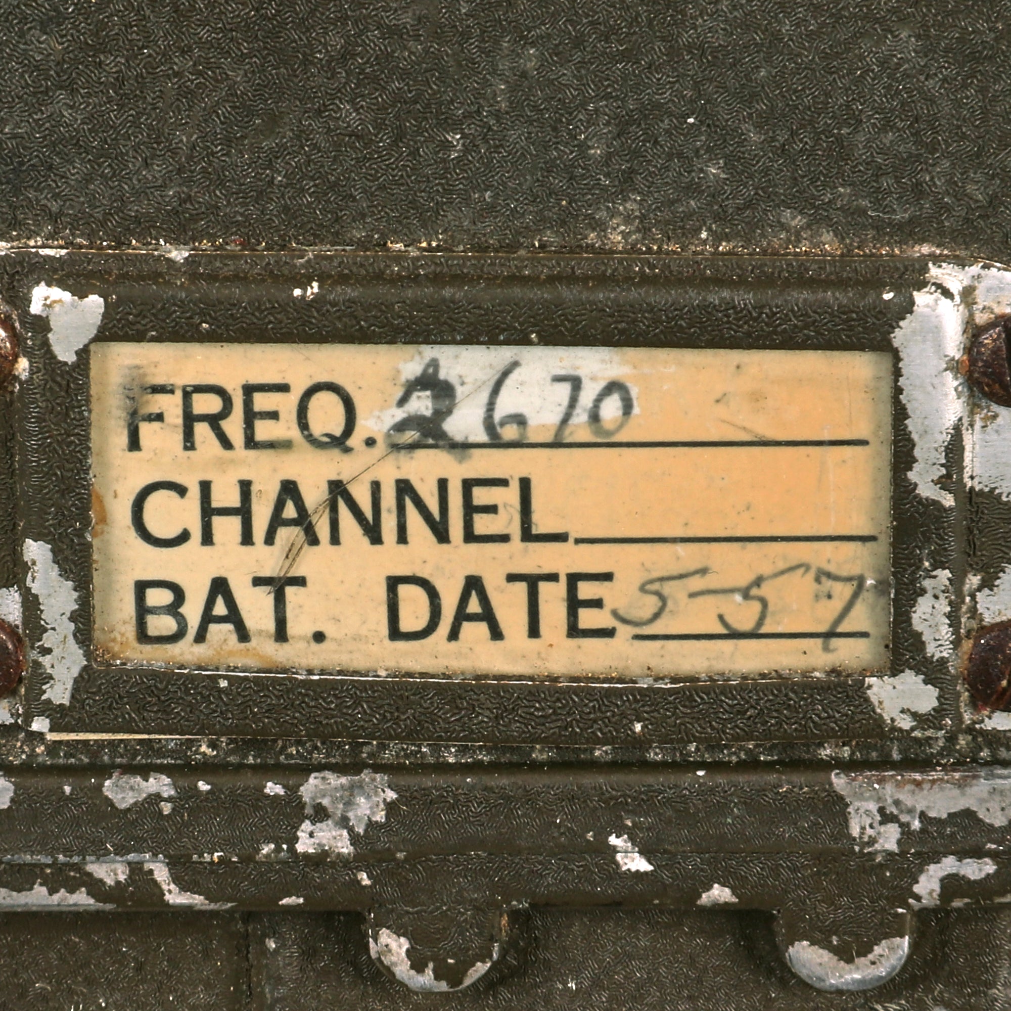 The battery door opens, and the contacts appear to be in fair condition. It also still has its complete extendable antennas with removable cover. The sling is complete, and in good condition. The rubber button cover is heavily worn. Overall this is a great Handie Talkie radio, ready to add to your collection, or to use in reenactments. There is a tag in the bottom slot giving a battery date of 5-57, meaning this example saw use during and well-after World War II.