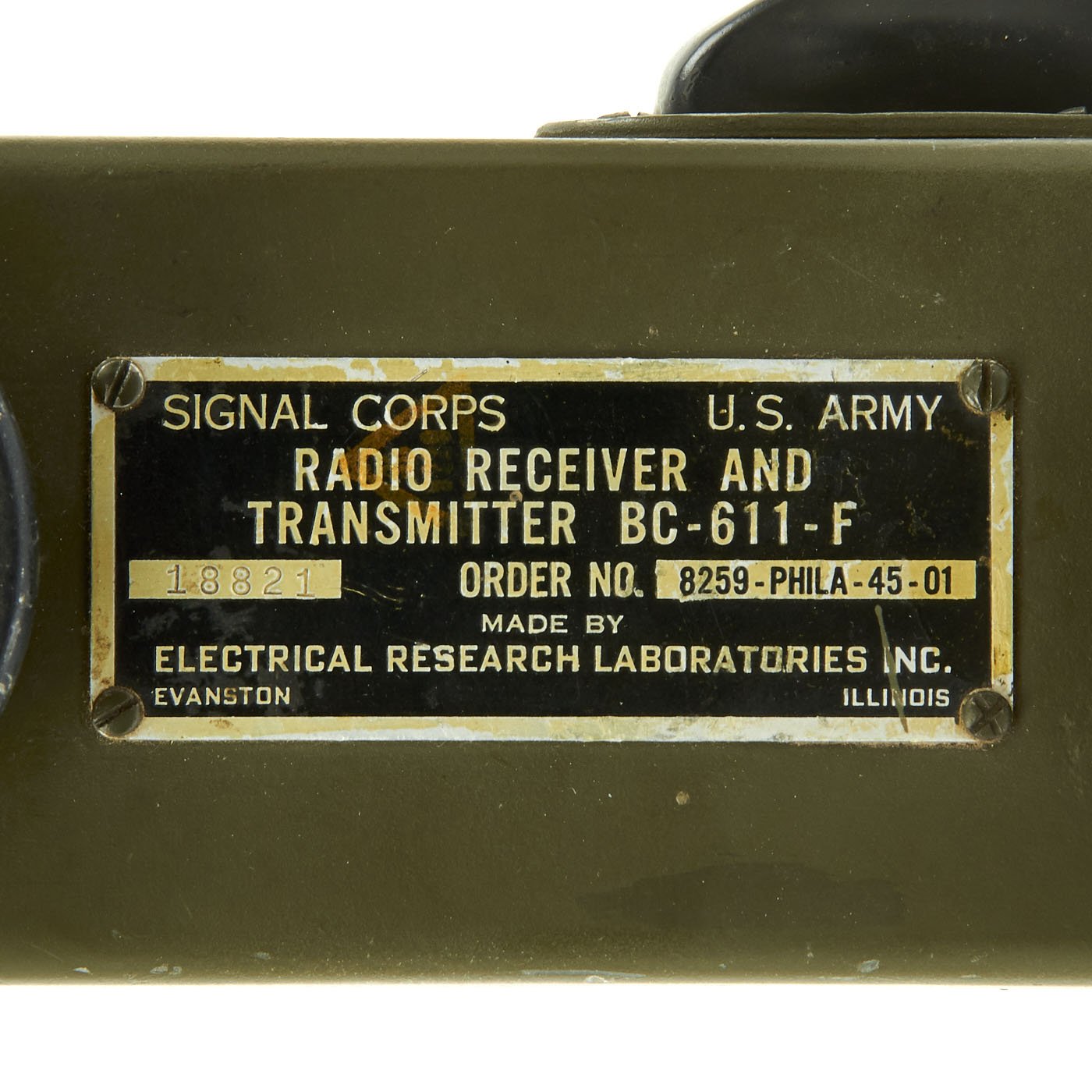 Original Items: Only One Available. This genuine WW2 issue BC-611-F hand-held radio is offered in very good condition. It has not been tested for functionality but appears complete and undamaged. The BC-611 was a hand-held radio transceiver used by the US Army Signal Corps in World War II. Under the Army Nomenclature System, the BC-611 transceiver was the core component of the SCR-536 Signal Corps Radio set. The Signal Corps technical manual number was TM 11-235.