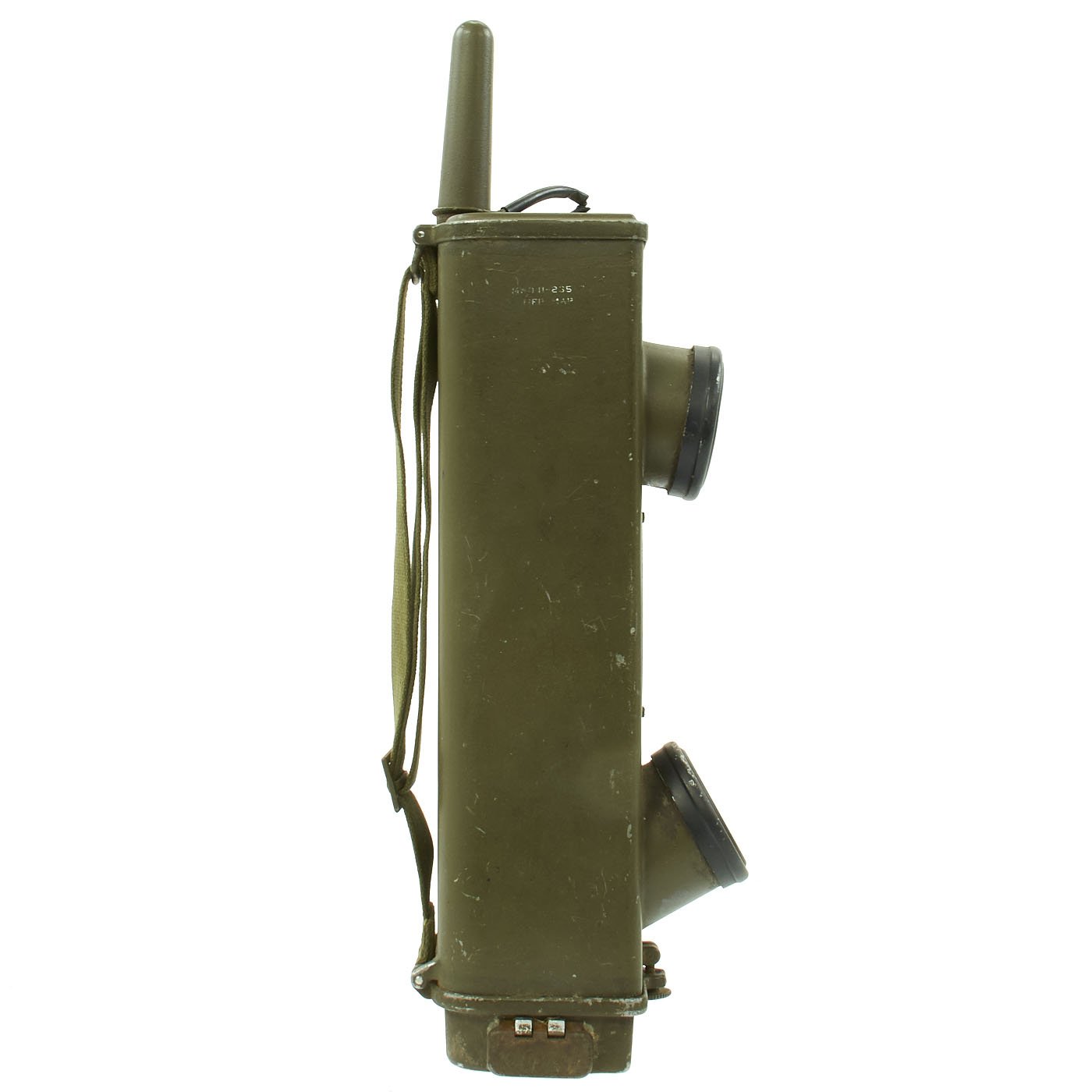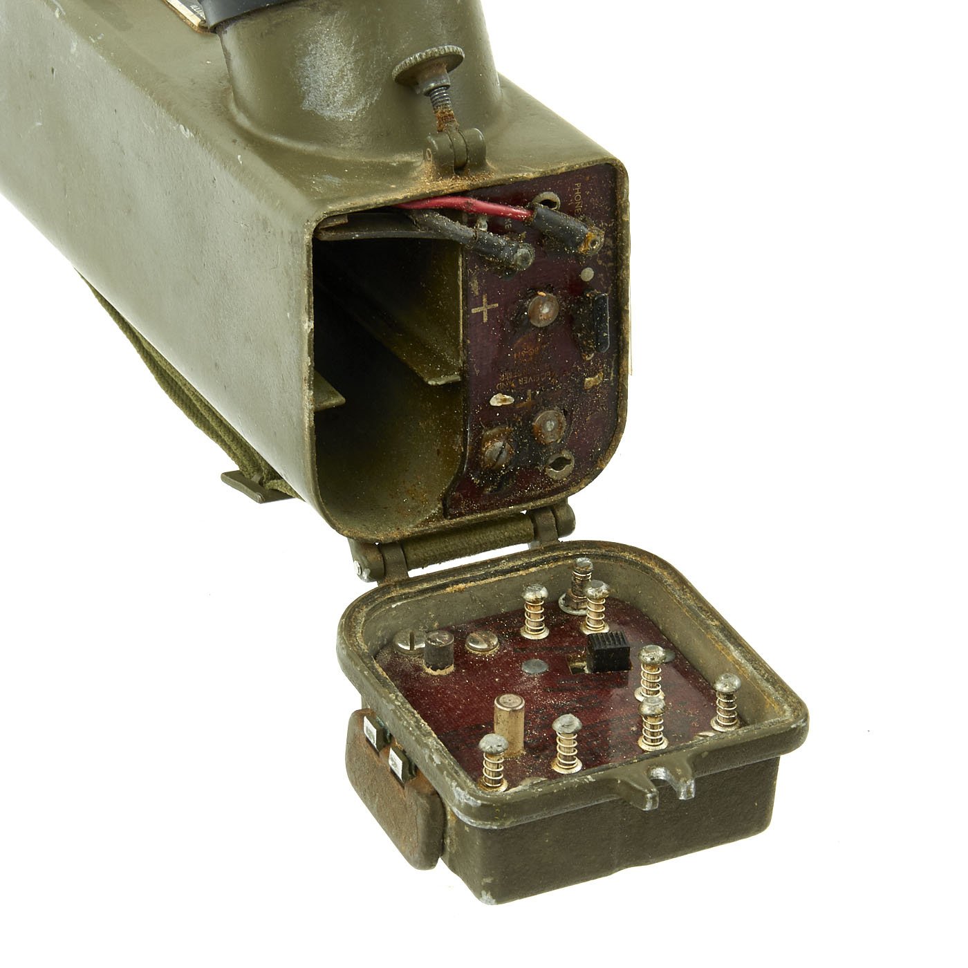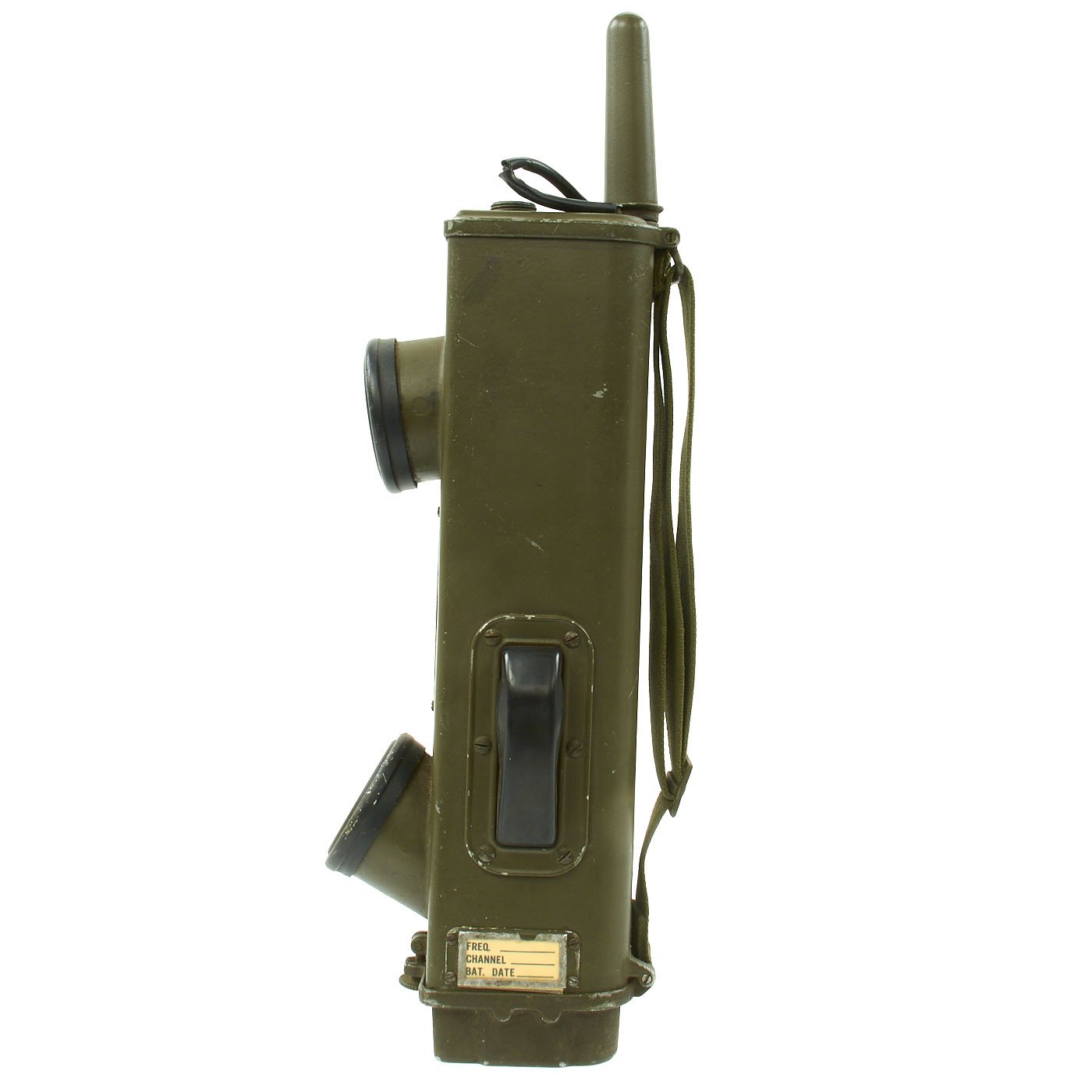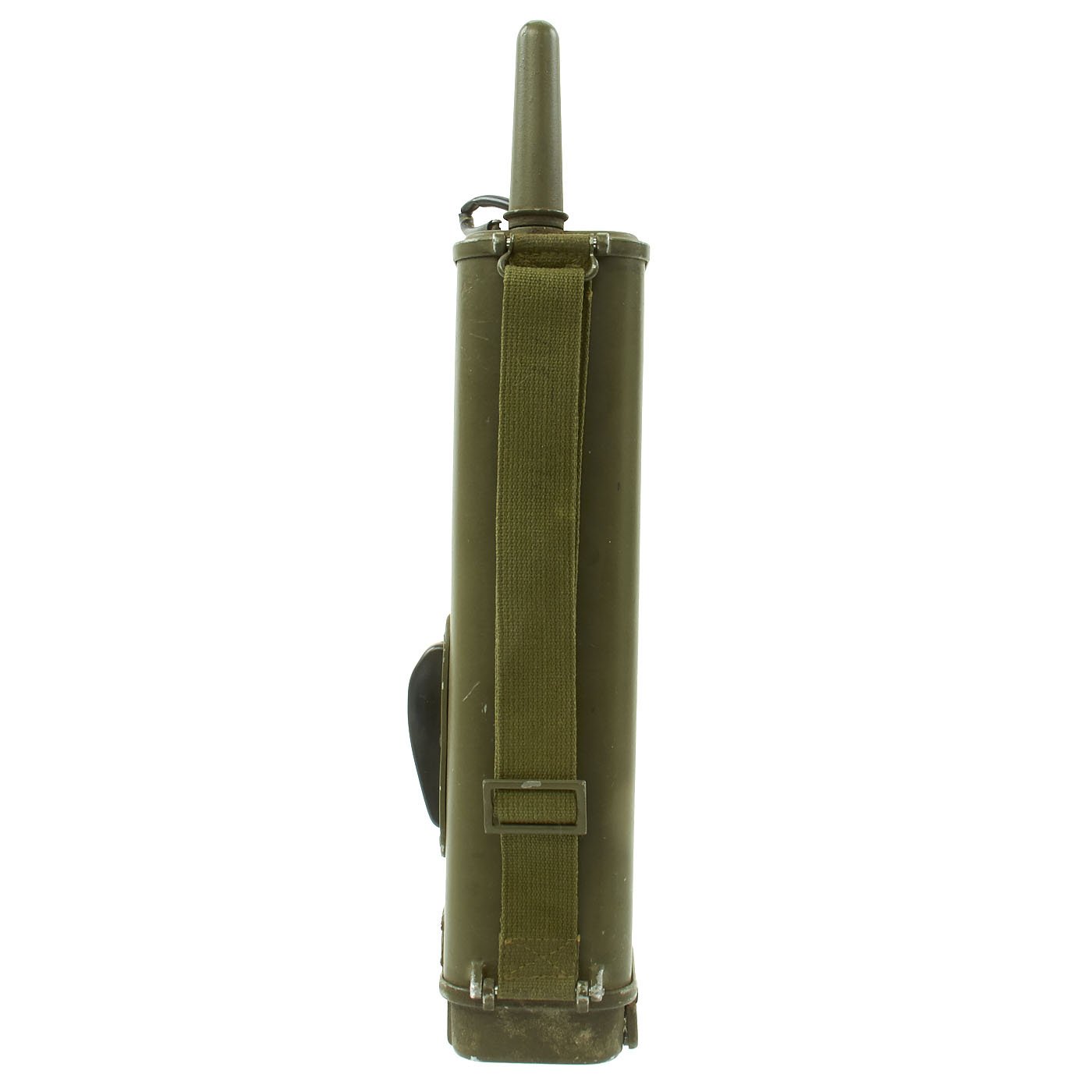 The battery door opens, and the contacts appear to be in good condition. It also still has its complete extendable antennas with removable cover. The sling is complete, and in good condition. Overall this is a great Handie Talkie radio, ready to add to your collection, or to use in reenactments.