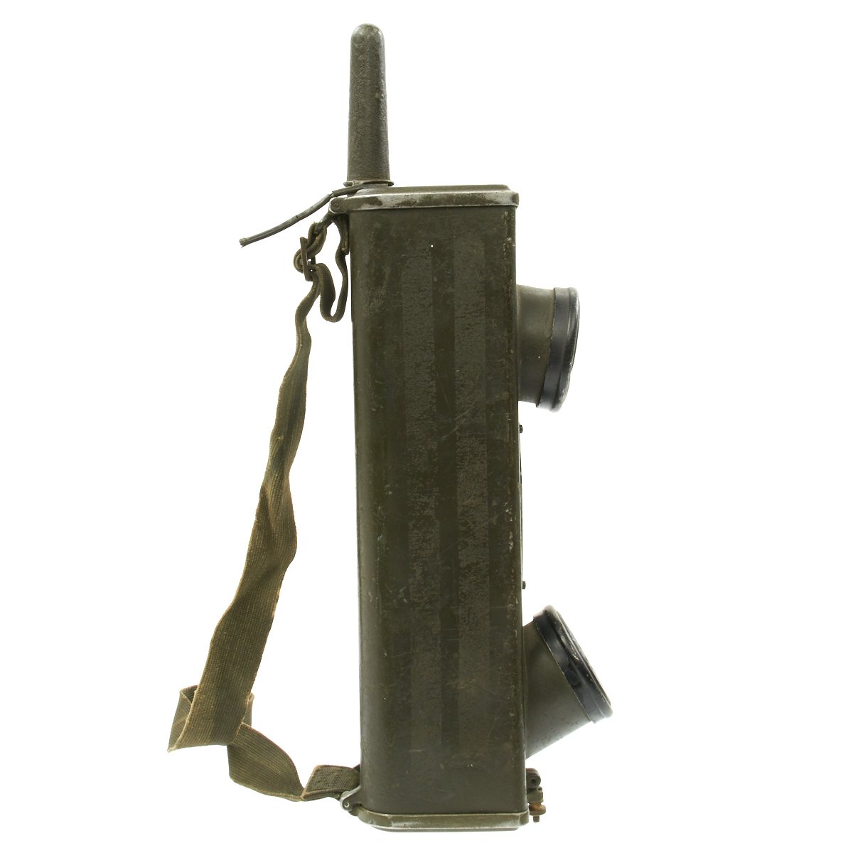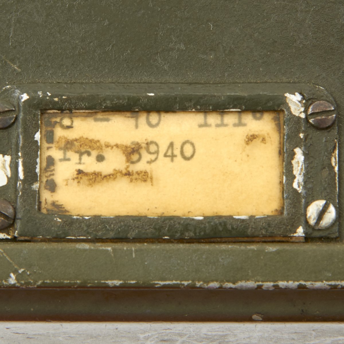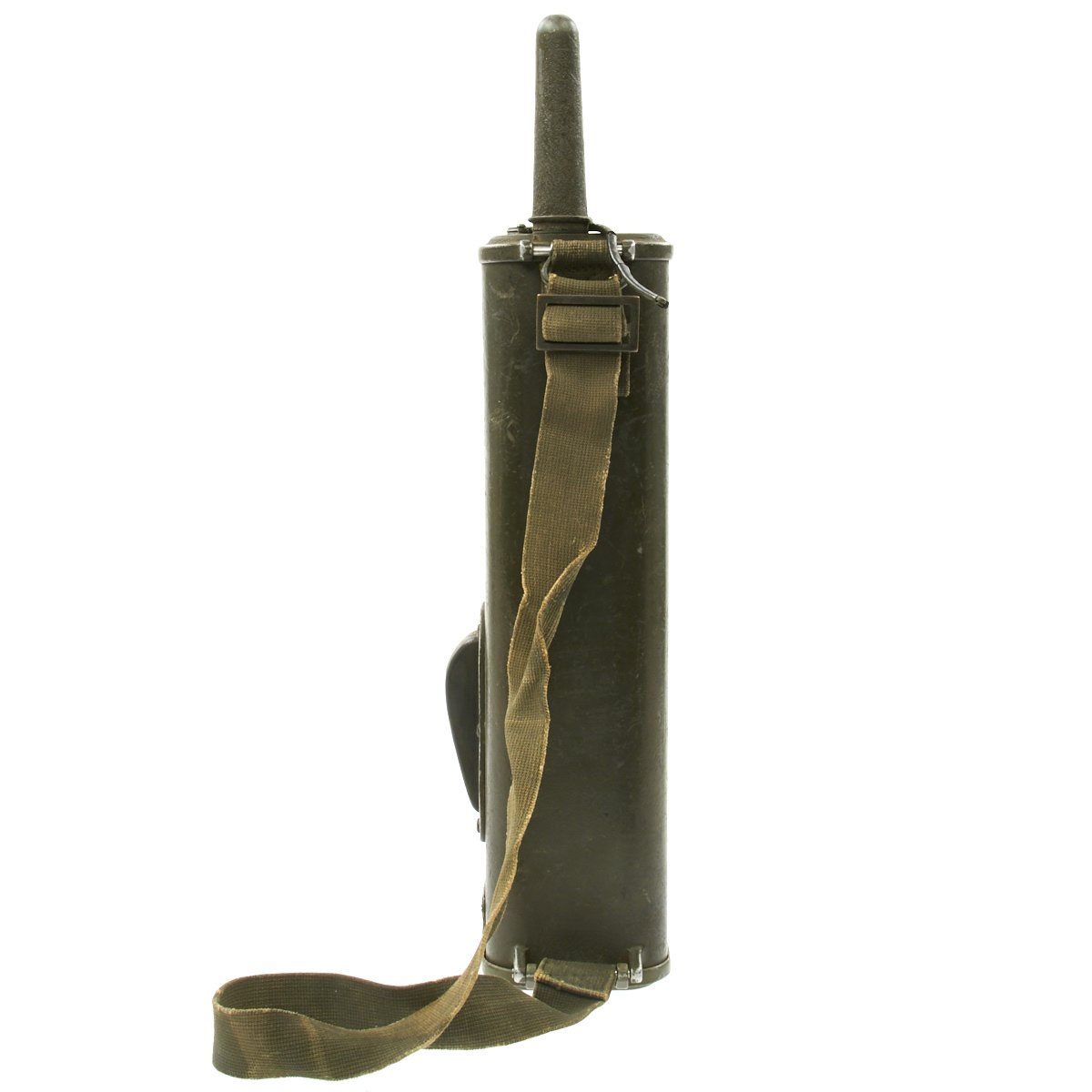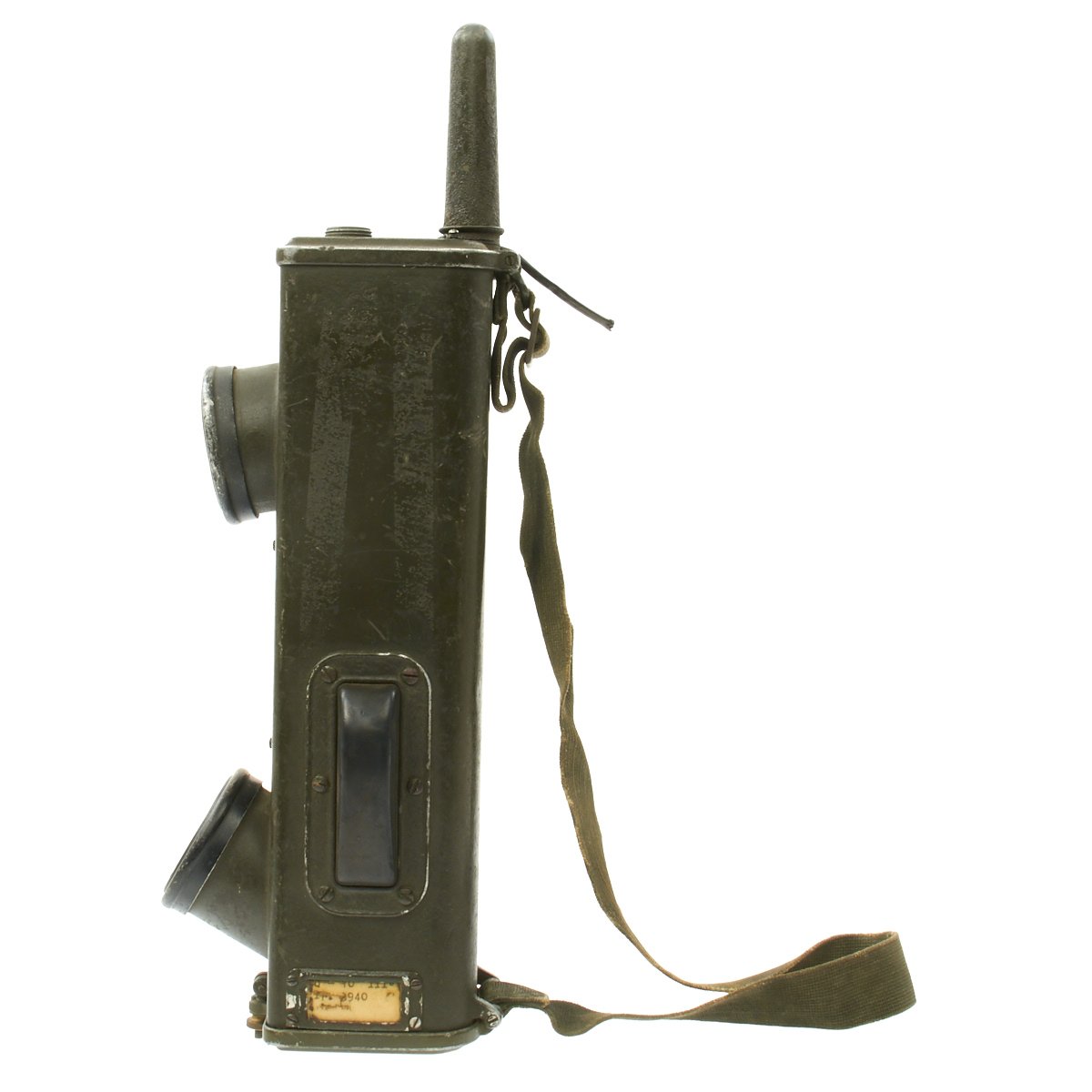 The battery door opens, and the contacts appear to be in good condition. It also still has its complete extendable antenna with removable cover, though the securing chain is detached. The plastic base fitting of the antenna is cracked off as well, but could easily be glued back in place. The sling is complete, and in good condition, with a bit of fraying. There is overall wear to the paint, and it does appear to have been repainted once. It also has a frequency tag by the send switch, indicating Fr. 3940. Overall this is a great Handie Talkie radio, ready to add to your collection, or to use in reenactments.
